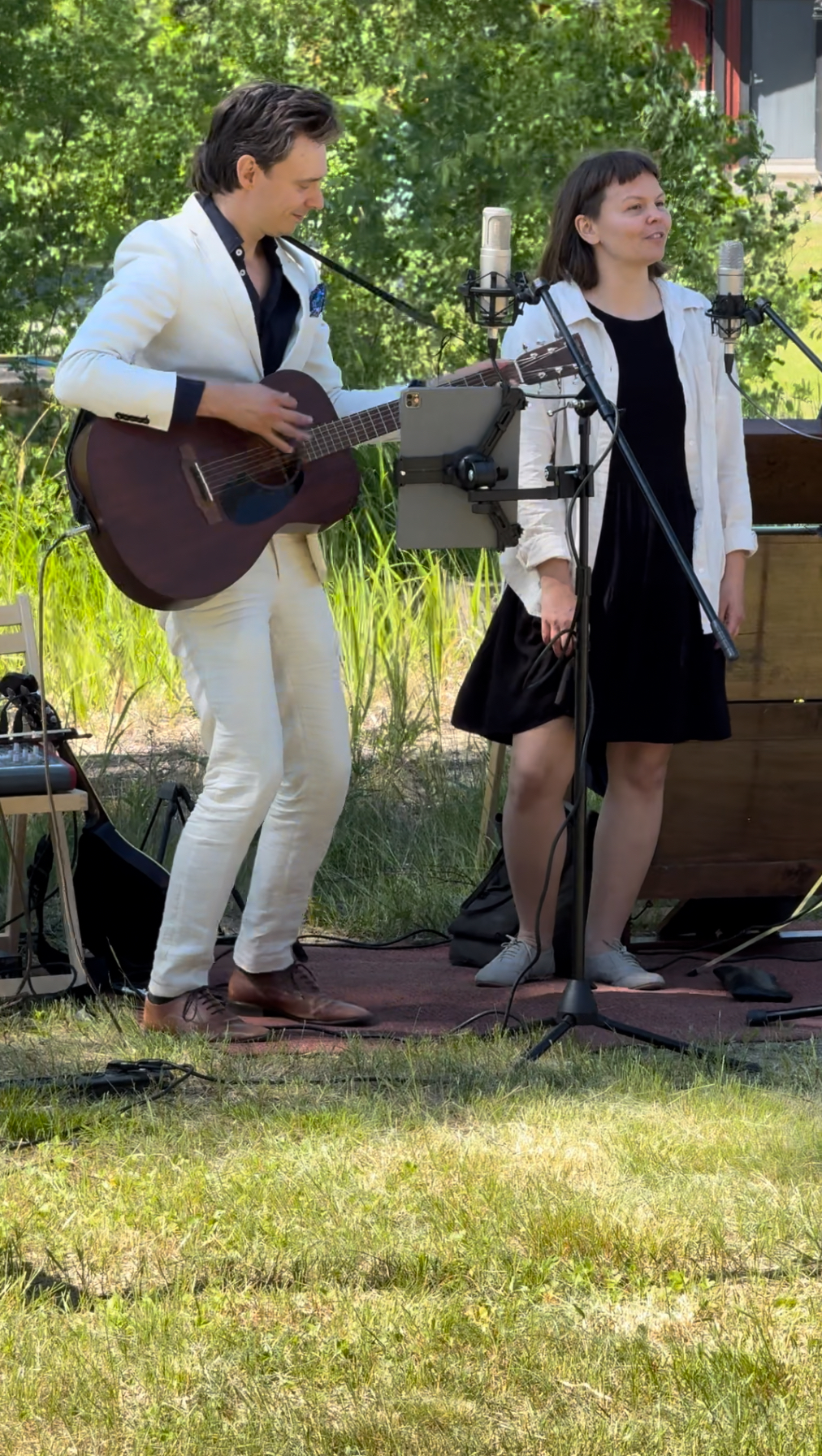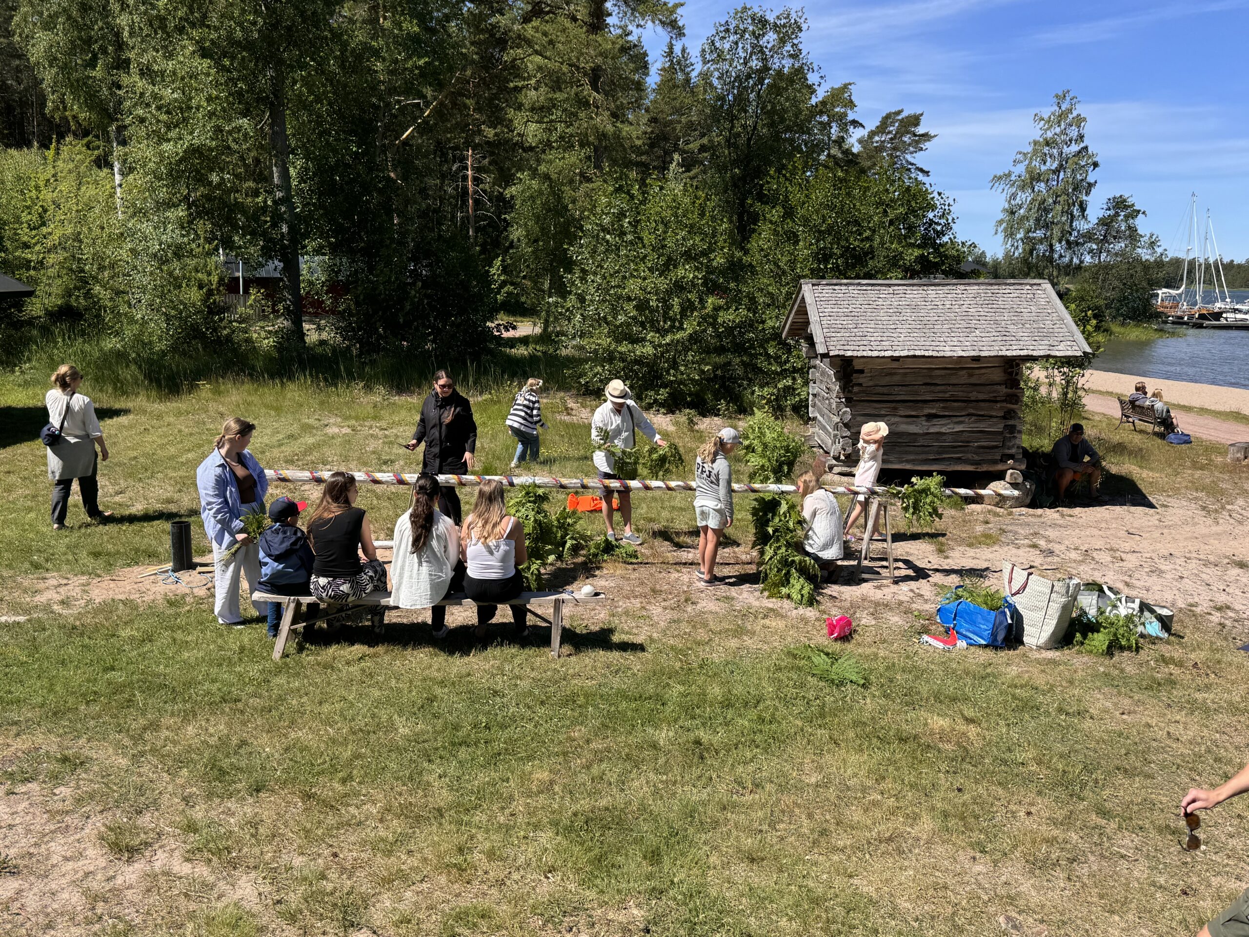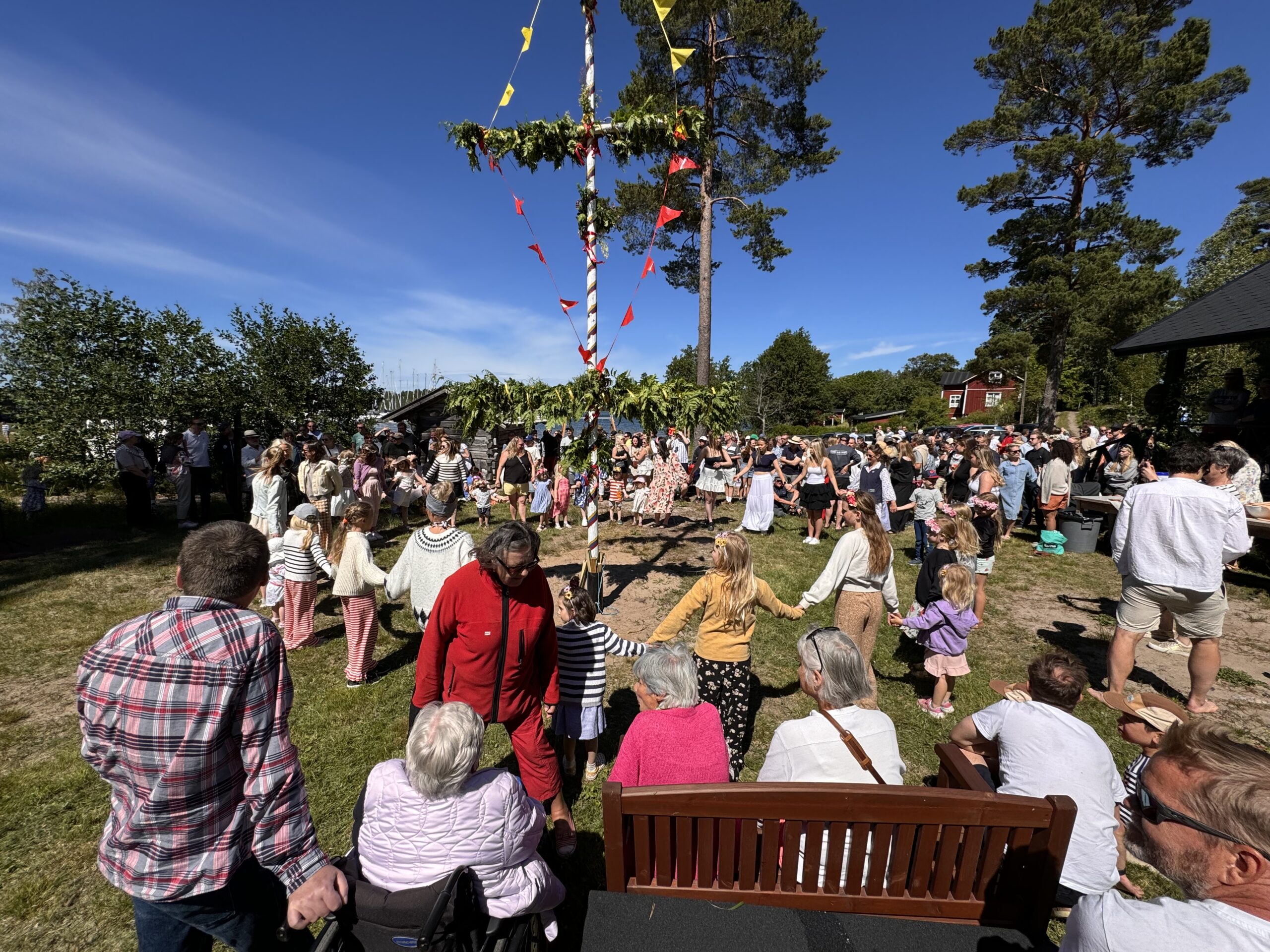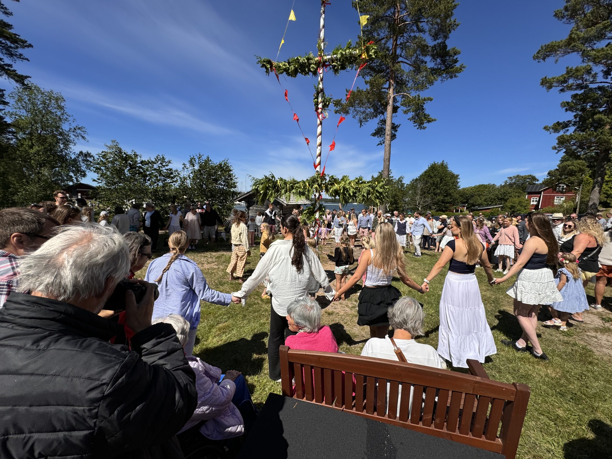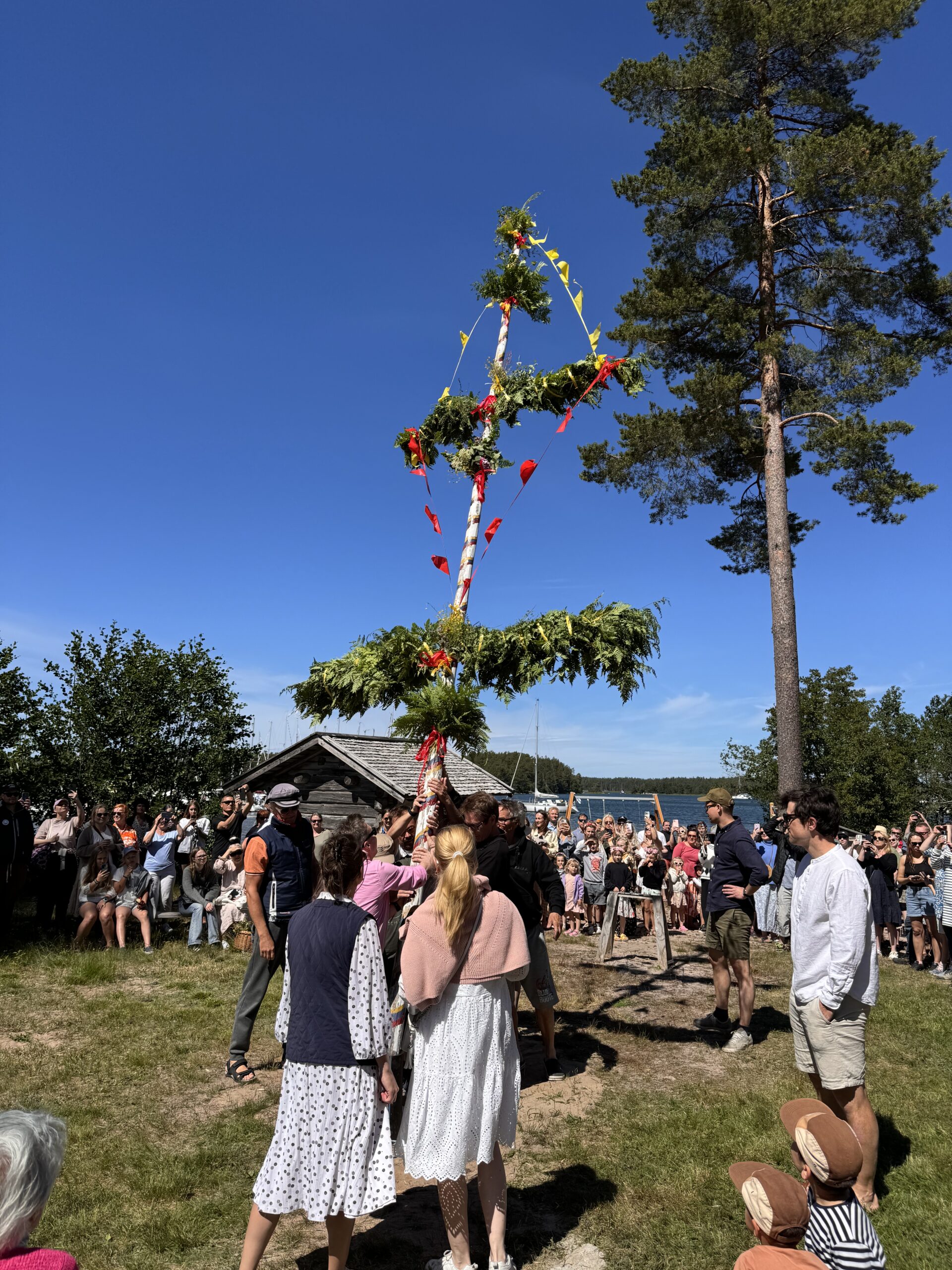 Die traditionelle Feier findet auf Högsåra in dem Ort Keysarhamnen statt, ein weiterer Hafen an der Nordseite der Insel, zu Fuß vielleicht 40 Minuten entfernt. Ab 12:30 wird der Baum geschmückt, ab 14:00 aufgestellt und gefeiert. So der Plan. Der Hafen hier ist nett, unserer hat aber eindeutig eine bessere Kneipe. Der „Baum“ ist eine vielleicht 8m lange Stange mit zwei Querbalken. Der zweite Querbalken verhindert, dass es zu sehr nach Kreuz aussieht, er bricht aber während des Schmückens ab und wird hurtig mit einem neuen ersetzt. Das Schmücken besteht daraus, dass Farne, Birkenzweige und Blumen an den Baum gebunden werden, am Ende noch eine billige Girlande aus Plastikwimpeln. I am not very impressed. Derweil bauen zwei Musiker ihre Anlage auf, einschließlich einer Art tragbaren Orgel, wo die Spielerin hektisch auf zwei Blasebälgen trampelt, um den notwendigen ‚Wind‘ zu erzeugen. Ein kleiner Tisch wird aufgebaut, wo es später „Saft och Bulle“ gibt, einen Pappbecher Saft mit einem Gebäckteilchen. Nirgendswo ein zünftiges Fass Bier. Bis 14:00 sammeln sich etwas hundert Leute auf dem Platz, einige festlich gekleidet, viele Mädels in weißen Kleidern, und die kleinen Mädchen (und ältere Spaßvögel*innen) mit Blumenkranz auf dem Kopf.