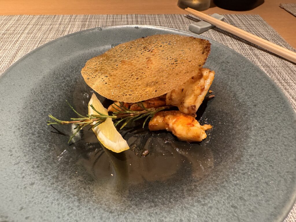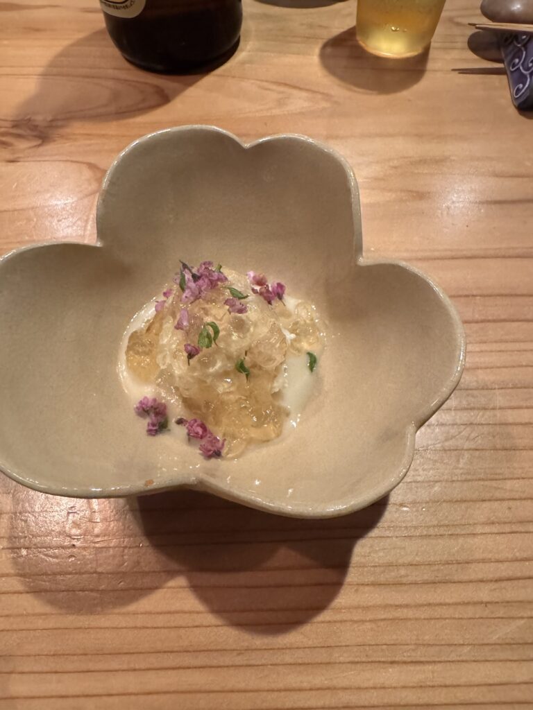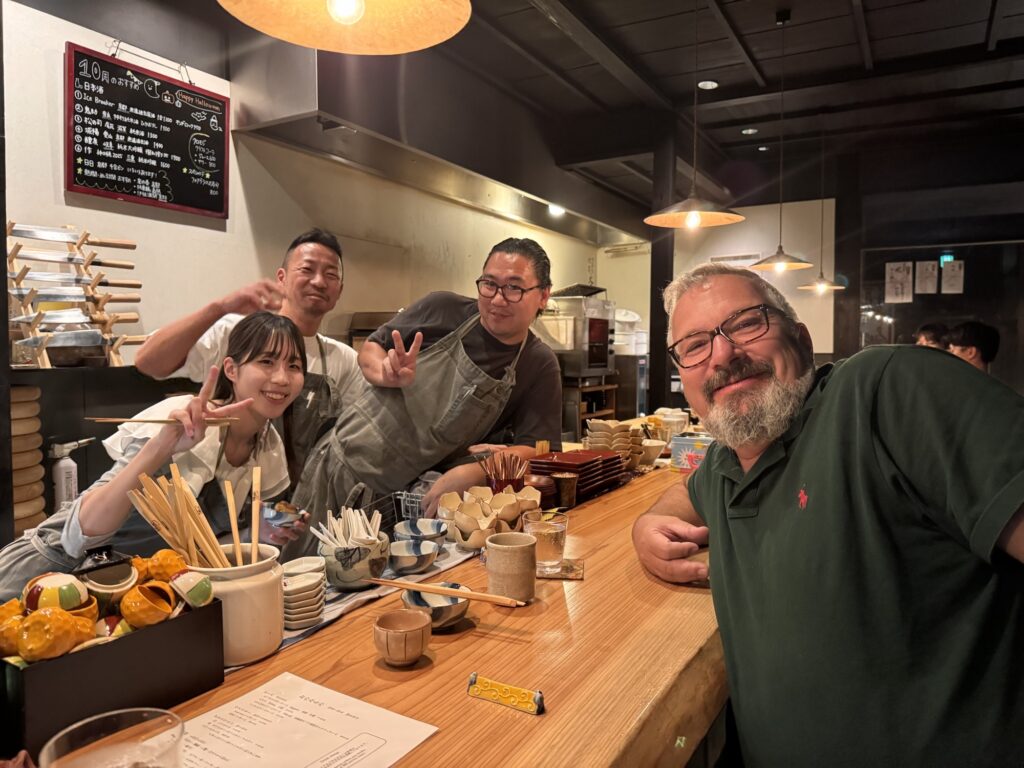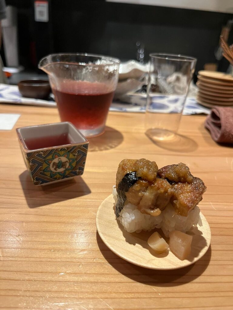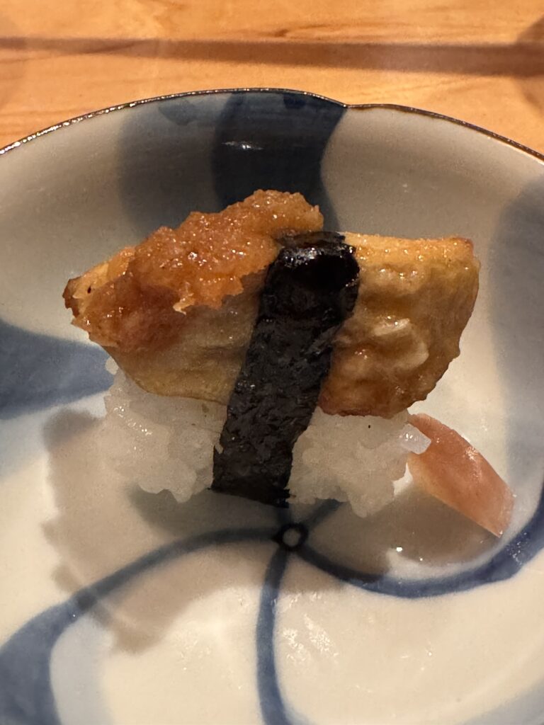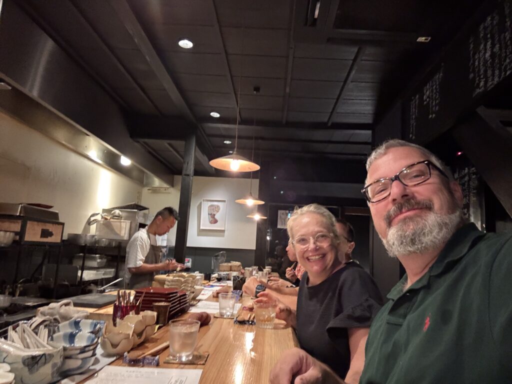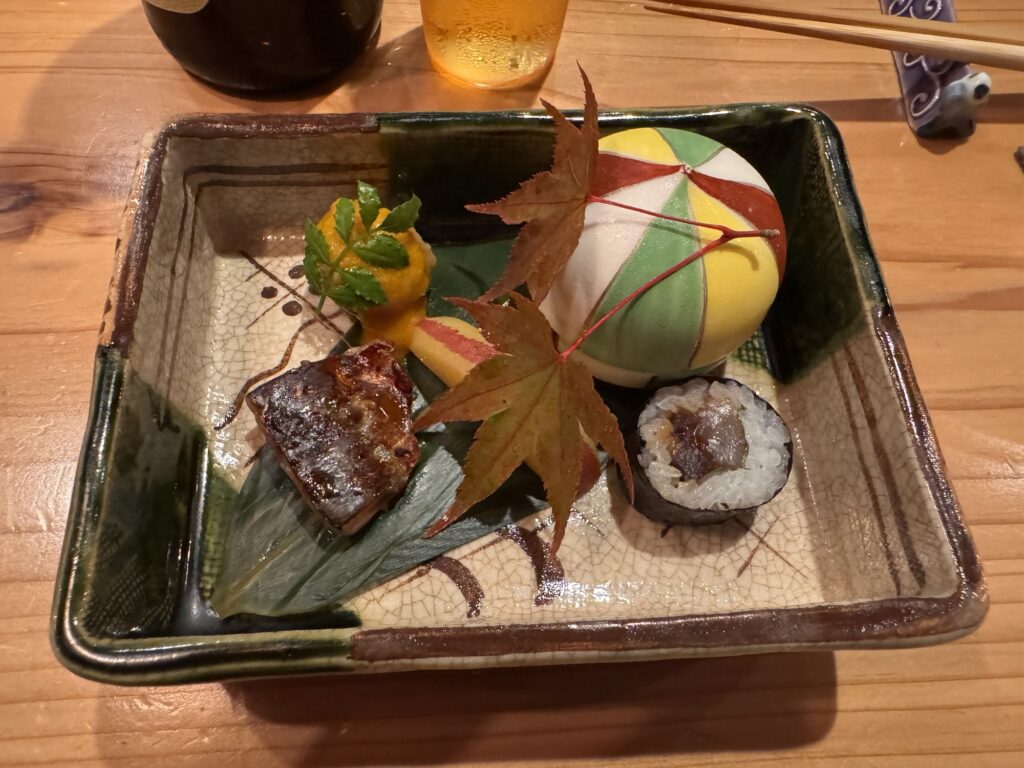 Auf Empfehlung von Bine und Ebi habe ich an meinem letzten Abend in Japan im Kuzushi Kotowari reserviert. Kaiseki-Style, also eine feine Menüfolge von erlesenen Speisen. Der Koch hat auch jeweils erklärt, was es war; ich konnte es mir nicht merken. Anfangs saß ich neben einem Paar aus Dänemark, die aber schon länger da waren als ich. Danach hat sich Mitsuki neben mir um meine Aufmerksamkeit bemüht. Scheinbar ein ‚Freund des Hauses‘, und es gesellten sich noch weitere dazu, einschließlich eines kleinen Jungen der auf der Theke angefangen hat, seine Lego zu bauen. Irgendwann war ich die letzte Langnase, und der Rest hat mit dem Koch Geburtstag gefeiert. Das wurde dann noch richtig lustig.