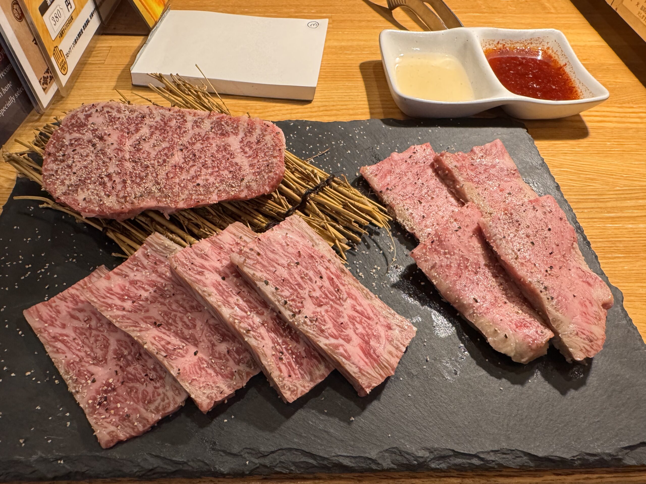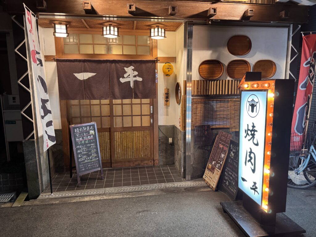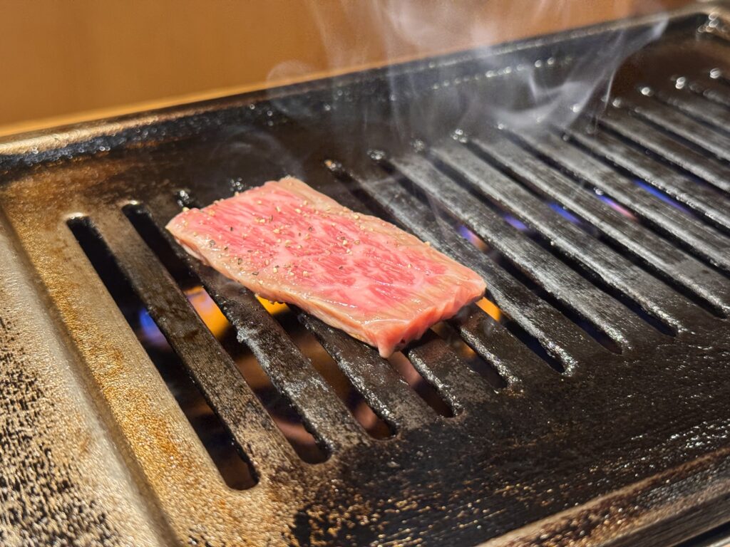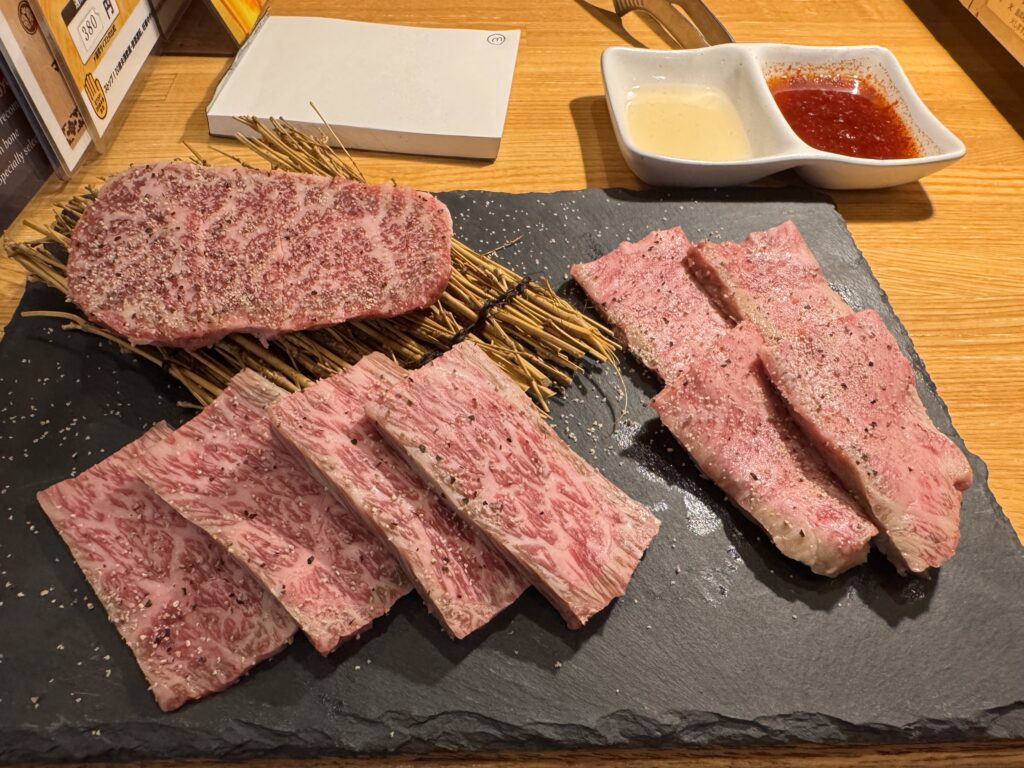 Von Bine und Ebi habe ich für Kyoto eine Restaurant-Empfehlung bekommen – scheinbar wirklich exzellent. Ob es mit Kobe-Steak wäre? Nein, Kaiseki Style. Das sind dann ungefähr 20 Teller wo man bei jedem denkt – das kann doch nicht alles gewesen sein; und am Ende doch aus dem Restaurant rollt. Gut, das ist jetzt für die letzte Nacht gebucht, also muss ich sehen, dass ich noch einmal so ein Kobe-Steak bekomme. Meine Erwartungshaltung dafür: Mindestens 100€, nur für ein Steak, und das auch homöopathisch von der Größe. Als ich in Osaka ankommen, sehe ich mir die Restaurants in Nähe an. Einige bieten so etwas (ähnliches) offensichtlich an. Meine Wahl fällt auf das 焼肉・ホルモン 家蔵一平 – gute Bewertungen, vertrauenserweckende Fotos von fein marmoriertem Fleisch an der Tafel vor der Tür, und ein stilisierter Stierkopf über der Tür. Nur Mut, denke ich mir. Jeder Gast hat seinen kleinen Tischgrill; ich habe mich doch gegen Do-it-Yourself Essen ausgesprochen. „It’s easy, meint die freundlich lächelnde Bedienung“; Konsequenz ist Glücksache. Die Preise sind gar nicht so schockierend. 4.500 ¥ für die teuerste Platte „assorted 3 kinds of special selection“, das sind grob 27€. YOLO denke ich mir (für die älteren: You only live once). Her damit. Schuhe hat man an Tür gelassen, es hat ca. 30cm hohe Tische über den Tatami-Matten. Damit das auch ältere Leute mit Knieproblemen schaffen, ist unter dem Tisch aber ein Loch, deshalb sitzt man nicht im Schneidersitz, sondern einfach auf der Kante der Tatamimatte am Loch. Die Platte kommt. Was da an Rind drauf liegt, hat NICHTS mit einem Steak von der Theke bei Vinzenz Murr zu tun. Superdünne Scheiben, vielleicht 5mm dick. Das Fleisch liegt auf einem kleinen Reisig-Bündel. Der Bedienerich meint: „one minute, one minute, finished“. Mir fällt auf, dass ich NUR Fleisch habe, keine Pommes dazu. Ich bestelle noch ein paar „Sides“: Gesalzenes Kraut, Zwiebel, und etwas „Chorizo (spicy sausage)“. Als die kommt, muss ich laut lachen, der Bedienerich schaut mich verwirrt an – wenn Ihr das Foto seht, lacht Ihr auch. Wenn es einen Hüter der Produktmarke „Chorizo“ gab, der dreht sich jetzt mit 5000 Umdrehungen im Grab. Der Bedienerich erklärt zu dem Fleisch „Kobe“, aber ich bin a bisserl skeptisch.* Aber Kobe-Rind ist auch nur die Rasse Wagyu aus dem Gebiet D.O.C. Zu dem Fleisch gibt es zwei Tunke-Saucen, eine davon etwas schärfer.