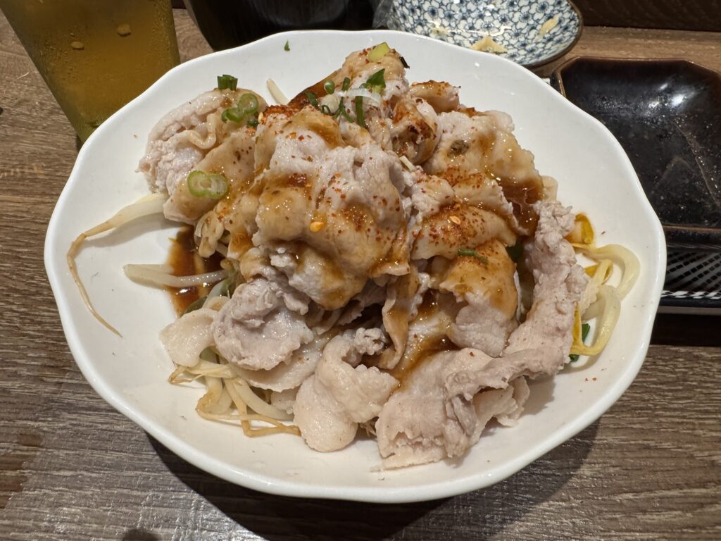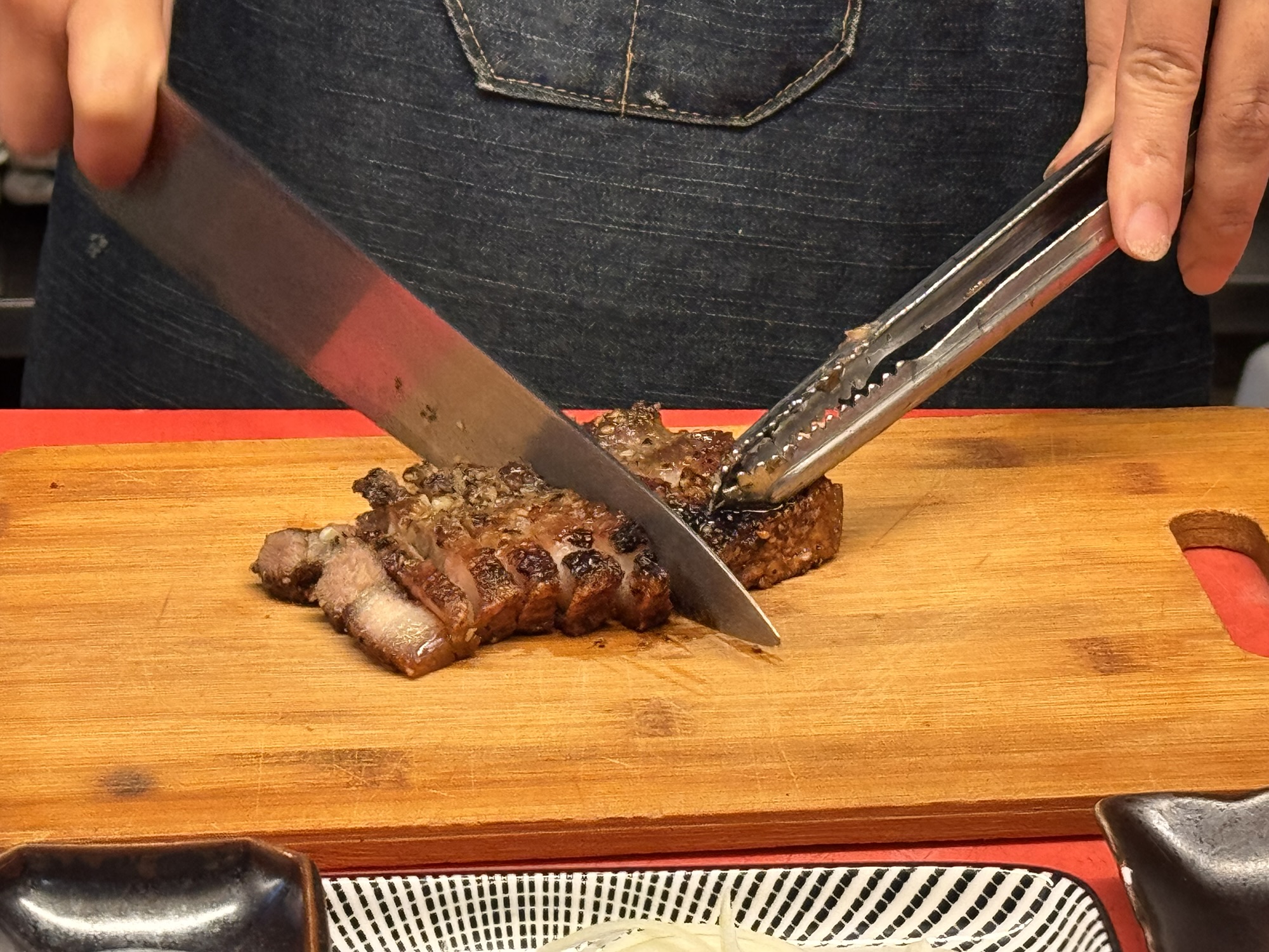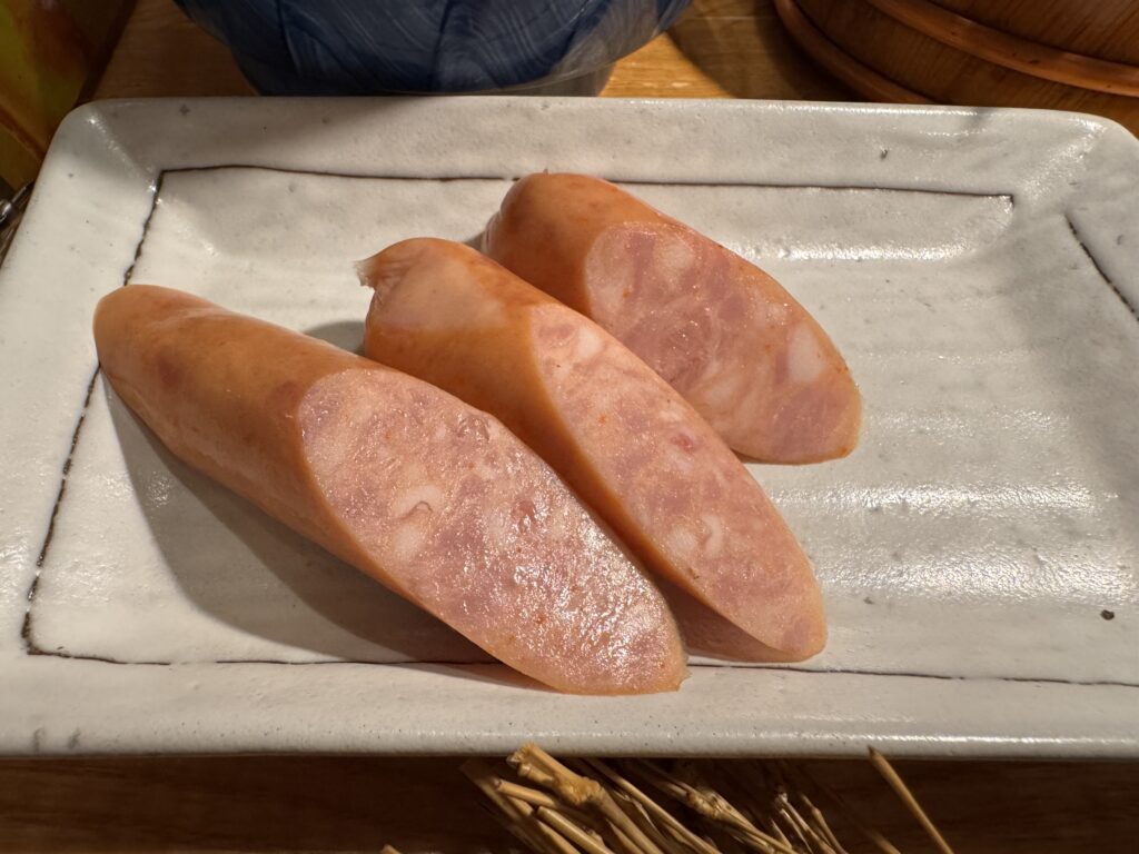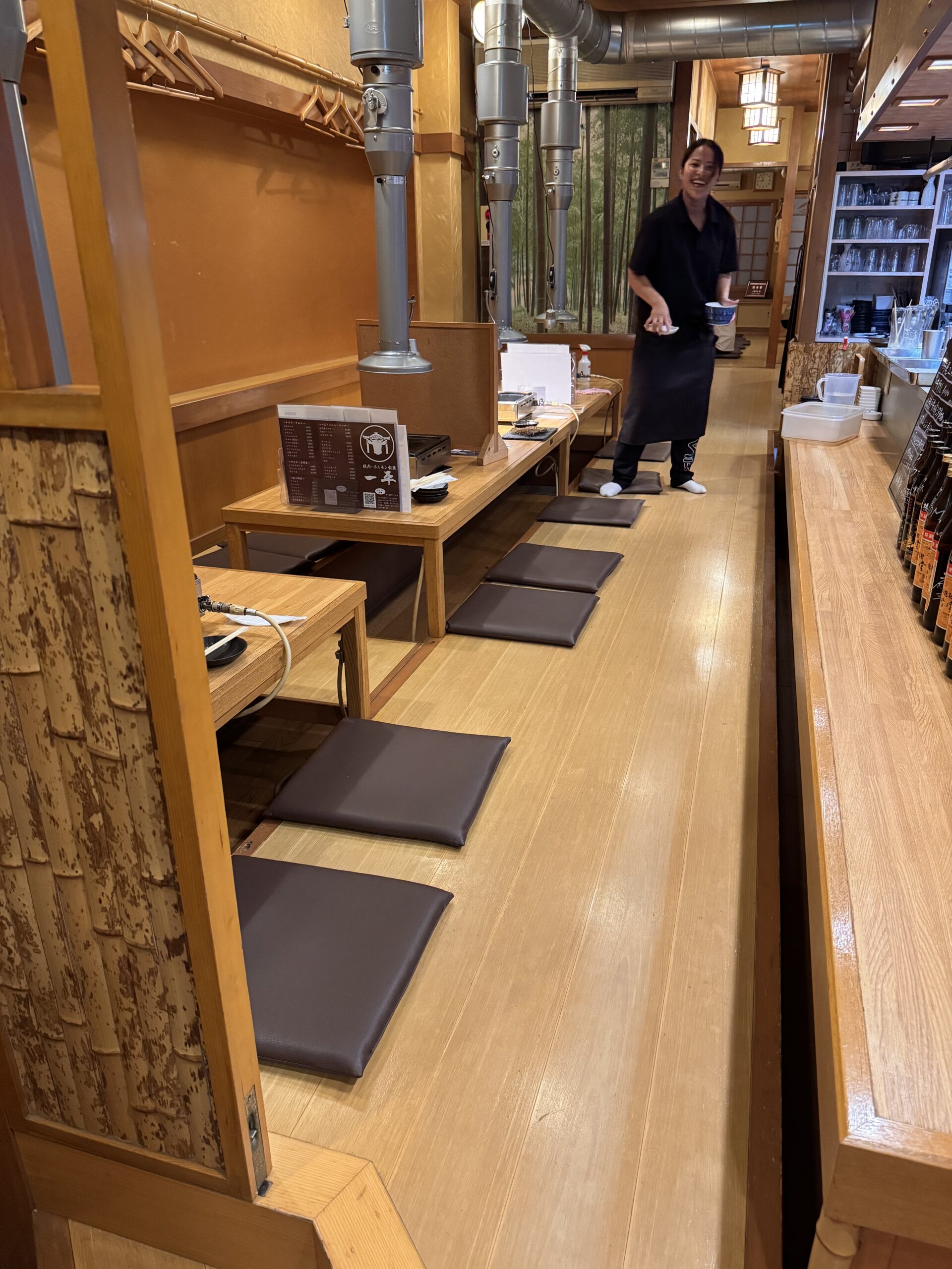 Von Bine und Ebi habe ich für Kyoto eine Restaurant-Empfehlung bekommen – scheinbar wirklich exzellent. Ob es mit Kobe-Steak wäre? Nein, Kaiseki Style. Das sind dann ungefähr 20 Teller wo man bei jedem denkt – das kann doch nicht alles gewesen sein; und am Ende doch aus dem Restaurant rollt. Gut, das ist jetzt für die letzte Nacht gebucht, also muss ich sehen, dass ich noch einmal so ein Kobe-Steak bekomme. Meine Erwartungshaltung dafür: Mindestens 100€, nur für ein Steak, und das auch homöopathisch von der Größe. Als ich in Osaka ankommen, sehe ich mir die Restaurants in Nähe an. Einige bieten so etwas (ähnliches) offensichtlich an. Meine Wahl fällt auf das 焼肉・ホルモン 家蔵一平 – gute Bewertungen, vertrauenserweckende Fotos von fein marmoriertem Fleisch an der Tafel vor der Tür, und ein stilisierter Stierkopf über der Tür. Nur Mut, denke ich mir. Jeder Gast hat seinen kleinen Tischgrill; ich habe mich doch gegen Do-it-Yourself Essen ausgesprochen. „It’s easy, meint die freundlich lächelnde Bedienung“; Konsequenz ist Glücksache. Die Preise sind gar nicht so schockierend. 4.500 ¥ für die teuerste Platte „assorted 3 kinds of special selection“, das sind grob 27€. YOLO denke ich mir (für die älteren: You only live once). Her damit. Schuhe hat man an Tür gelassen, es hat ca. 30cm hohe Tische über den Tatami-Matten. Damit das auch ältere Leute mit Knieproblemen schaffen, ist unter dem Tisch aber ein Loch, deshalb sitzt man nicht im Schneidersitz, sondern einfach auf der Kante der Tatamimatte am Loch. Die Platte kommt. Was da an Rind drauf liegt, hat NICHTS mit einem Steak von der Theke bei Vinzenz Murr zu tun. Superdünne Scheiben, vielleicht 5mm dick. Das Fleisch liegt auf einem kleinen Reisig-Bündel. Der Bedienerich meint: „one minute, one minute, finished“. Mir fällt auf, dass ich NUR Fleisch habe, keine Pommes dazu. Ich bestelle noch ein paar „Sides“: Gesalzenes Kraut, Zwiebel, und etwas „Chorizo (spicy sausage)“. Als die kommt, muss ich laut lachen, der Bedienerich schaut mich verwirrt an – wenn Ihr das Foto seht, lacht Ihr auch. Wenn es einen Hüter der Produktmarke „Chorizo“ gab, der dreht sich jetzt mit 5000 Umdrehungen im Grab. Der Bedienerich erklärt zu dem Fleisch „Kobe“, aber ich bin a bisserl skeptisch.* Aber Kobe-Rind ist auch nur die Rasse Wagyu aus dem Gebiet D.O.C. Zu dem Fleisch gibt es zwei Tunke-Saucen, eine davon etwas schärfer.