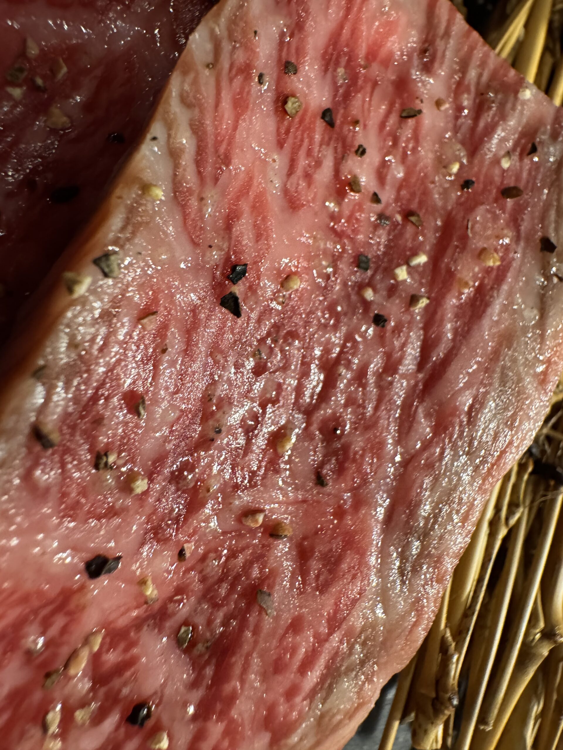 Doch nun der Versuch einer einordnenden Schilderung. Man hatte mich gewarnt: „Wenn Du ein Kobe-Steak isst, bist Du für normales Steak komplett versaut“. Jein. Es ist unglaublich lecker, keine Frage. Aber es ist kein Steak. Es sind klitzekleine Scheiben, die man auch gut auf einem Raclette-Grill machen könnte. Sie bestehen gefühlt so zu 60% aus Fett, also lauter Geschmacksträger (Ich muss dabei immer dran denken, was ich für ein krasser Geschmacksträger bin), was ein wenig zu kurz kommt ist das Hämoglobin, also letzten Endes Blut. (Ich habe mal in einer Sendung über veganes Fleisch gehört, dass es tatsächlich der Hämoglobin-Geschmack ist, was darüber entscheidet, ob eine Wurst aus Erbsen und Chemie als Fleischersatz akzeptiert wird). Am Ende wird mich der Abend ca. 45€ kosten, eigentlich sehr akzeptabel. Und ich musste es selbst grillen – vielleicht habe ich alles versaut, und es hätte ganz anders zubereitet gehört. Anyway, das probiere ich nochmal…