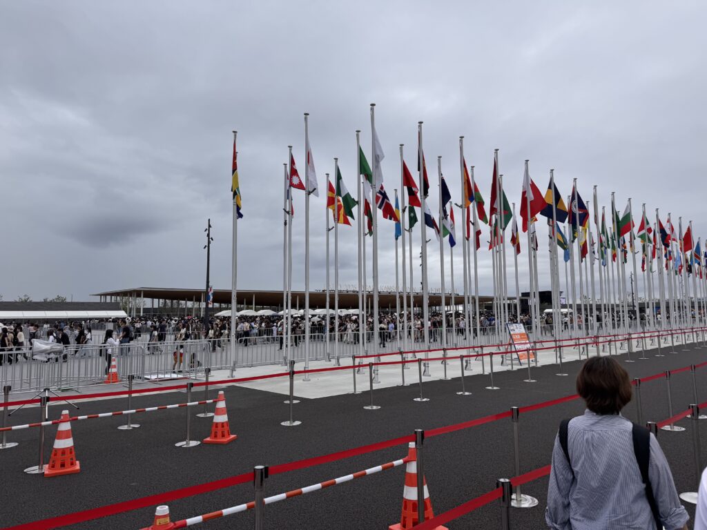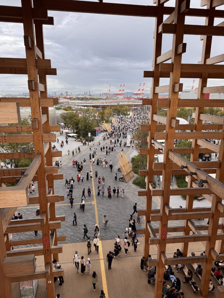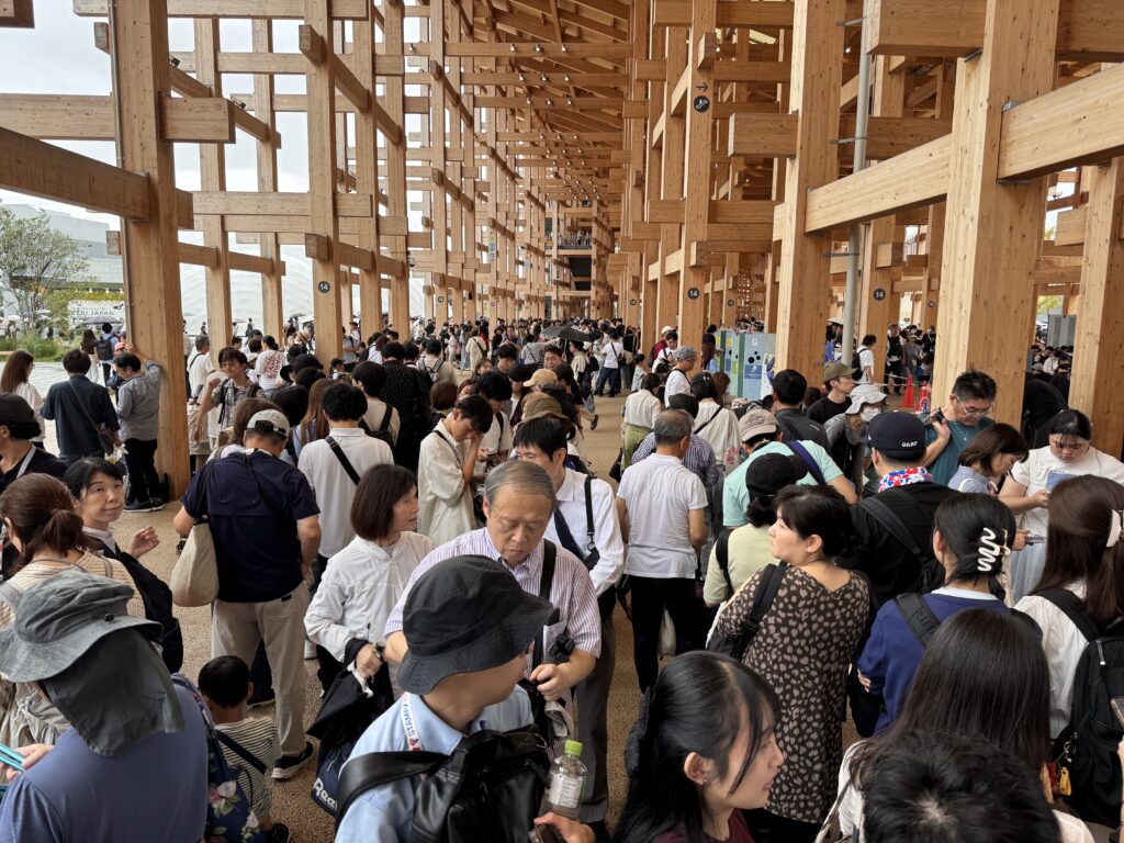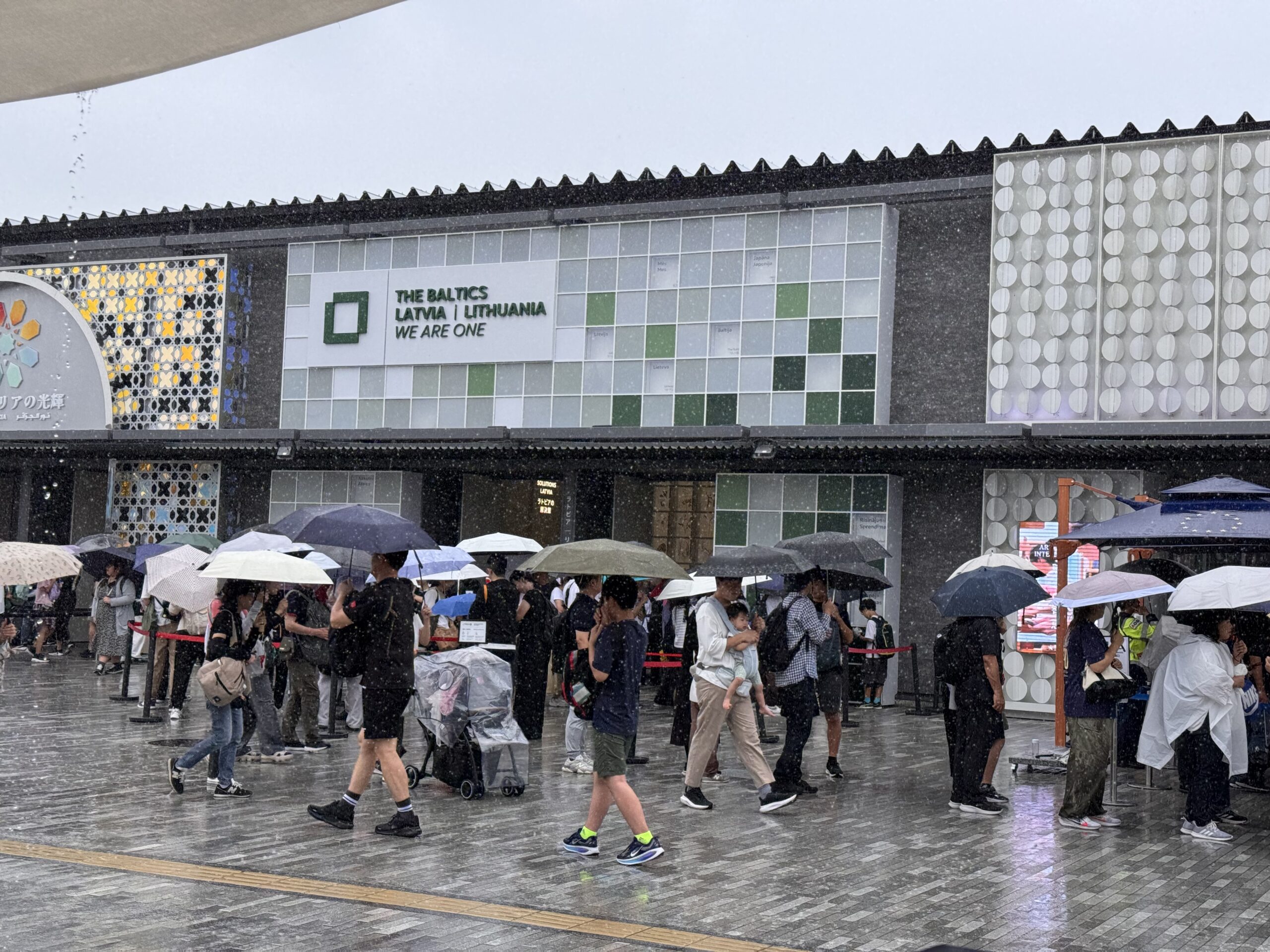 Ich habe es doch noch auf die Expo geschafft. Eine ‚Tour‘ mit Get-your-guide, hier ist Ihre Eintrittskarte, wir treffen uns dann im Innenraum – nicht. Danke Doro für den Tipp. Die Expo 2025 ist ein Moloch. Und wenn bei dem Titel an eine kleine Natter im Regenwald gedacht hat – nein. Regen und Ansteh-Schlangen werden meine Erinnerung der Expo beherrschen. Die Wettervorhersage war eher unstet, und kurz vor der Expo war der Bericht nur von weniger als ein Millimeter; ich entschied also keinen Schirm zu kaufen. Fehler. Man kommt mit der U-Bahn an der Station Yumeshima an. Daneben ist die World Expo East Gate. Auf meiner Karte steht aber West Gate. Es gibt einen Bus, statt 2 km läuft man dann nur noch 800m, im fröhlichen Schlangenlinien um die Crowd-Control-Wellenbrecher zu dem Pferch für „Reservation 11:00“. Es nieselt ein wenig. Insgesamt brauche ich vom Ausgang der U-Bahn bis auf das Gelände 45 Minuten, aber tatsächlich, um 11:00 bin ich drin. Menschenmassen. Der Zutritt zu den einzelnen Pavillons erfolgt entweder durch eine Verlosung (über die Kennung mit der ich KEIN Ticket bekommen habe), oder durch lange Schlangen bei den beliebteren Pavillons. Ziemlich am Anfang sehe ich einen „The Baltics – Latvia and Lithuania“, mit vertretbarer Schlange davor. Da es mir dort gut gefallen hat, und ich wissen möchte, warum in der Gruppe Estland fehlt, stelle ich mich 10 Minuten an, und betrete dann den Pavillon.