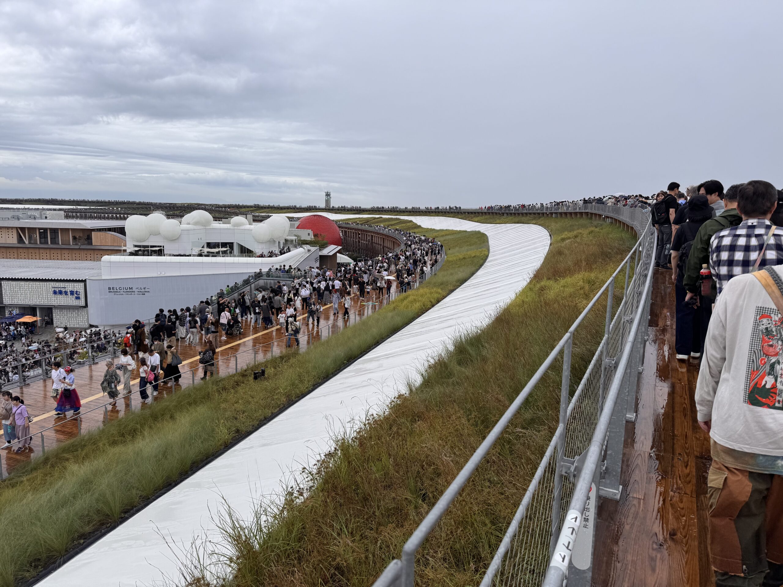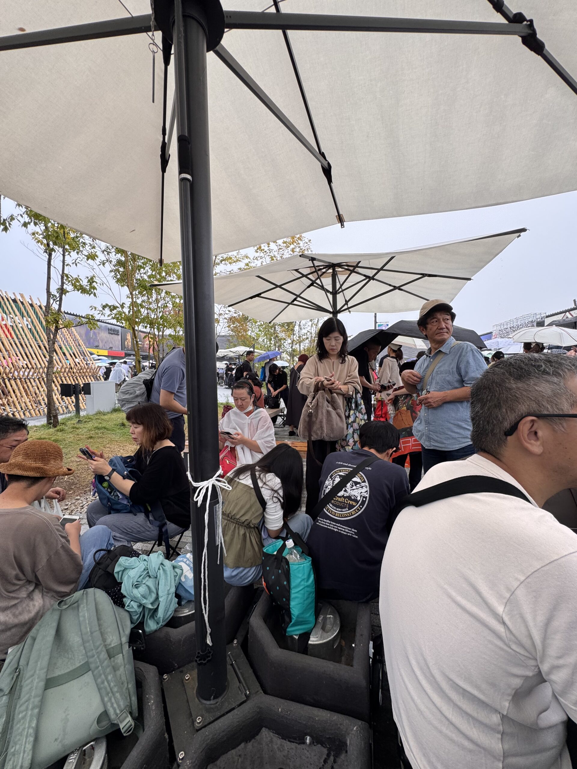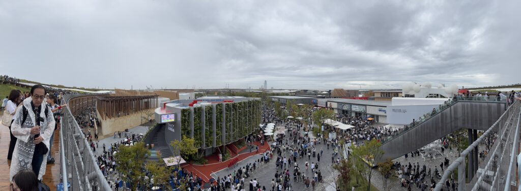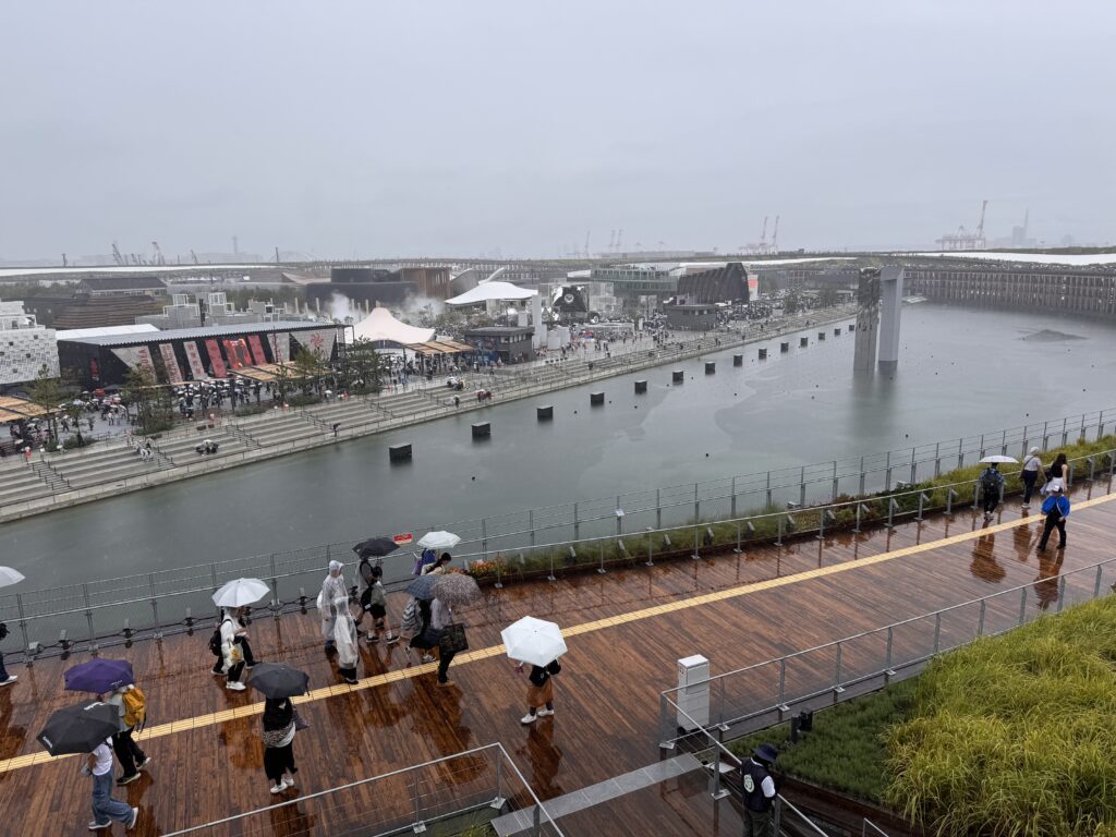 Nach 10 Minuten probiere ich es aus – vielleicht ist es ja gar nicht so schlimm, sondern sieht nur so aus? Nach 40 Meter flüchte ich unter einen Schirm, ergattere einen Platz auf einer trockenen Holzbank. Hier warte ich die nächste Stunde. Als der Regen etwas nachlässt, nehme ich die Rolltreppen auf den „Grand Ring“, ein beeindruckendes, ringförmiges Bauwerk aus Massivholz um das Gelände, ca. 20 Meter hoch. Von da oben hat es bestimmt einen tollen Blick auf die Expo, und auch auf die Umgebung. Von den 360° schaffe ich ca. 15°, dann beginnt es wieder zu regnen. Der nächste Abgang ist in weiteren 15°. Blöd. Bis ich dort ankomme, bin ich ziemlich pitsch-nass, und verbringe die nächsten 45 Minuten unter dem Ring. Sowohl für einen Foodtruck als auch den nächsten Pavillon müsste man sich anstellen – im Regen. Meine Begeisterung schwindet so langsam – maybe I should have taken „no“ for an answer, damals am 4. Oktober. Als der Regen dann aufhört, ist es 14:30. Ich wandere noch ein wenig über das Geländer. Es hat hier mehr Schlangen als in einem durchschnittlichen Reptilienhaus. Man steht an, um in Pavillons zu kommen, man steht an, um Essen zu bekommen, man steht an, um ein Selfie vor dem Maskottchen zu machen, man steht an, um Flüssigkeit zu bekommen, und auch um sie loszuwerden. Teilweise steht man an, um ich irgendwoanders anstellen zu können. Nach einer halben Stunde anstehen bekomme ich etwas zu Essen, und ich beschließe, bald einen würdigen Abgang zu machen.