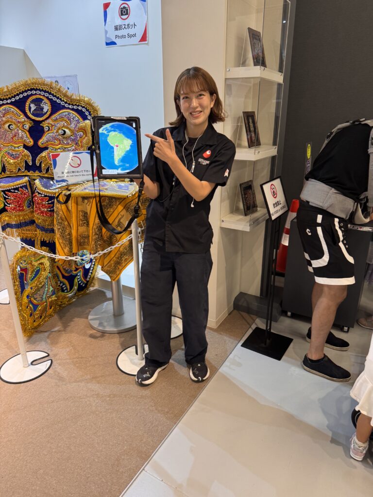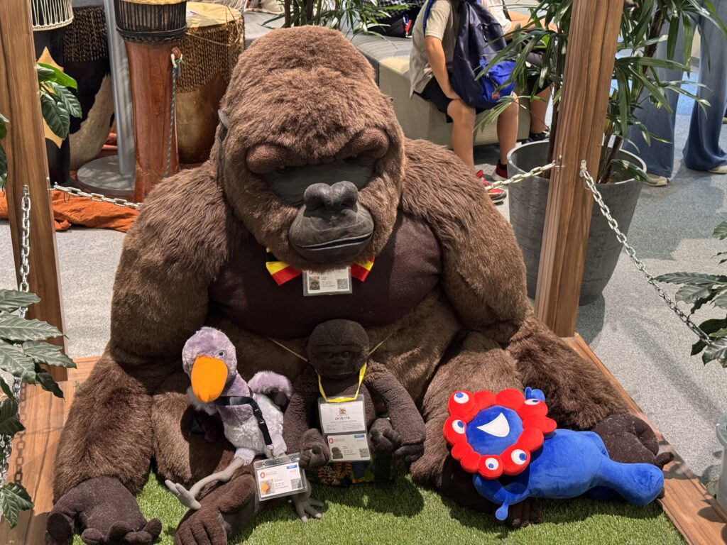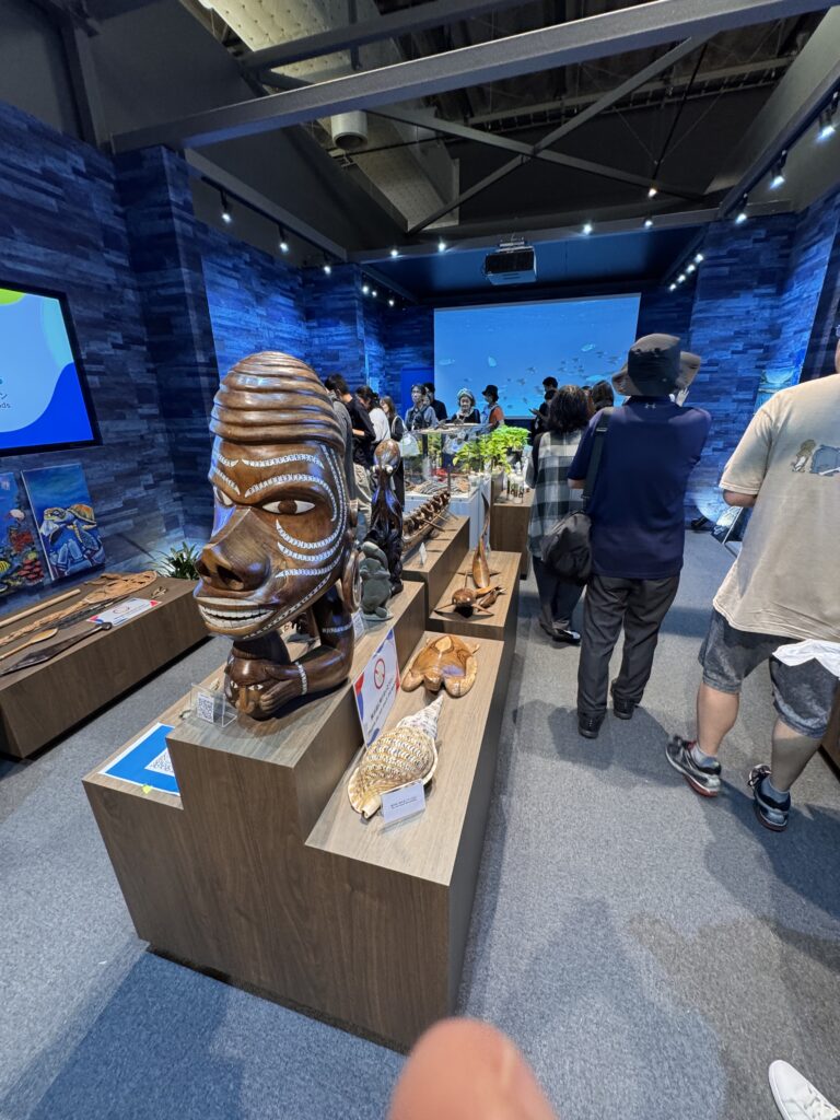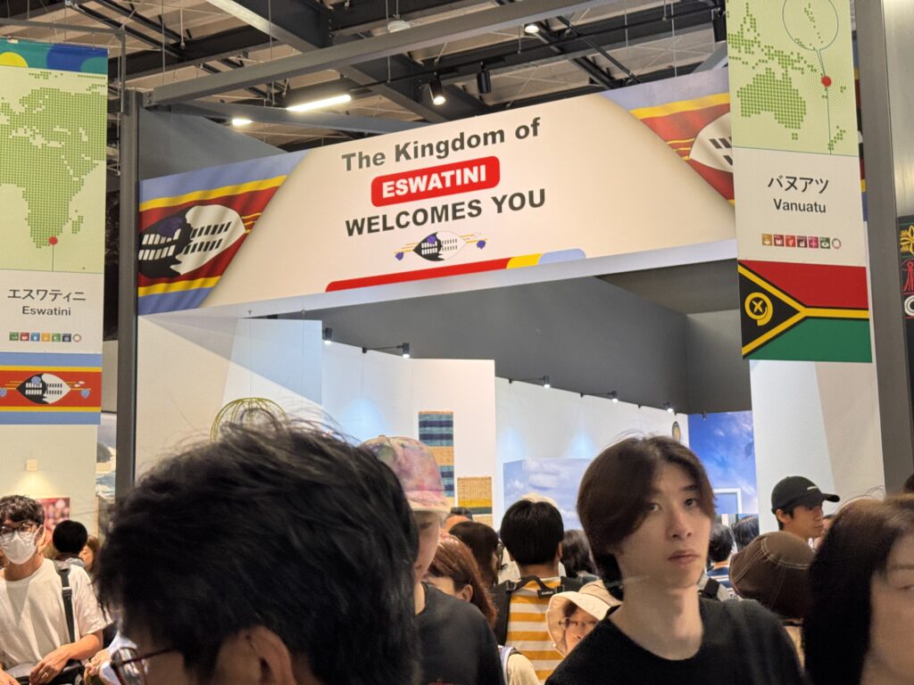 Ich komme noch in den Pavillon „Common A“ – ein Sammelsurium an verschiedenen Ländern, die sich keinen eigenen Pavillon leisten wollten. Ohne mir erkennbare Ordnung finden sich hier zB Yemen, Uganda, „The Kingdom of Eswatini“ (hättet Ihr’s gekannt?), Ghana, North Macedonia, Guinea Bissau, Kyrgyzstan, Grenada, Kenya, Comoros, Samoa, Suriname, Sri Lanka, Seychelles, Saint Kitts & Nevis, Bolivia, und…. Vielleicht stellen hier auch die Pinguine aus, auf deren Produkte Trump auch einen Zoll erhoben hat? Die Stände hier sind ähnlich. Ein paar kunsthandwerkliche Produkte, ein paar Bildschirme die wohl dazu animieren sollen, dort Urlaub zu machen, ein bissel Info über Nachhaltigkeit. Die Sinnfrage kommt mir wieder – Was ist das Zielpublikum, was ist der Zweck? Werden hier in Hinterzimmer Millionendeals zum Investment in Eswatini angebahnt? Soll mich das freundliche Bild des Königs von Eswatini dazu animieren, dort mal in Urlaub hinzufahren? (NB: Ich hatte noch nie von Eswatini gehört – hätte es als kleine Enklave in Südafrika geschätzt, wie zB Swasiland. Eben auf Wikipedia geschaut, bis 2018 WAR es Swasiland – vielleicht bleibt es mir genug in Erinnerung, dass ich da tatsächlich mal hinfahre) Die Pass-Stempler kommen in der Halle jedenfalls voll auf ihre Kosten.
