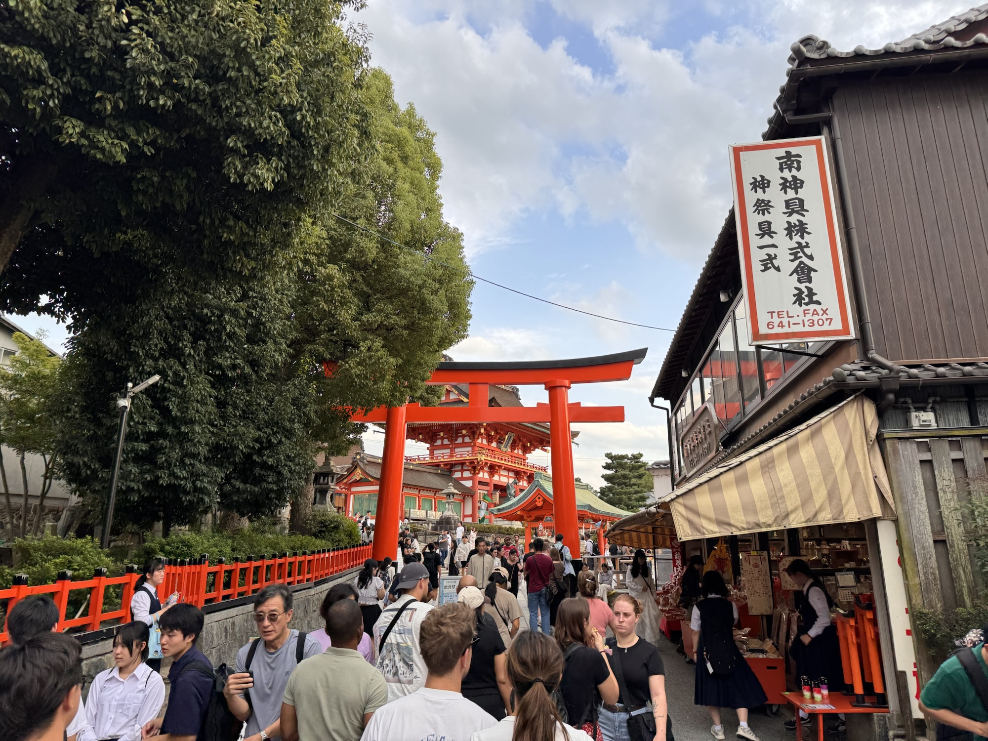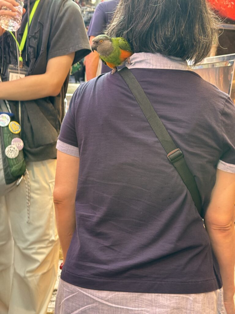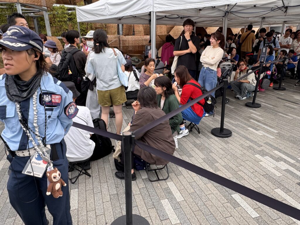 Ich schaue noch kurz an andere Pavillons, überall lange Schlangen, die Japaner haben sich wie Profis darauf eingestellt. Es gibt hier so Falthocker, zusammengelegt groß wie eine Tellermine, damit wird der Amateur-Schlangen-Steher zum Profi-Schlangen-Hocker. Leider habe ich im Innenraum weder Regenschirme noch Hocker zum Kauf gesehen. Gegen 16:30 gebe ich auf – ich war da, das war gut, ich bin froh zu wissen, dass ich nix verpasst hätte, wäre ich nicht dort gewesen. Auf nach Kyoto.