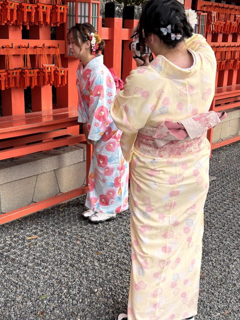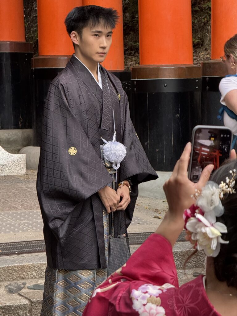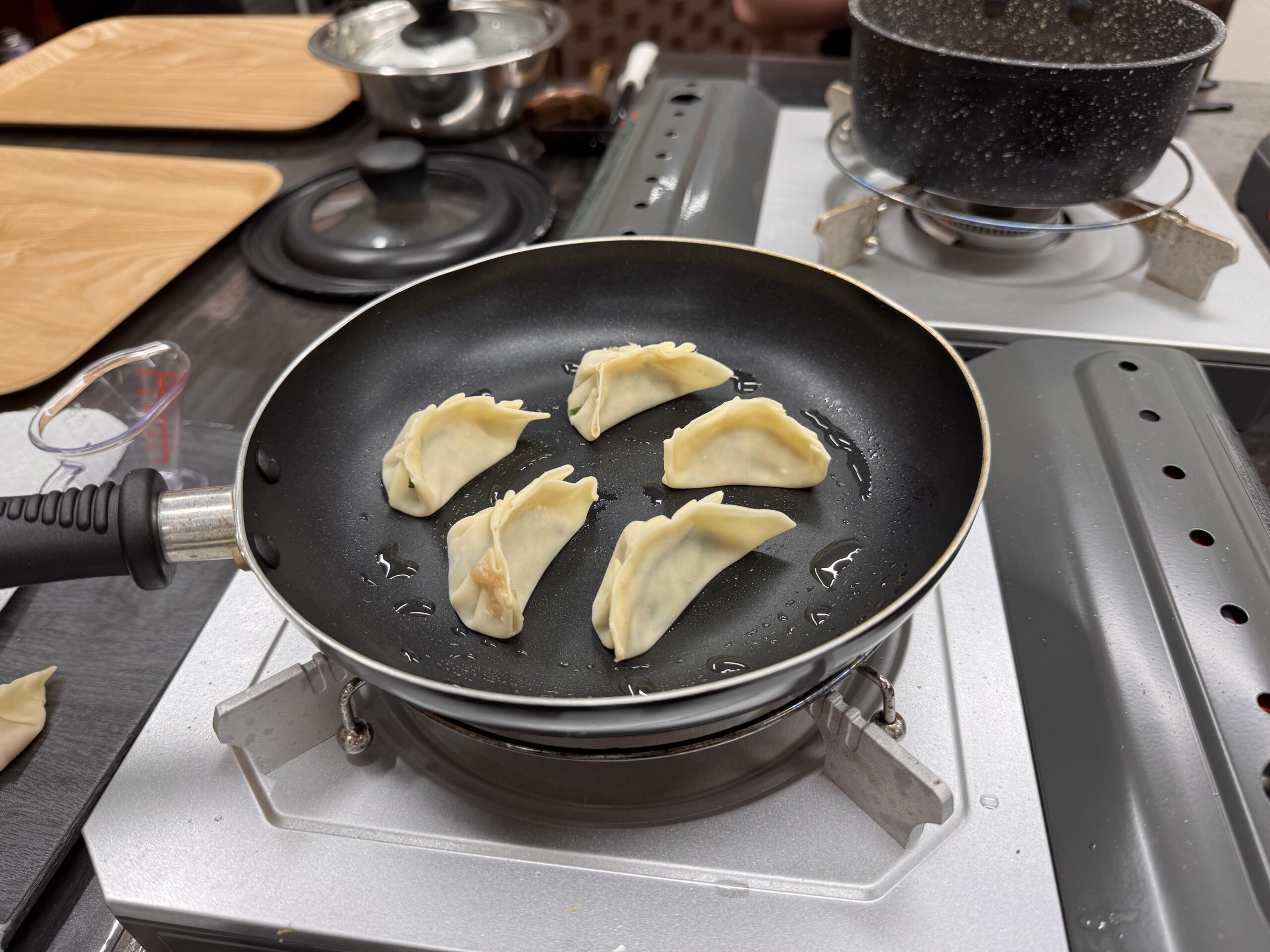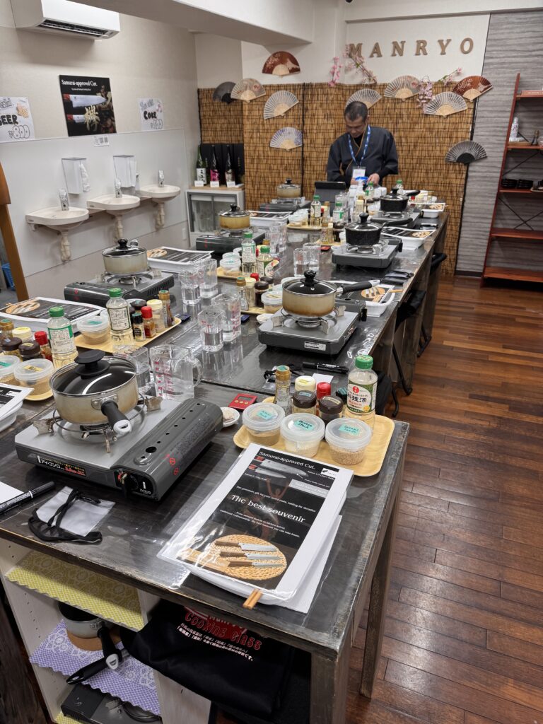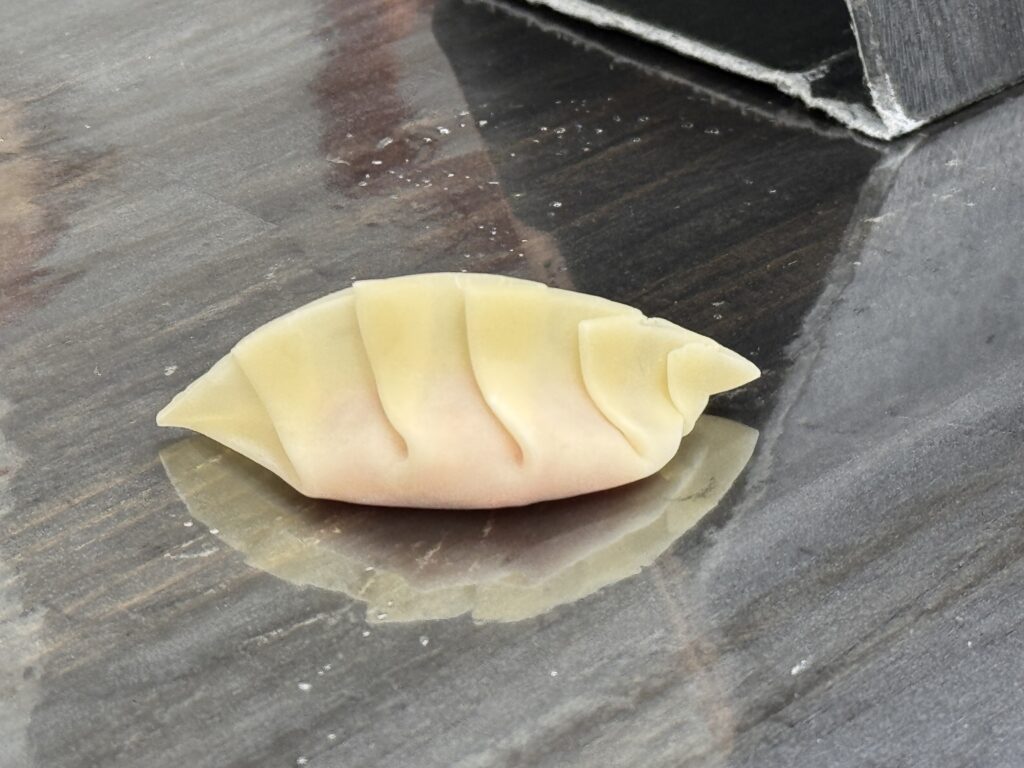 In Kyoto habe ich endlich einen Kochkurs gebucht – das hat sich auf meiner langen Asienreise bewährt. Es werden viele Kurse mit Sushi-Rollen angeboten, aber das ‚kann‘ ich schon, und wollte mal ein paar andere Sachen probieren. Der in Kyoto bietet Ramen, Gyoza und Onigiri an. Wir sind zehn Teilnehmer, jeder an einer extra Station, es kümmern sich drei Leute um uns. Alles ist akribisch geplant, angeordnet und getaktet. So ist das Wasser für die Ramen-Brühe separat in kleinen Messbechern auf dem Tisch, schon mit präzise 170ml Wasser gefüllt, und etwas Klarsichtfolie abgedeckt. Die Anleitung richtet sich an eher unerfahrene Köche, dafür: no cook left behind. Die größte Herausforderung bleibt das Gyoza falten. Witzig: man bekommt einen Plastikhandschuh, um die Hackfleischmischung für die Gyoza zu kneten, aber nimmt sie fünf Minuten später mit nackten Finger aus der Schüssel, um sie in die Teigblätter zu geben. Etwas viel wurde auch schon vor-vorbereitet. So hätte ich es spannend gefunden, wie genau sie den klebrigen Reis für die Onigiri machen, und auch der gesamte Inhalt der Ramen Schüssel ist fertig vorbereitet (gut, Nudeln nach Anleitung weich machen, hartgekochtes Ei, Mais, Sprossen, Frühlingszwiebeln und ein paar Scheiben Huhn (im Rezept: „Toppings of your choice“) bekommt man auch so hin). Also anyway, ein vergnüglicher Mittag, und gut gegessen danach auch.