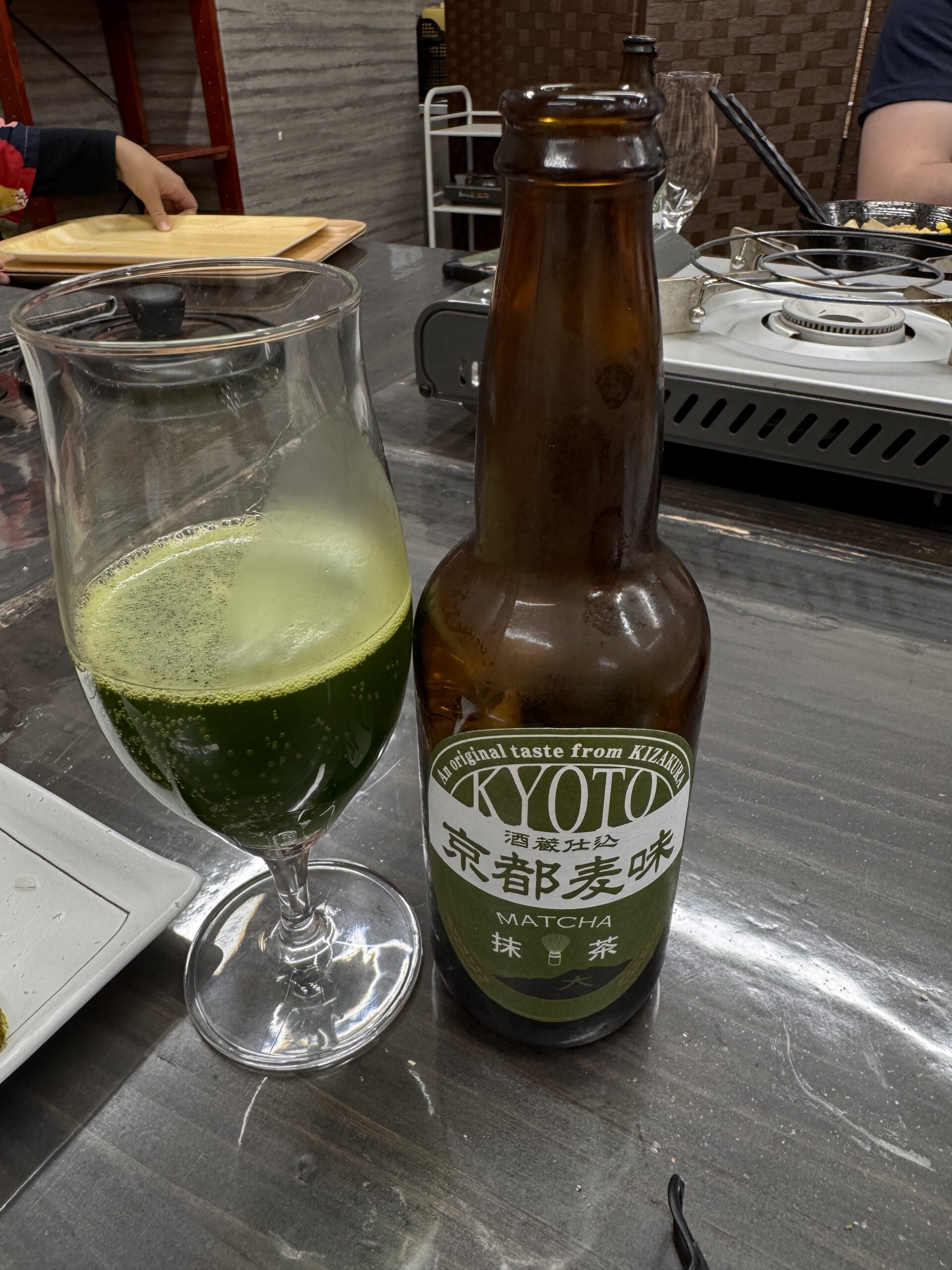 …nämlich am nächsten Abend in Kyoto, im Restaurant Yamadaruma, direkt neben dem Hotel. Hier kostet der „most popular plate“ ¥ 2.980, also ca. 18€. Dass in der Karte auch „about for 2 Persons“ steht, ignoriere ich geflissentlich. Auch hier bestelle ich Kraut und etwas Zwiebel dazu, und ein Glas Rotwein. Rotwein in Japan: don’t do it. Er kommt eiskalt. Dass ich ihn ein wenig neben dem Tischgrill auftauen lasse, tut ihm aber auch nicht unbedingt gut. Kein Rotwein mehr in Japan. Hier empfiehlt der Maître, das bessere Fleisch von den fünf verschiedenen Cuts ähnlich wie Sushi, mit Soja und Wasabi, zu genießen. Da ich hier einen Thekenplatz habe, kann ich mich gegen Ende mit dem Chefkoch etwas unterhalten. (Mehr etwas als unterhalten). „Kobe?“ frage ich. Nein, wehrt er ab, mit einem Blick der zu dem Gedanken passen würde ‚Bist Du behämmert, das würde sonst doppelt so viel kosten‘, das ist Miyazaki. Was denn das Gesamtfleischgewicht des Ensembles wäre? Er zückt den Taschenrechner, 210 Gramm (gedacht für zwei, ein Schelm wer meine Mengen daheim kennt). Ich hab‘ dann mal Miyazaki gegoogelt, hauptsächlich um die Schreibweise zu bestätigen. Von einem Händler in Deutschland 400-540€ pro kg im Versand für eine Qualität A5+. Also entweder ist das Fleisch in Japan im Vergleich wirklich spottbillig, oder die servieren hier in den Spelunken nur das billige Zeug, was sich nicht für den Export eignet. Und um ehrlich zu sein: das Yamadaruma ist wirklich spelunkig, mit seinen laminierten Karten und… seht die Fotos. Am Ende meinte ein Australier neben mir noch, dass ich unbedingt diesen einen Sake probieren müsste – hilft ja nix.