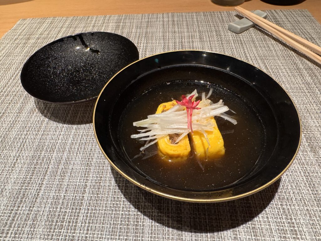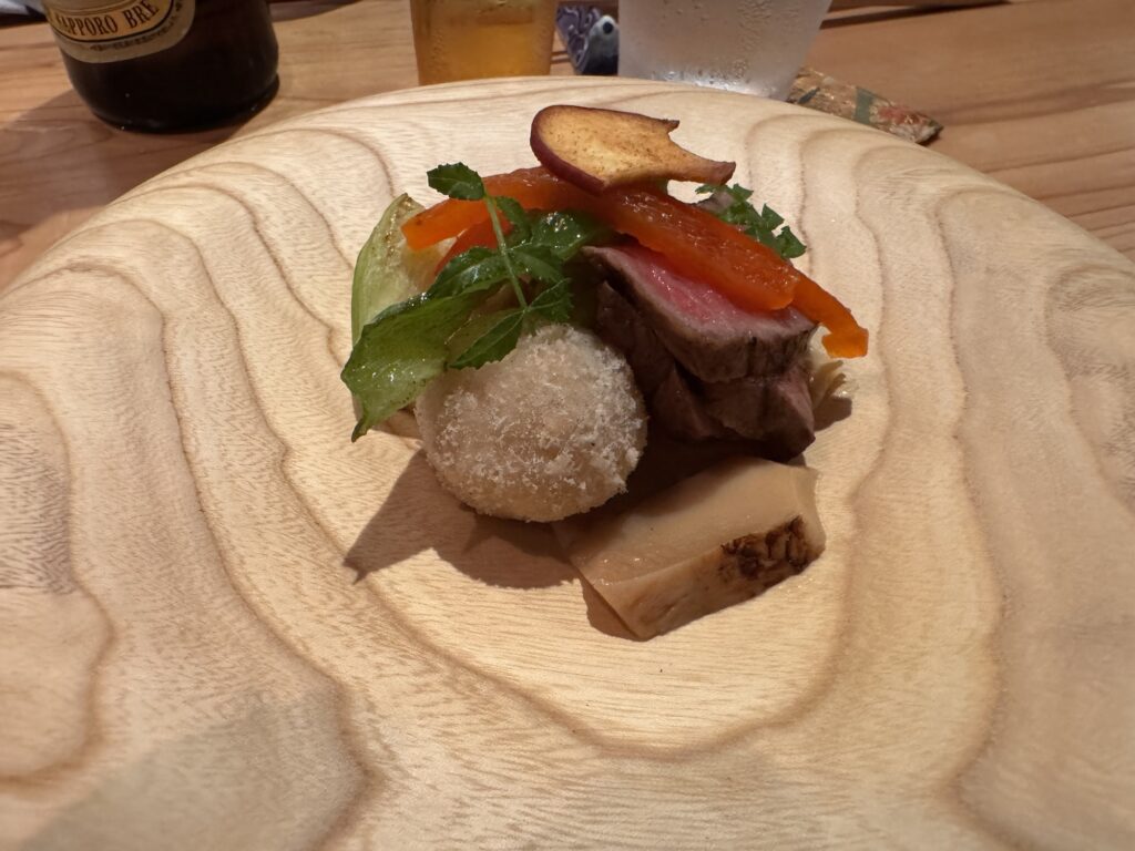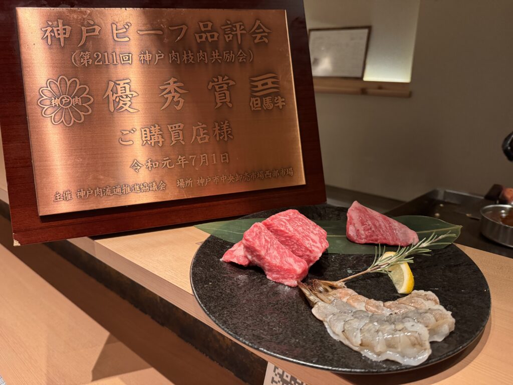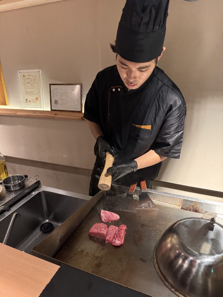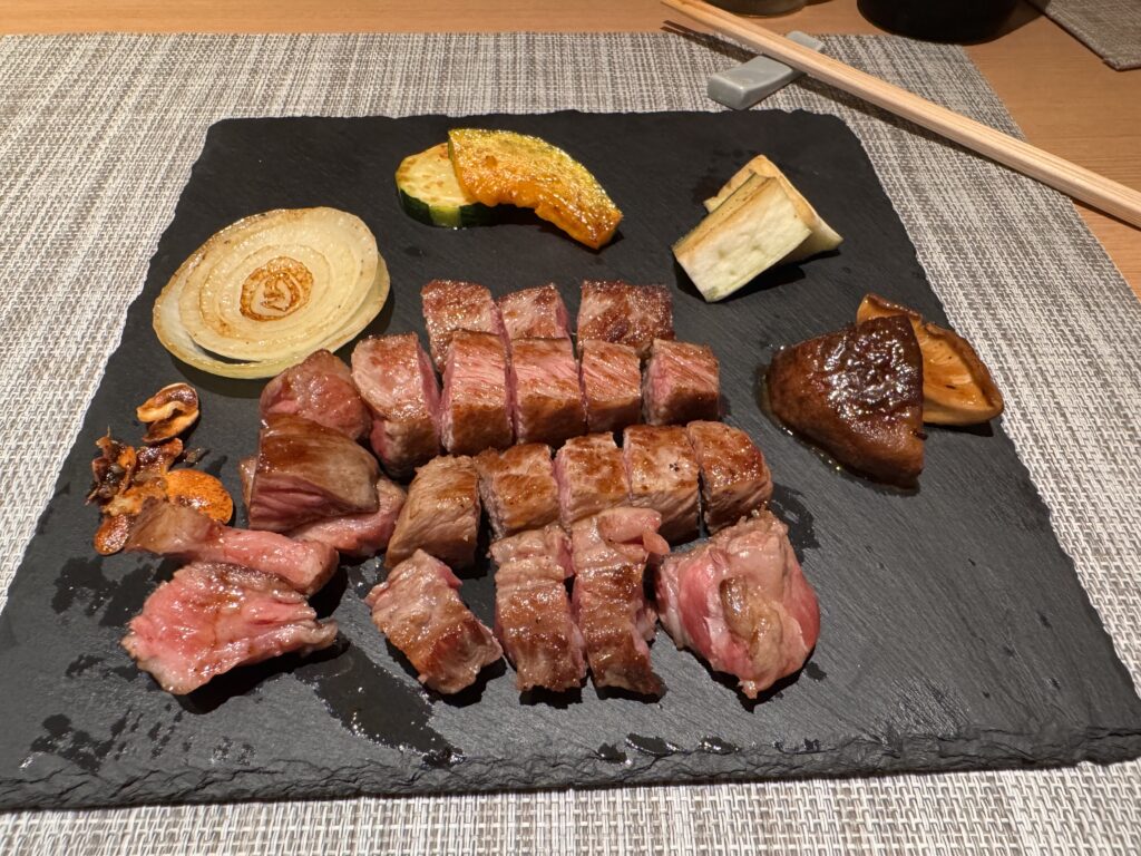 Das mit dem Kobe Rind hat mir keine Ruhe gelassen, auch wollte ich es einmal als Steak probieren, nicht als diese DIY-Scheibchen. Google spuckt Hibachi Kobe Beef Teppanyaki – Kyoto Station aus. Also gut, YOLO, probieren wir das einmal. Als ich noch etwas zögernd vor der Karte stehe, kommt eine freundliche Japanerin heraus – gerade sind sie voll, aber in 20 Minuten könnte ich gerne kommen. Es gibt standardmäßig ein Menu: Appetizer, Omelett mit Kobe Rind, Seafood Teppanyaki, Kobe Steak mit Gemüse, und dazu noch etwas Reis, danach ein Dessert. Preis steht keiner dabei. Der kommt dann auf der nächsten Seite, gestaffelt nach welchem Stück des Rindes und wie viel Gramm. Man kann auch x Gramm von einem Stück nehmen, und y Gramm von einem anderen. Über die Preise insgesamt breiten wir mal eine Deckmäntelchen des Schweigens, aber ich habe noch nie alleine für so viel Geld gegessen. Ich habe einen Platz an der Theke, direkt vor dem Teppanyaki-Koch. Das ganze Essen ist vorzüglich, und besonders das Fleisch. Ich muss allerdings gestehen, dass ich den Preis-Sprung von den Qualitäten des Vorabends auf ‚echtes‘ Kobe-Rind nicht wirklich verhältnismäßig finde, da zahlt man wohl auch für den Namen, wie bei Crémant Methode Champenoise auf echten Champagner.