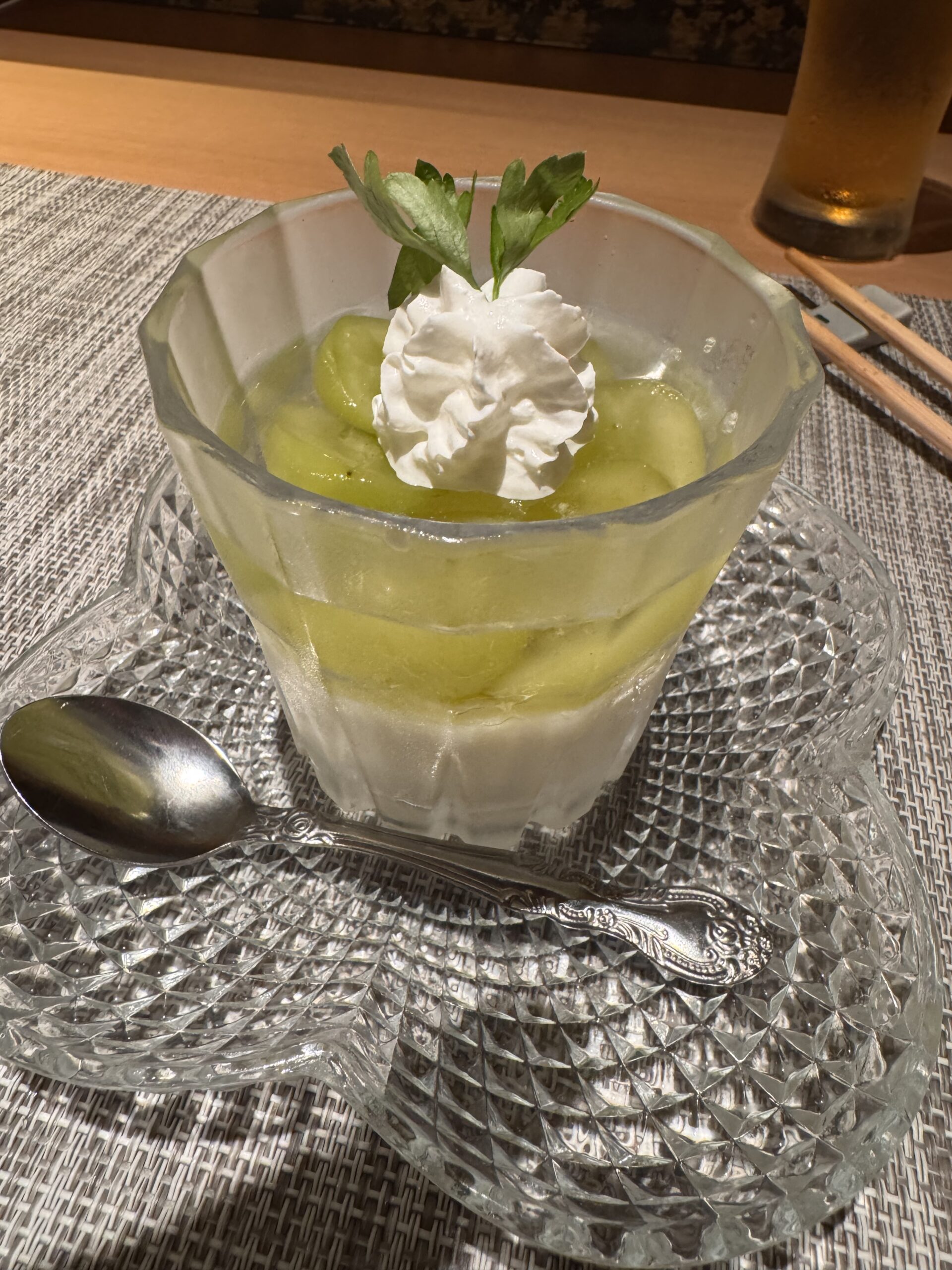 Witzig ist meine Bedienung, es ist ihr erster Tag. Sie liest die vorher sicher mühsam einstudierten Sätze von einem Smartphone ab. Witzig wird das bei den Vorspeisen, einem Teller mit einem verbogenen Löffel mit Melone-Schinken-Käse, einen mit goldfarbenem Zahnstocher aufgespießten Turm und etwas Thunfisch zwischen zwei Stück Gebäck. Sie erklärt die Speisen, und deutet dann auf den Löffel, und warnt mich mehrmals eindringlich „be careful with the skewer“. Ich hätte die Warnung, den Zahnstocher nicht mitzuessen eventuell gar nicht gebraucht, deshalb vergewissere ich mich. Aber sie lässt sich nicht beirren, deutet wieder auf den Löffel, und wiederholt careful – do not eat. Ich esse den Inhalt des Löffels besonders vorsichtig, aber da versteckt sich nichts hartes drin. Ich verschone sie mit den bei mir üblichen Wortwitzen.