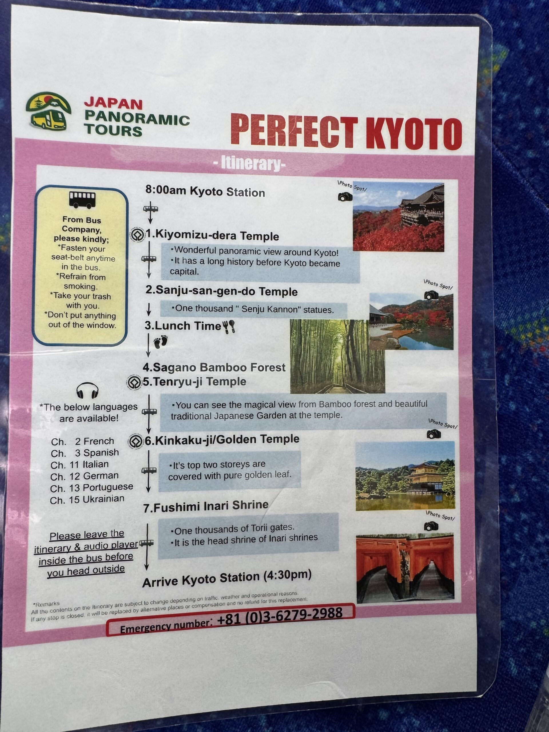 Nach dem Kochkurs gestern wäre eigentlich genug Zeit gewesen, noch den Kiyomizu-dera Tempel anzusehen, er wäre auch gar nicht so weit weg von der Küche gewesen. Stattdessen bin ich etwas durch die Stadt gelaufen, hab mir ’ne Jeans gekauft, und ein paar Souvenirs, bevor ich dann ins Hotel gegangen bin. So wird das nix. Also habe ich noch die „Perfect Kyoto Tour“ gebucht, mit allen (?) Weltkulturerbestätten Kyotos an einem Tag (es ist ja mein letzter in Japan). Genauso wie es klingt, so ist es auch gekommen.