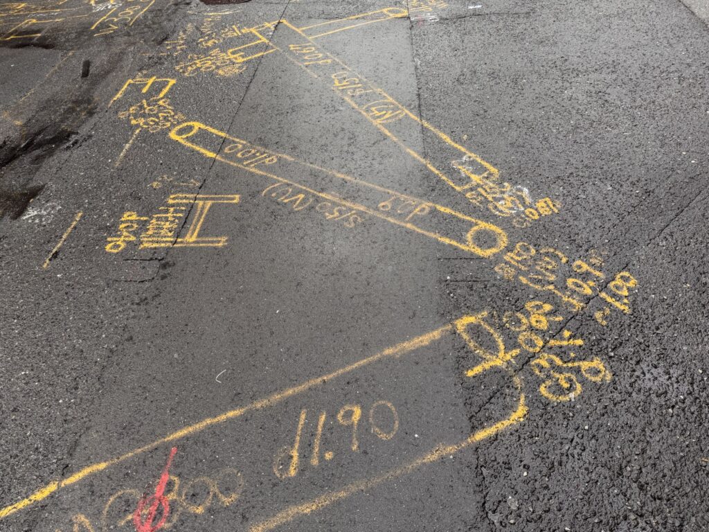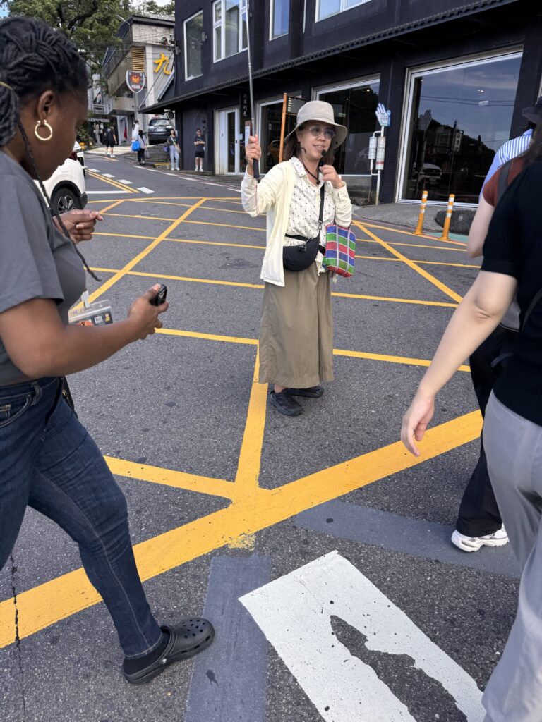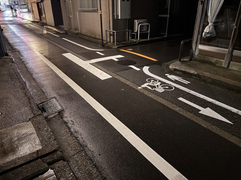 Die Gasse: hier würden keine zwei Autos aneinander vorbeipassen, in Europa würde man erwarten, dass sich hier die Verkehrsteilnehmen irgendwie sortieren; in Japan mit ihrer Höflichkeit sollte das noch besser funktionieren. Aber nein, akribisch genau sind Bereiche markiert, mit bepfeilten Richtungsspuren für Fahrräder und Fußgänger neben der Autospur. Auch die T-Einmündung ist extra markiert.