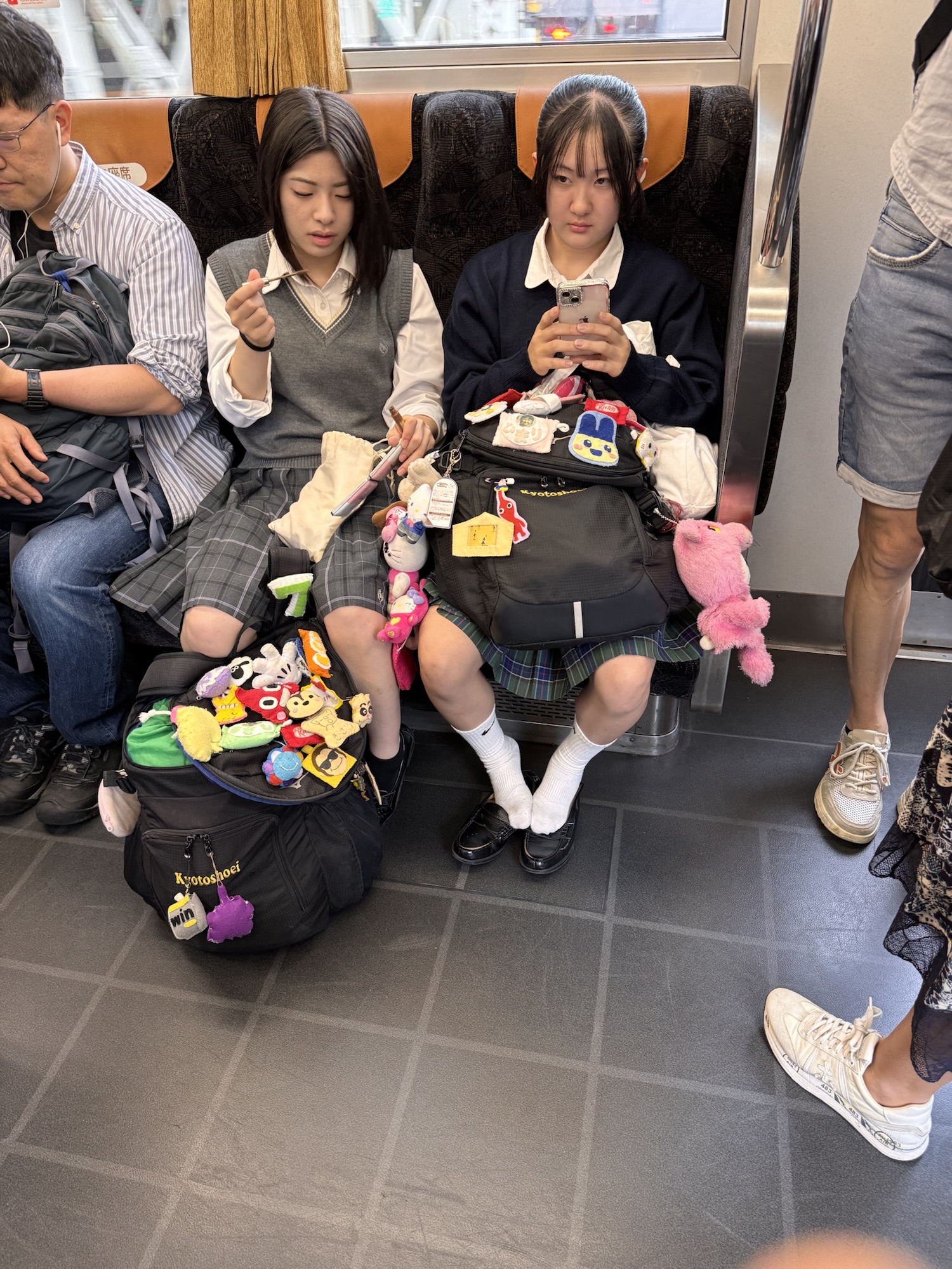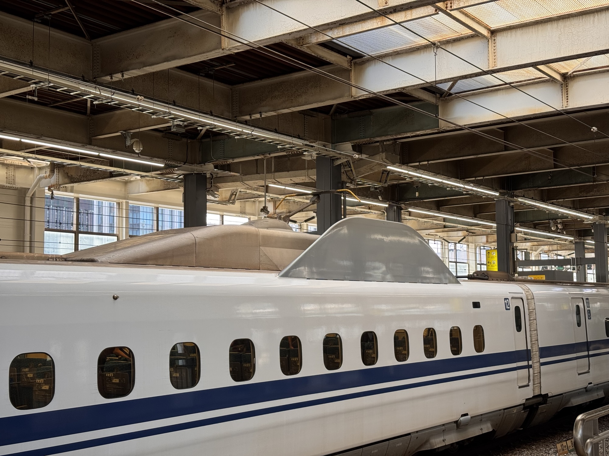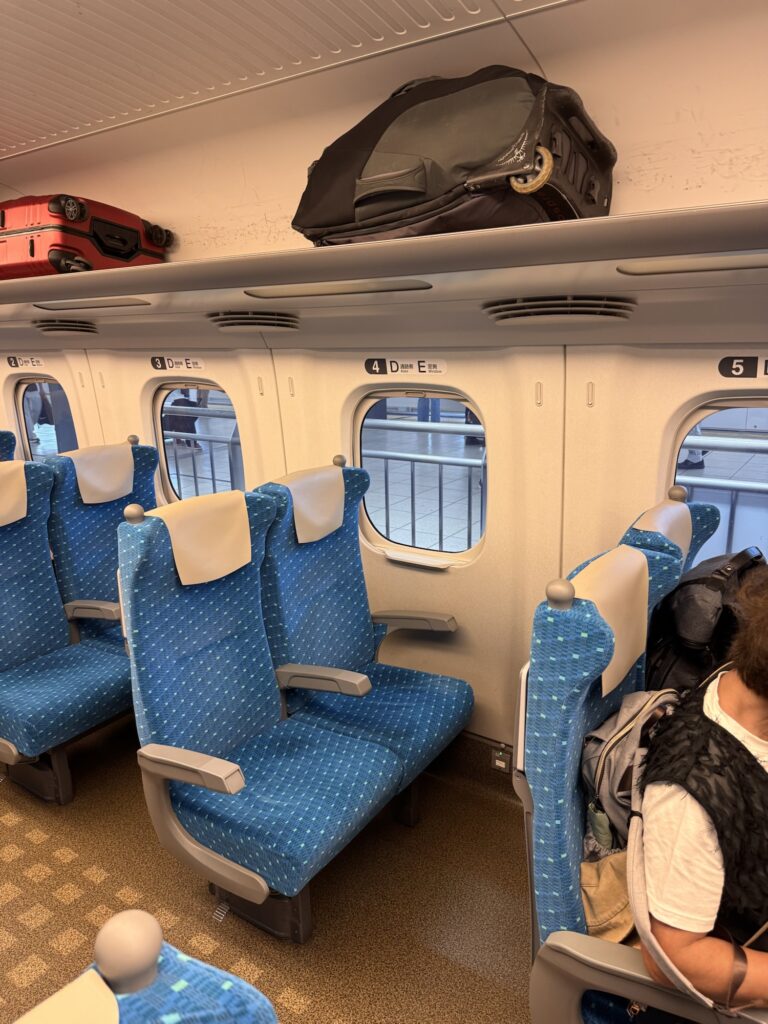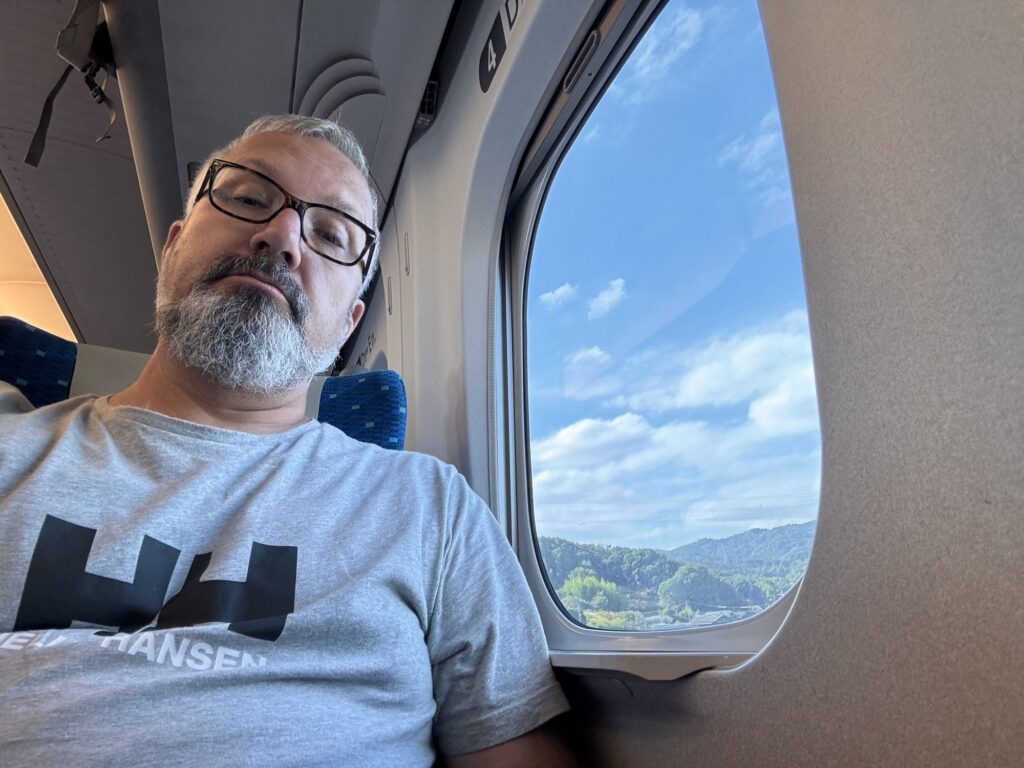 Shinkansen: Japan ist berühmt für seine Shinkansen-Züge. Schnell, modern, immer pünktlich. Ja schnell und pünktlich sind sie. Modern wirken sie gerade innen nicht mehr, sehr altbacken, mit eher kleinen Fenstern. Allerdings: offensichtlich sind alle Sitz(bänke) drehbar, so dass sie immer in Fahrtrichtung stehen. „Shinkansen“ bedeutet ‚Neue Hauptlinie‘ und ist eigentlich der Name für das ab 1964 neu aufgebaute Schienennetz in internationaler Normalspur statt der sonst in Japan üblichen Schmalspur. Um eine Relativierung zur deutschen Bahn vorzunehmen: Shinkansen sind auf ihren Schienen alleine, da kommt kein Vorortzug in die Quere. Die Pünktlichkeitsstatistik rechnet übrigens ‚force majeure‘-Ereignisse wie Starkregen und Schnee raus. Die Fensterplätze haben übrigens eine Nachteil: An jedem Fenster ist ein völlig nutzloses ca. 5cm breites Fensterbrett, was einem genau in den Oberarm drückt, wenn man kein schmales japanisches Krisperl ist.