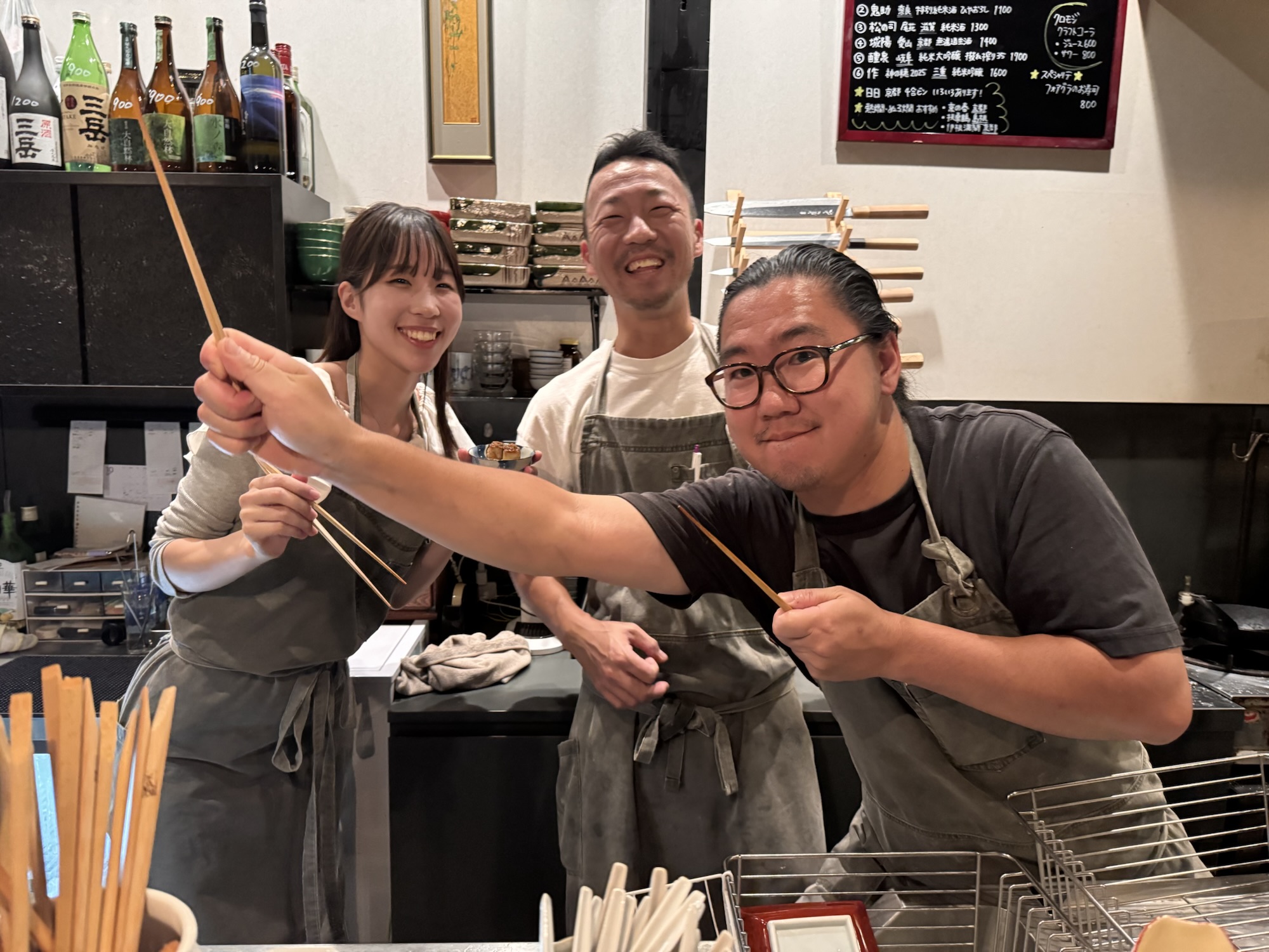 mit TintenfischAal, Sushi und Lachskaviar (im bunten)Fisch in SuppeGeräucheter Bonitomit Wagyuglibberig und leckerleckerer SakeNigiri mit gebratener GänseleberMisosuppe, Reis und FischKürbispudding (Foto vorher vergessen)Zum Nachtisch nochmal die Gänseleber bestelltDie SpeisenfolgeDäninFreunde kamenDas Restaurant-TeamMitsuki empfielt: ZakuFamilie?Abschluss-SelfieDie Gesellschaft