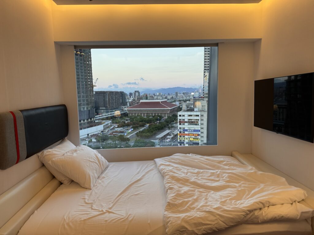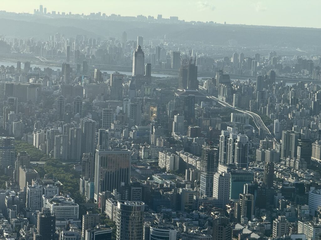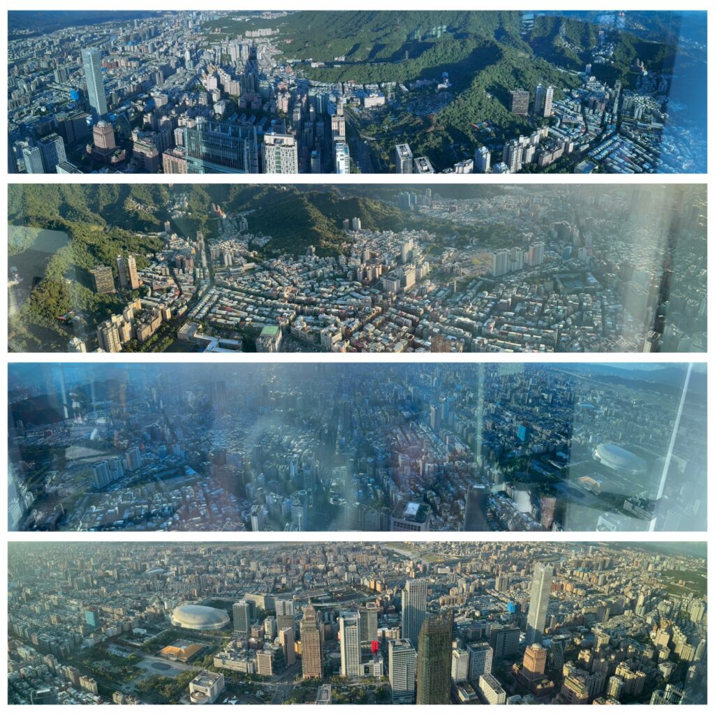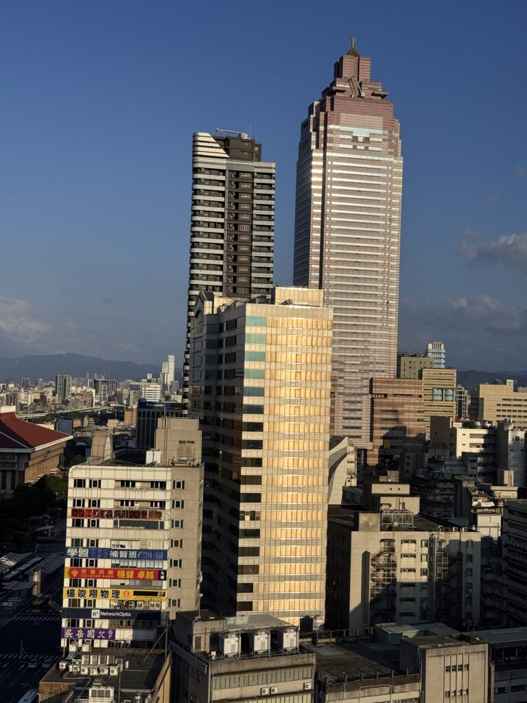 Mittwochmorgen verlasse ich mein Hotel in Kyoto und mache mich auf den Weg zum Kansai International Airport, der die gut zu merkende Kennung KIX hat. Mittlerweile habe ich eine gewisse Routine mit den öffentlichen Verkehrsmitteln, Vorortzug nach Osaka und dann einen Airport-Bus vom Bahnhof Umeda. Durch den Erwerb einer Wagyu-Krokette gebe ich mein letztes japanisches Bargeld aus, den kläglichen Rest auf meiner Suica-Karte setze ich an einem Automaten für einen Sprudel ein. Der Flug dauert gute drei Stunden, dann bin ich in Taipeh. Hier ist es nochmal ein Stück wärmer und feuchter; Puh. Ich habe mich ins CitizenM Hotel eingebucht, eine Viertelstunde Laufentfernung zum Hauptbahnhof. Dort bekomme ich ein kleines Zimmer im 20 Stock, und hätte einen direkten Blick auf das Taipeh 101 Gebäude – wenn da nicht auf halber Strecke das Ich-Bin-Im-Weg 60 Gebäude stehen würde. Trotzdem ein cooler Ausblick. Bei CitizenM denke ich sofort an „M – eine Stadt jagt einen Mörder“, aber meine Zeit im Hotel bleibt ruhig. Da Hotel versucht möglichst modern zu sein, wir sind ja alle so coole travelling citizens. Das Zimmer lässt sich mittels des zur Verfügung gestellten iPads steuern, ich probiere am nächsten Morgen die Stimmung „Fokus“ aus, aber hab nach kurzer Zeit eher die Stimmung ‚genervt‘. Auf dem Bildschirm laufen psychedelische Muster, die Decke des Bades (mit einer lichtdurchlässigen Scheibe vom Rest vom Zimmer abgetrennt) zeigt welche Farbkombinationen sich mit modernen RGB LEDs erzeugen lassen.