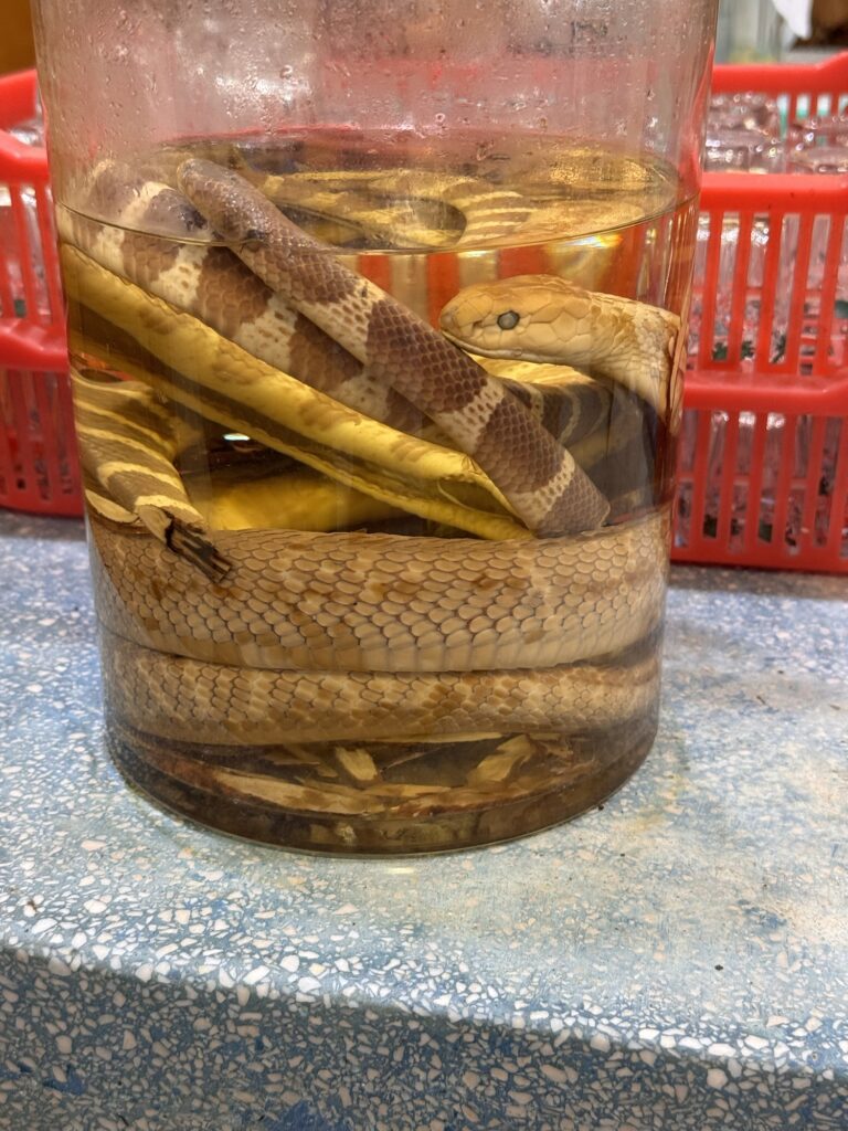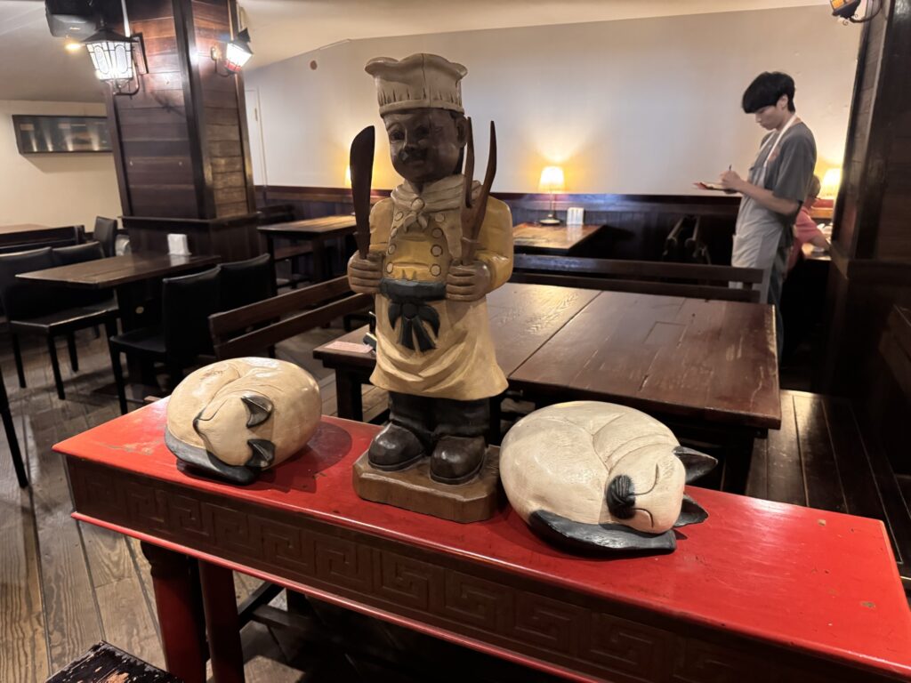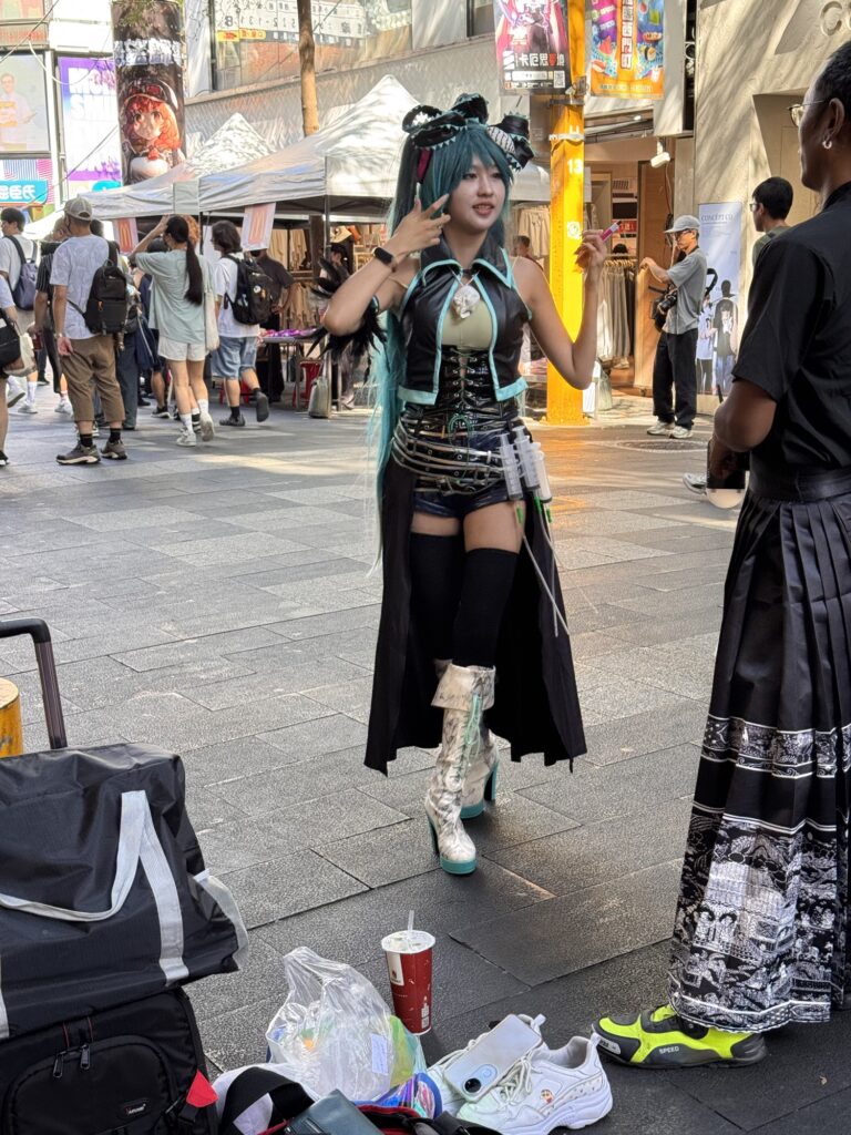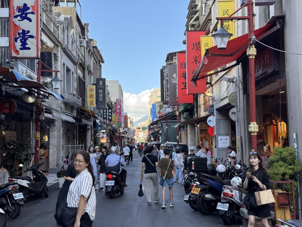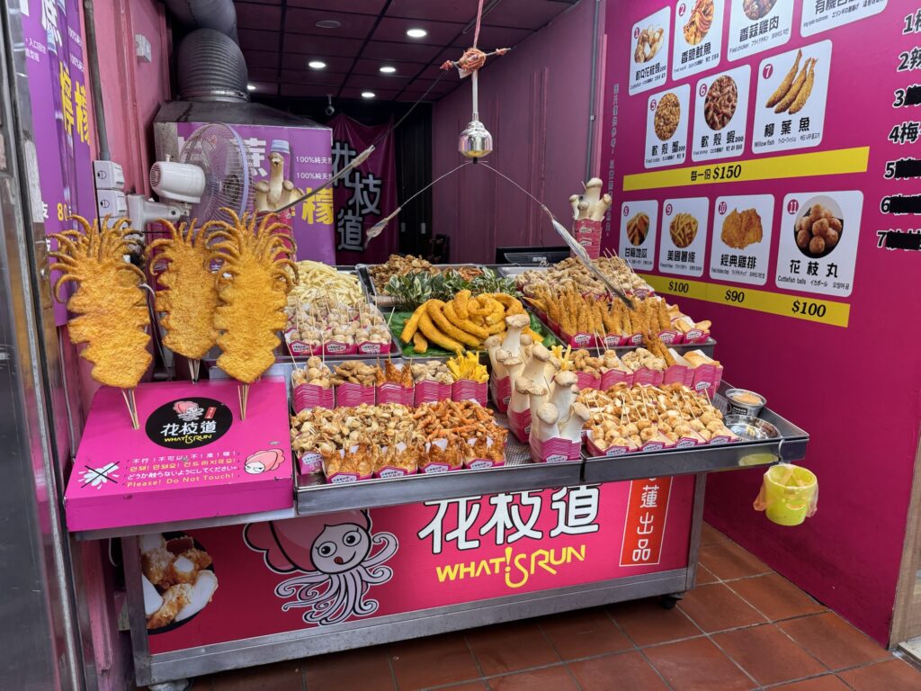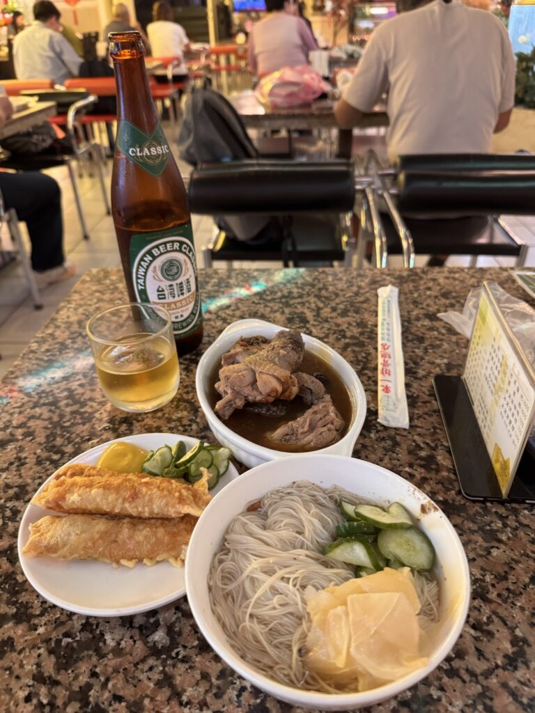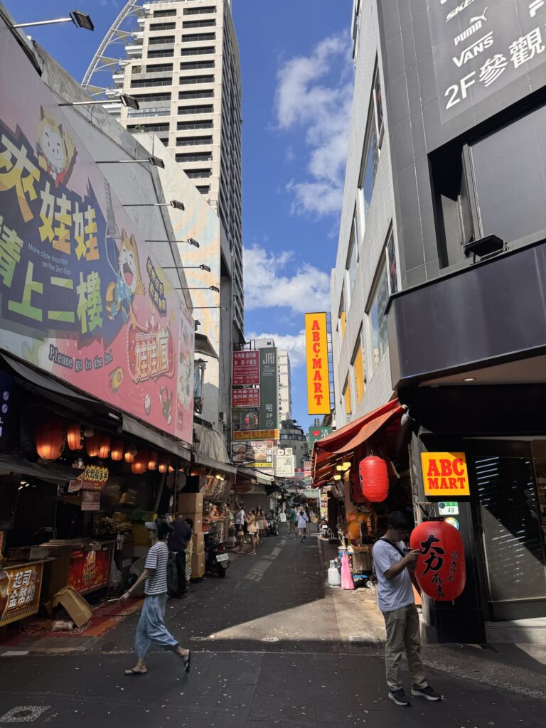 Ich bekomme Hunger. Eigentlich gibt es viel in der Umgebung, aber die meisten Restaurants sind dann japanisch, koreanisch, amerikanisch oder sonstwas. Taiwanesisch und gut bewertet sind nicht so viele. Ich suche und finde Dong Yi Pork Chop Main Store, etwas versteckt im 2. Stock. Nix auf der Speisenkarte macht mich so richtig an, am Ende nehme ich etwas Chicken. Es kommen ein paar Stücke Huhn in einer Brühe, in der noch zwei Würfel schwimmen, die evtl. Blutwurst sein könnten. Es ist wahrlich chinesisch, die Hühnerteile mit Knochen, eher zu gewichtig um sie von den Stäbchen zu essen, aber halt auch suppennass. Immerhin habe ich noch ein paar frittierte Shrimps bestellt, die sind uneingeschränkt lecker. Ca. 60 Sekunden nachdem das Essen auf dem Tisch steht, kommt die Überraschung. Der Kellner fordert sofortige Barzahlung. Ooops. Ich mache ihm klar, dass ich kein Bargeld habe, und dass ich jetzt erst esse, und wir das dann klären. Nach dem Essen hinterlasse ich meinen Personalausweis als Pfand und hole im 7-11 gegenüber am Geldautomaten genügend Bargeld für die nächsten drei Tage (Spoiler: ich bleibe vier). Das Hotel liegt im HiFi/Audio-Viertel. Fast jeder zweite Laden verkauft teure Kopfhörer, teure Verstärker und noch teurere Lautsprecher. Ich schwitze mich zum Hotel zurück, und nutze die Happy Hour für zwei Cocktails. Dann verziehe ich mich in mein kühles Zimmer – eine Wohltat – und plane ein wenig. Für den nächsten Abend buche ich eine Food-Tour, damit ich an den restlichen Abenden weiß, was mir schmeckt. Da ich auch andere Touren gebucht habe, lasse ich den Donnerstag gechillt angehen. Also Ausschlafen, ein bisserl am Laptop machen, mittags einen kleinen Ausflug in das XiMen Viertel zum Essen (nicht begeistert, aber ok).