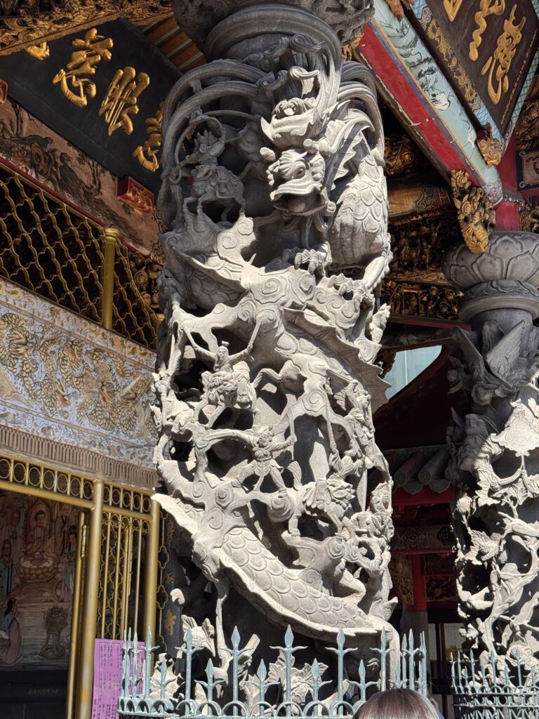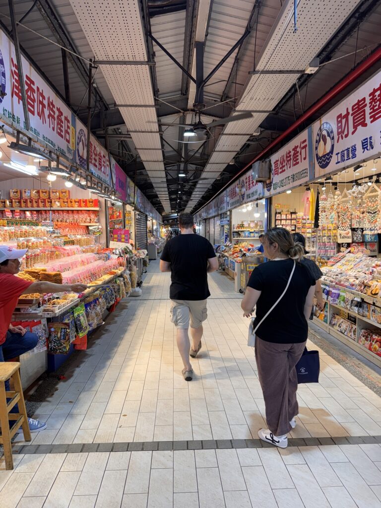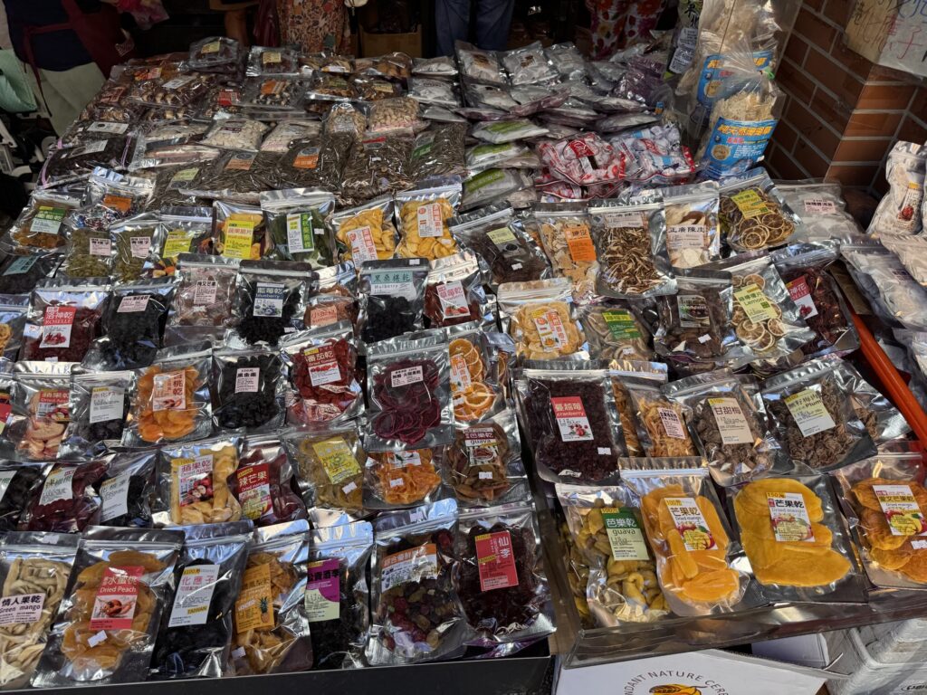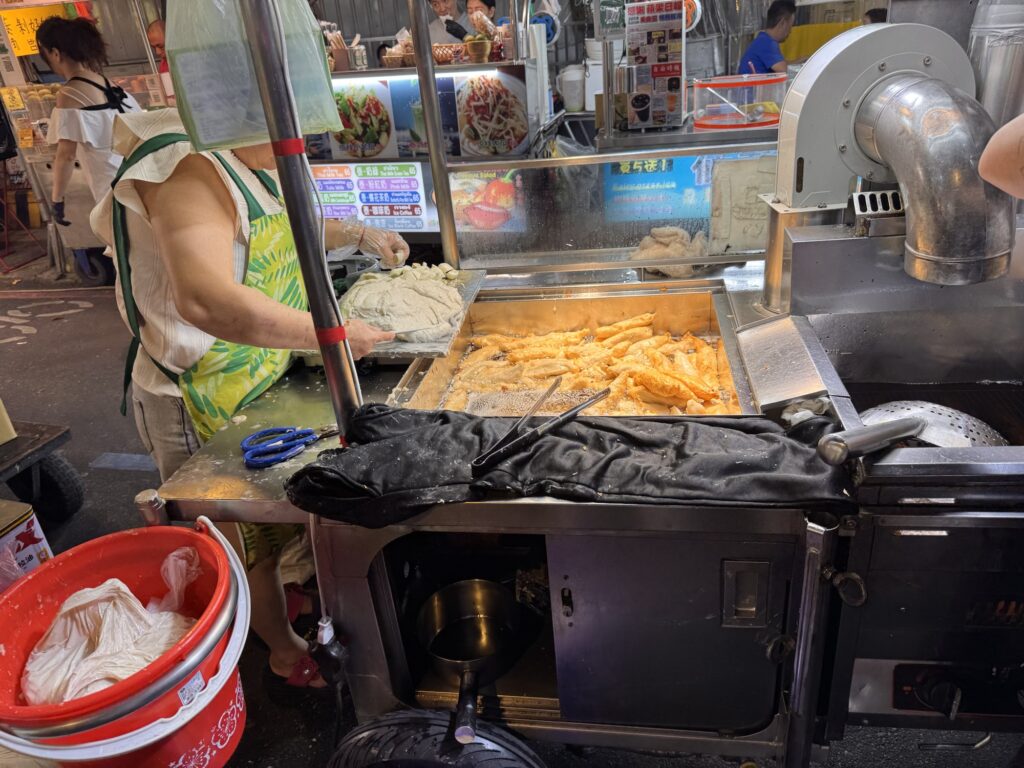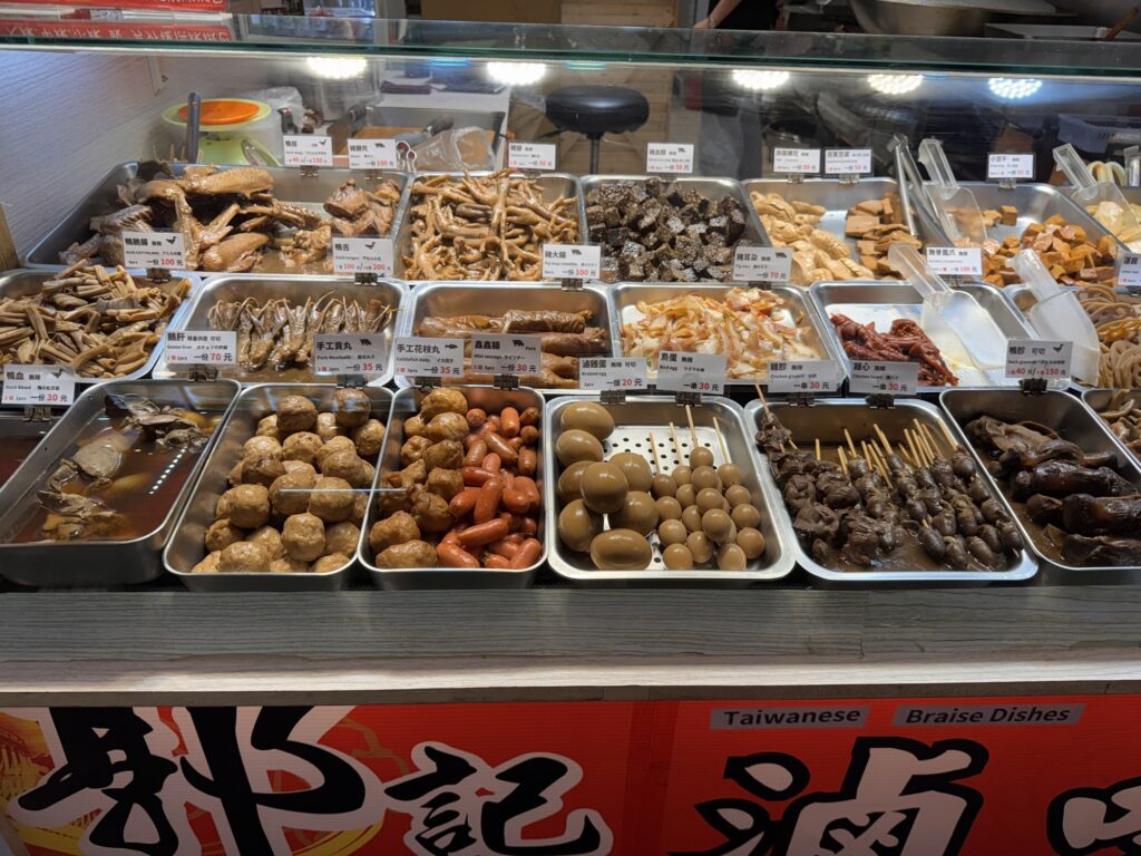 Treffpunkt für die Food-Tour ist 19:30 am Longshan Tempel, statt der avisierten Cyndi empfängt mich ein Vincent, und unsere Gruppe besteht nur aus vier Gästen. Los geht’s. War ’ne sinnvolle Idee. Alleine hätte ich nicht wirklich verstanden, was es genau ist, dass die ganzen Streetfood Stalls zu bieten haben. Als erstes gibt es einen Oyster-Pancake, eher eierlastig. Interessant, aber wird nicht mein Favorite. Zwischenzeitlich erzählt Vincent ein wenig, er ist in den USA geboren, sein chinesischer Vater kam zurück nach Taiwan, als man dort zum Aufbau der Halbleiterindustrie Fachkräfte suchte. Der Markt hier ist zwischen der alten Innenstadt und dem Fluss, und früher waren hier viele einfacher Arbeiter unterwegs. Die durften ihre Familien nicht mitbringen, aus Angst vor zu viel Aufmüpfigkeit, deshalb war das auch lange Zeit ein Rotlichtviertel. Roter Lichter gibt’s auch noch, aber sie blinken im Takt abwechselnd mit blauen und grünen. Was es aber noch gibt sind einige Massagesalons (ohne happy end), und ein paar DVD-Läden der eindeutigeren Art. Es geht weiter, zu einer dickflüssigen Suppe, gut gestärkt mit Tinten- und normalem Fisch. Auch die Suppe kommt nicht in die Top 10. Offensichtlich hat der Tourenveranstalter mit einigen Läden hier special Deals, vor einem Laden für Suppen-Dumplings bekommen wir fast im Vorbeilaufen ein Tablett mit vier Teigtaschen kredenzt. Da zwei unserer Gäste kein Schweinefleisch essen (Schade, eigentlich), bekommen Emily und ich jeweils zwei. Die Teigtaschen enthalten auch Brühe, und der Guide verrät den Trick: die erkaltete Brühe ist fest genug, dass man etwas davon mit in die Taschen packen kann, welche sich dann beim Garen wieder verflüssigt. Danach mal wieder ein Laden zum Hinsetzen. Es gibt Reis mit geschmortem Schweinefleisch, Kraut, Bambus-Sprossen, gebratener Tofu und ein hartgekochtes Entenei. Eher so meines, aber langsam stellt sich auch ein Sättigungsgefühl ein. Danach noch die Mutprobe: Stinky Tofu. Seinen Namen hat der fermentierte Bohnenkuchen redlich verdient. Er stinkt nicht nur am Tisch hinter dem Verkäufer, sondern strahlt auch auf die Stände daneben aus. Dennoch, probiert muss er werden, denke ich mir. Interessant, deutliche Ammoniak-Noten. Wir haben die gebratene Variante bekommen, da verfliegt schon ein Teil der etherischen Öle, und das finde ich nicht schlecht. Auch das werde ich mir nicht selber bestellen, aber gut es mal probiert zu haben. Noch ein kurzer Ausflug in die auch in Taiwan allgegenwärtigen Convenience Stores. Hier ist mir eine Packung Erdnussflips in Erinnerung geblieben, deren Namen übersetzt so viel wie ‚benimm Dich‘ bedeutet. Die manchmal etwas abergläubischen Chinesen essen sie nicht nur, sondern verwenden auch die vollen Packungen um die ‚Maschinengötter‘ zu besänftigen. Offensichtlich liegt gerne auch auf High-Tech-Maschinen eine Packung davon, damit sich die Maschine benimmt. Tatsächlich liegt in unserem Tourbus am nächsten Tag eine offensichtlich nicht zum Verzehr gedachte Packung ‚Benimm Dich‘ in der Gepäckablage. Es hat wohl schon öfters unter Gepäck gelitten, das Gebäck. Mein Abschluss ist dann noch ein frittierter Fischteig am Stiel, die anderen bekommen noch einen Ice-Cream Burrito, auf den ich verzichte. Fazit: Interessant, aber taiwanesisches Essen wird nicht meine Lieblingsküche. Wobei – wegen der bewegten Geschichte gibt es in Taiwan Flüchtlinge aus ganz China, die jeweils ihre eigenen Gerichte mitgebracht haben. Wahrscheinlich muss man nur die Ecke mit den Geflüchteten aus der Provinz Sichuan finden, und alles ist wieder gut.