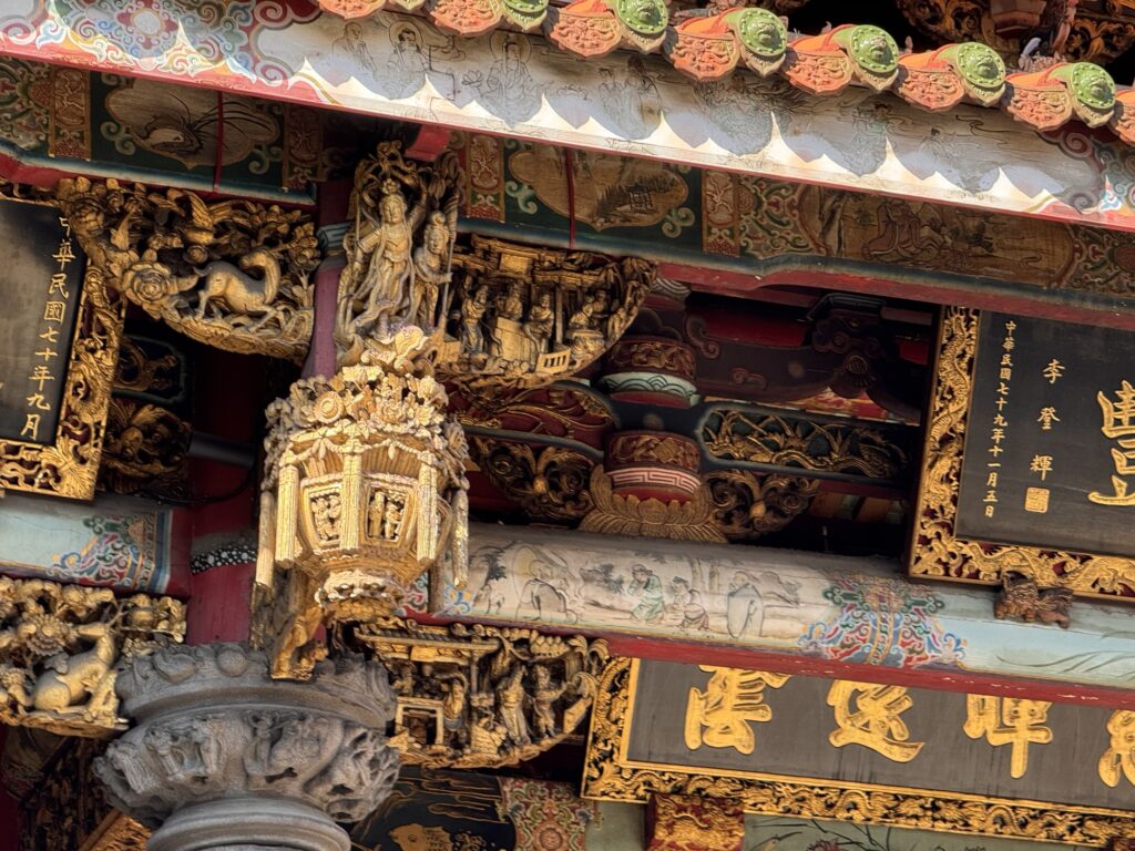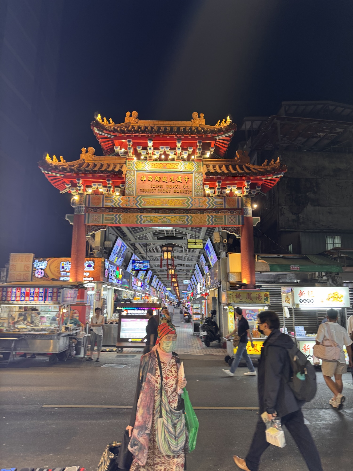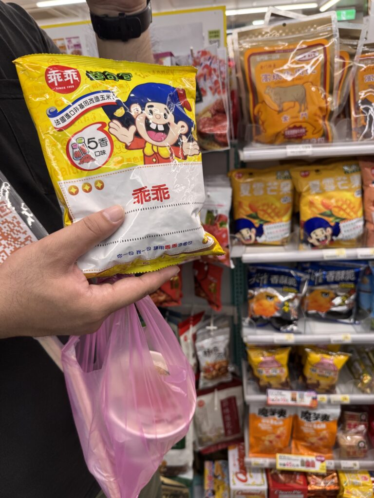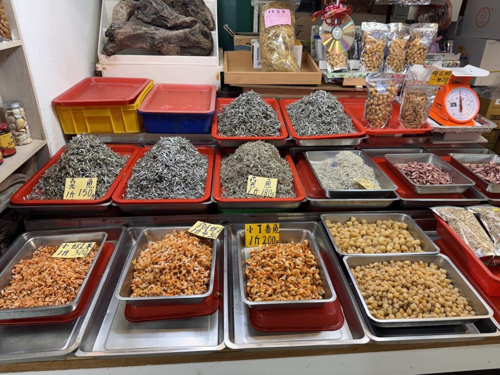 Treffpunkt für die Food-Tour ist 19:30 am Longshan Tempel, statt der avisierten Cyndi empfängt mich ein Vincent, und unsere Gruppe besteht nur aus vier Gästen. Los geht’s. War ’ne sinnvolle Idee. Alleine hätte ich nicht wirklich verstanden, was es genau ist, dass die ganzen Streetfood Stalls zu bieten haben. Als erstes gibt es einen Oyster-Pancake, eher eierlastig. Interessant, aber wird nicht mein Favorite. Zwischenzeitlich erzählt Vincent ein wenig, er ist in den USA geboren, sein chinesischer Vater kam zurück nach Taiwan, als man dort zum Aufbau der Halbleiterindustrie Fachkräfte suchte. Der Markt hier ist zwischen der alten Innenstadt und dem Fluss, und früher waren hier viele einfacher Arbeiter unterwegs. Die durften ihre Familien nicht mitbringen, aus Angst vor zu viel Aufmüpfigkeit, deshalb war das auch lange Zeit ein Rotlichtviertel. Roter Lichter gibt’s auch noch, aber sie blinken im Takt abwechselnd mit blauen und grünen. Was es aber noch gibt sind einige Massagesalons (ohne happy end), und ein paar DVD-Läden der eindeutigeren Art. Es geht weiter, zu einer dickflüssigen Suppe, gut gestärkt mit Tinten- und normalem Fisch. Auch die Suppe kommt nicht in die Top 10. Offensichtlich hat der Tourenveranstalter mit einigen Läden hier special Deals, vor einem Laden für Suppen-Dumplings bekommen wir fast im Vorbeilaufen ein Tablett mit vier Teigtaschen kredenzt. Da zwei unserer Gäste kein Schweinefleisch essen (Schade, eigentlich), bekommen Emily und ich jeweils zwei. Die Teigtaschen enthalten auch Brühe, und der Guide verrät den Trick: die erkaltete Brühe ist fest genug, dass man etwas davon mit in die Taschen packen kann, welche sich dann beim Garen wieder verflüssigt. Danach mal wieder ein Laden zum Hinsetzen. Es gibt Reis mit geschmortem Schweinefleisch, Kraut, Bambus-Sprossen, gebratener Tofu und ein hartgekochtes Entenei. Eher so meines, aber langsam stellt sich auch ein Sättigungsgefühl ein. Danach noch die Mutprobe: Stinky Tofu. Seinen Namen hat der fermentierte Bohnenkuchen redlich verdient. Er stinkt nicht nur am Tisch hinter dem Verkäufer, sondern strahlt auch auf die Stände daneben aus. Dennoch, probiert muss er werden, denke ich mir. Interessant, deutliche Ammoniak-Noten. Wir haben die gebratene Variante bekommen, da verfliegt schon ein Teil der etherischen Öle, und das finde ich nicht schlecht. Auch das werde ich mir nicht selber bestellen, aber gut es mal probiert zu haben. Noch ein kurzer Ausflug in die auch in Taiwan allgegenwärtigen Convenience Stores. Hier ist mir eine Packung Erdnussflips in Erinnerung geblieben, deren Namen übersetzt so viel wie ‚benimm Dich‘ bedeutet. Die manchmal etwas abergläubischen Chinesen essen sie nicht nur, sondern verwenden auch die vollen Packungen um die ‚Maschinengötter‘ zu besänftigen. Offensichtlich liegt gerne auch auf High-Tech-Maschinen eine Packung davon, damit sich die Maschine benimmt. Tatsächlich liegt in unserem Tourbus am nächsten Tag eine offensichtlich nicht zum Verzehr gedachte Packung ‚Benimm Dich‘ in der Gepäckablage. Es hat wohl schon öfters unter Gepäck gelitten, das Gebäck. Mein Abschluss ist dann noch ein frittierter Fischteig am Stiel, die anderen bekommen noch einen Ice-Cream Burrito, auf den ich verzichte. Fazit: Interessant, aber taiwanesisches Essen wird nicht meine Lieblingsküche. Wobei – wegen der bewegten Geschichte gibt es in Taiwan Flüchtlinge aus ganz China, die jeweils ihre eigenen Gerichte mitgebracht haben. Wahrscheinlich muss man nur die Ecke mit den Geflüchteten aus der Provinz Sichuan finden, und alles ist wieder gut.