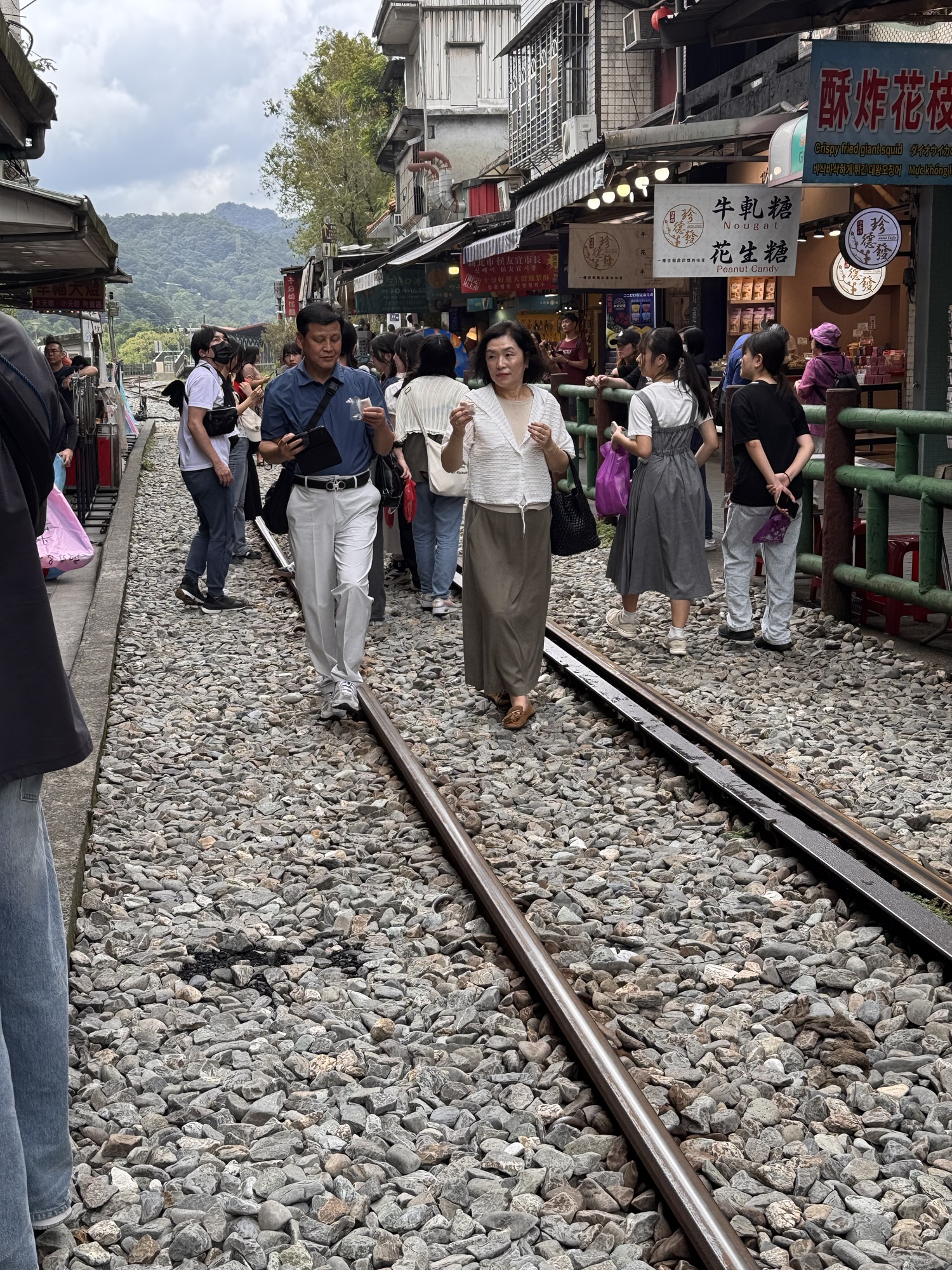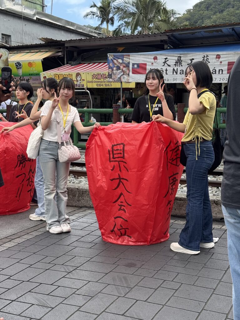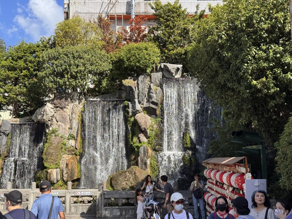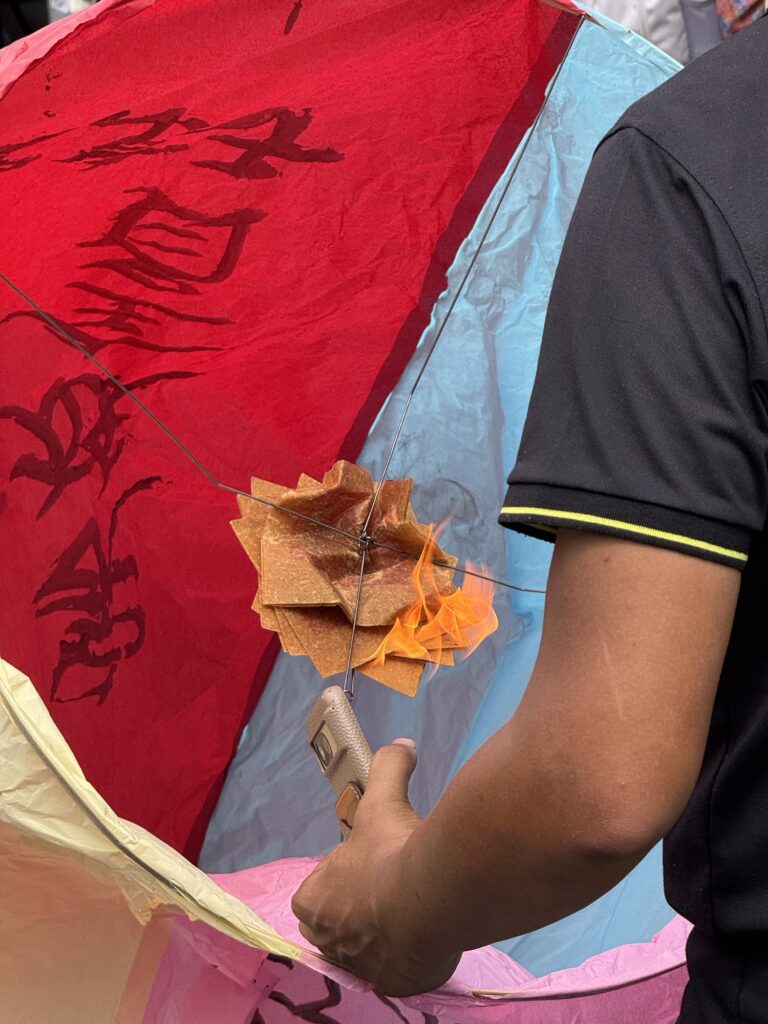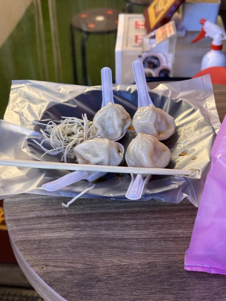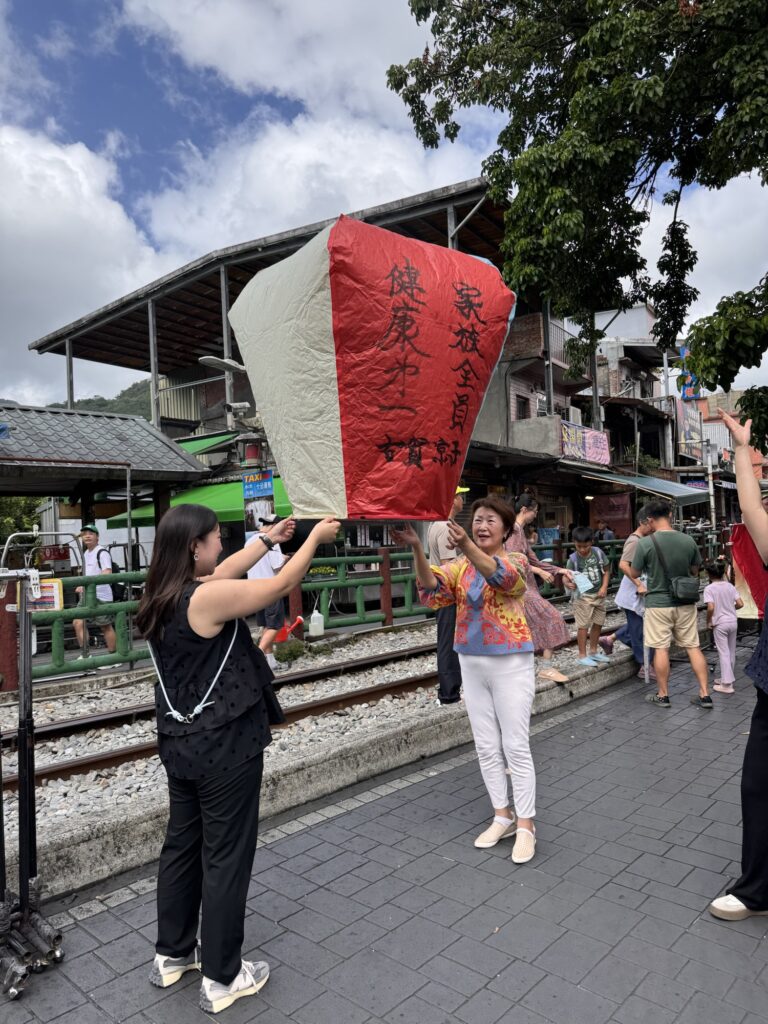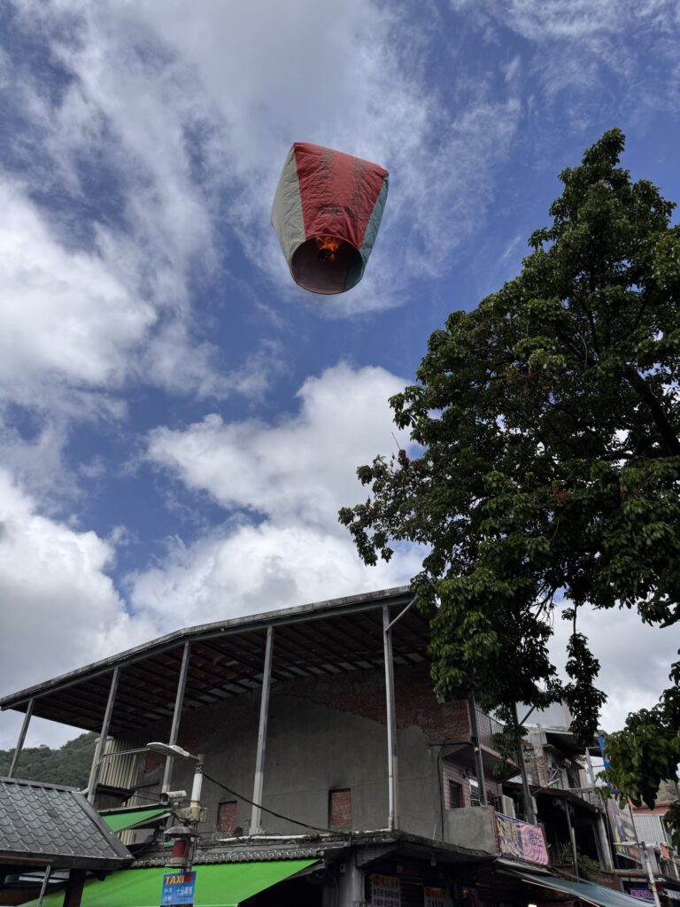 Erster Stopp ist der Wasserfall in Shifen. Der Wasserfall ist etwas unterwältigend. Vielleicht habe ich auch einfach schon zu viele große gesehen, und dass aktuell nicht Regenzeit ist, hilft auch nicht. Ich verwende absichtlich nicht den Begriff Trockenzeit, so sieht’s nämlich nicht aus. Danach geht’s weiter nach Shifen Old Town, wo Teilnehmer eine Himmelslaterne vorbestellen konnten. Man kennt die Dinger; an einem der letzten Silvester hat damit eine Frau in Krefeld das Affengehege abgefackelt. Hier in Shifen haben sie keine solchen Sorgen; Waldbrandgefahr: SEHR gering. Pauline hat auch ein wenig erklärt, warum es unproblematisch ist, wenn jeden Tag hunderte von den Dingern in den umliegenden Wäldern landen, aber mich überzeugt das nicht. In Shifen esse ich ein paar gebratenen Teigtaschen, erst später erfahre ich aus dem Gruppenchat, dass wir besonders lange in dem nächsten Dorf bleiben, damit alle dort Zeit haben zu essen.