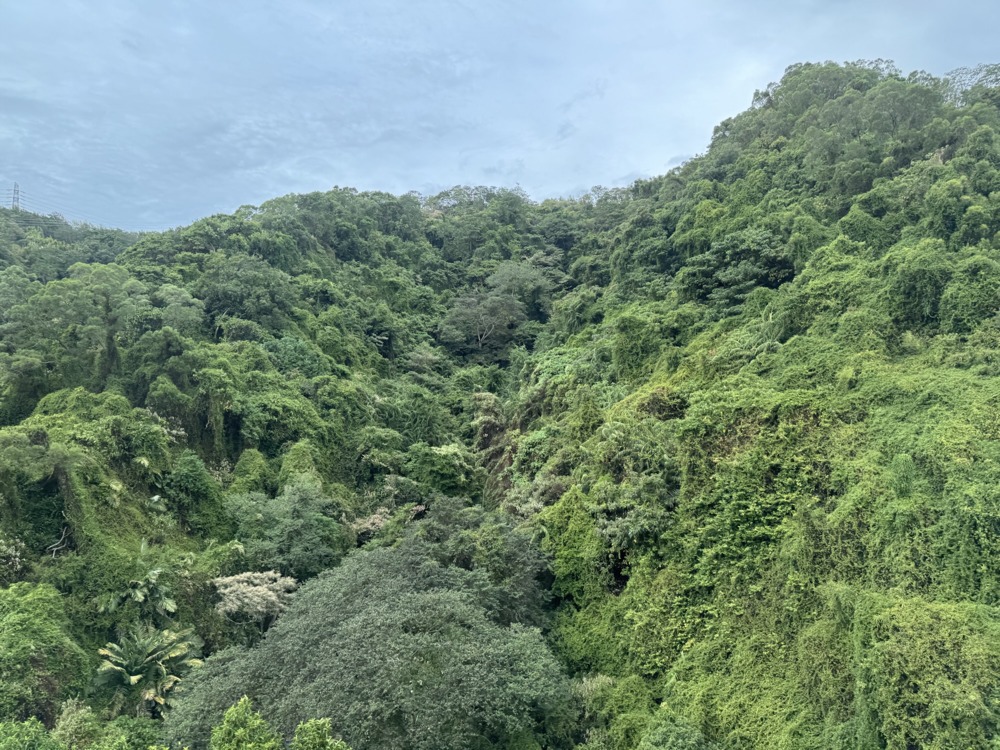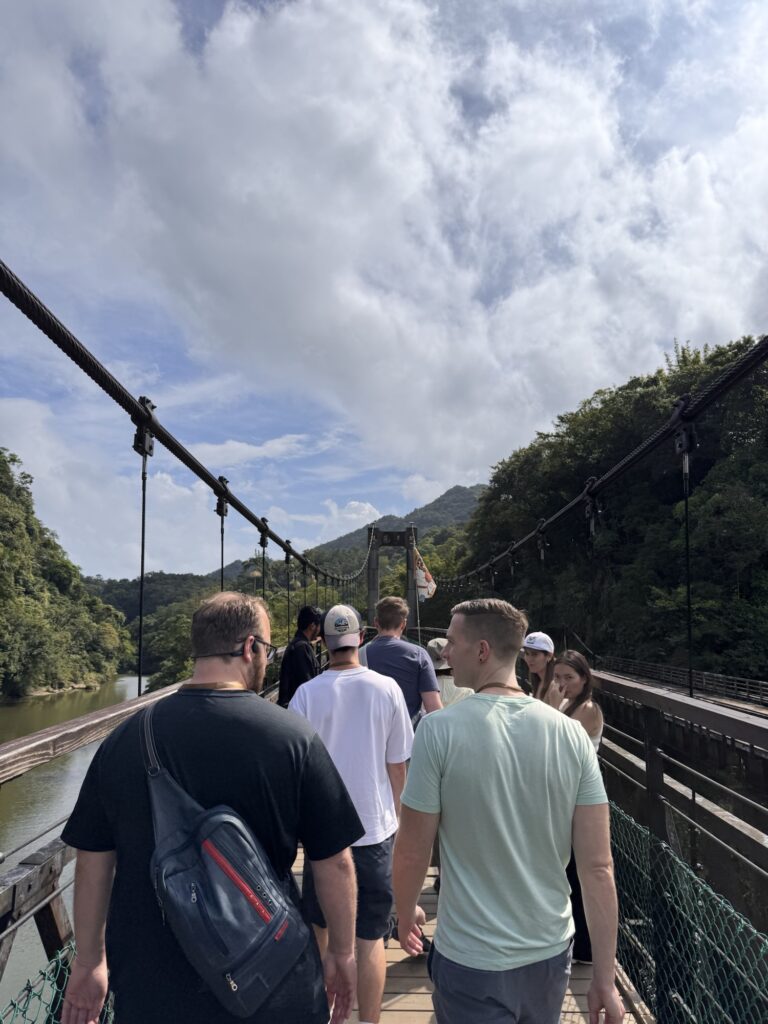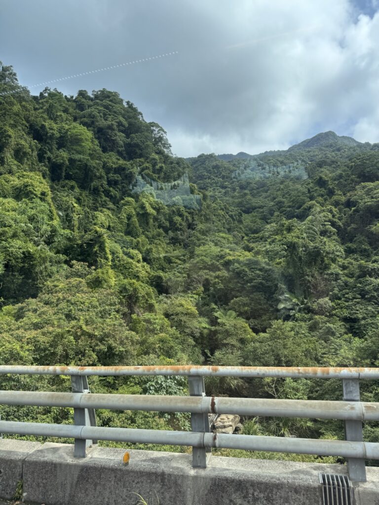 Auf dem Land wird noch deutlicher, dass wir hier in den Tropen sind. Bergig, mit einer wuchernden Vegetation die einen undurchdringlichen Dschungel bildet. Was der Mensch aufgebaut hat, die Natur versucht es sich wiederzuholen; das erste Zeichen ist meiste eine schwarze Schimmelsicht. Was mir sehr schnell auf die Nerven geht, ist unser Bus. Ungefähr die Hälfte der Zeit ertönt ein lautes Piepen, so wie manche Nutzfahrzeuge ihre Absicht signalisieren, jetzt rückwärtszufahren. Aber wirklich die Hälfte der Zeit, die ganz Fahrt lang.