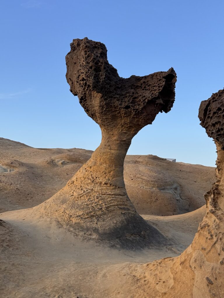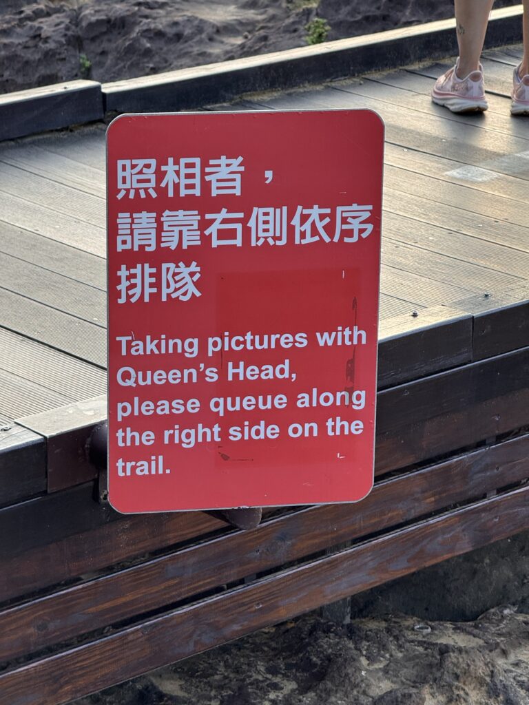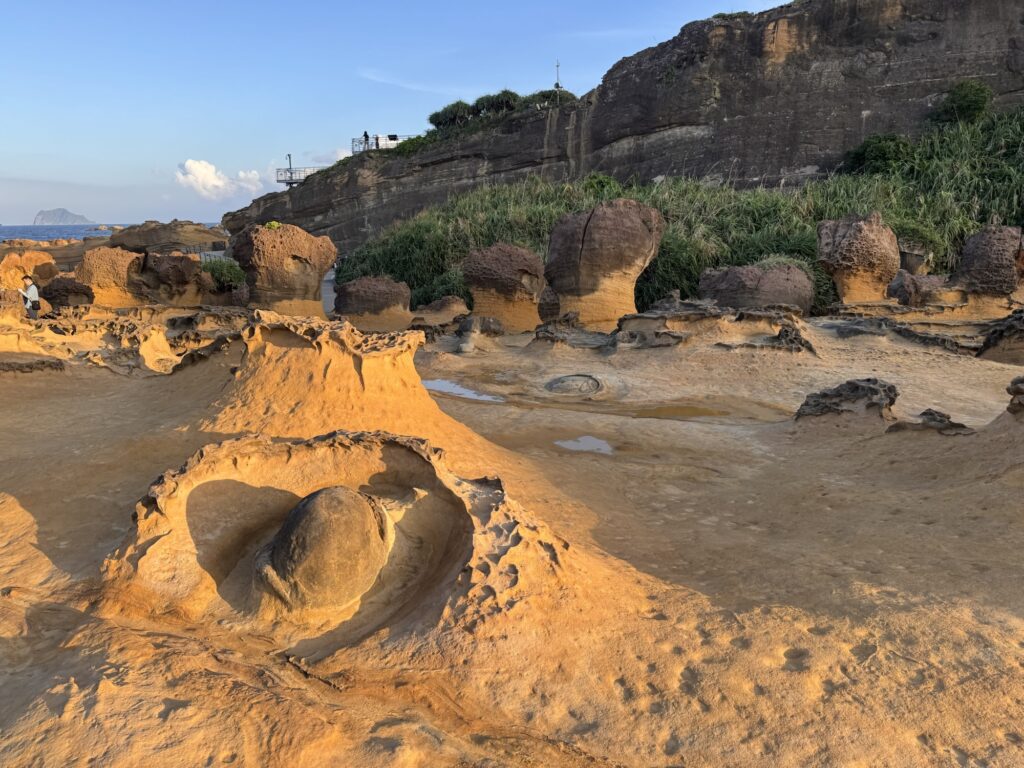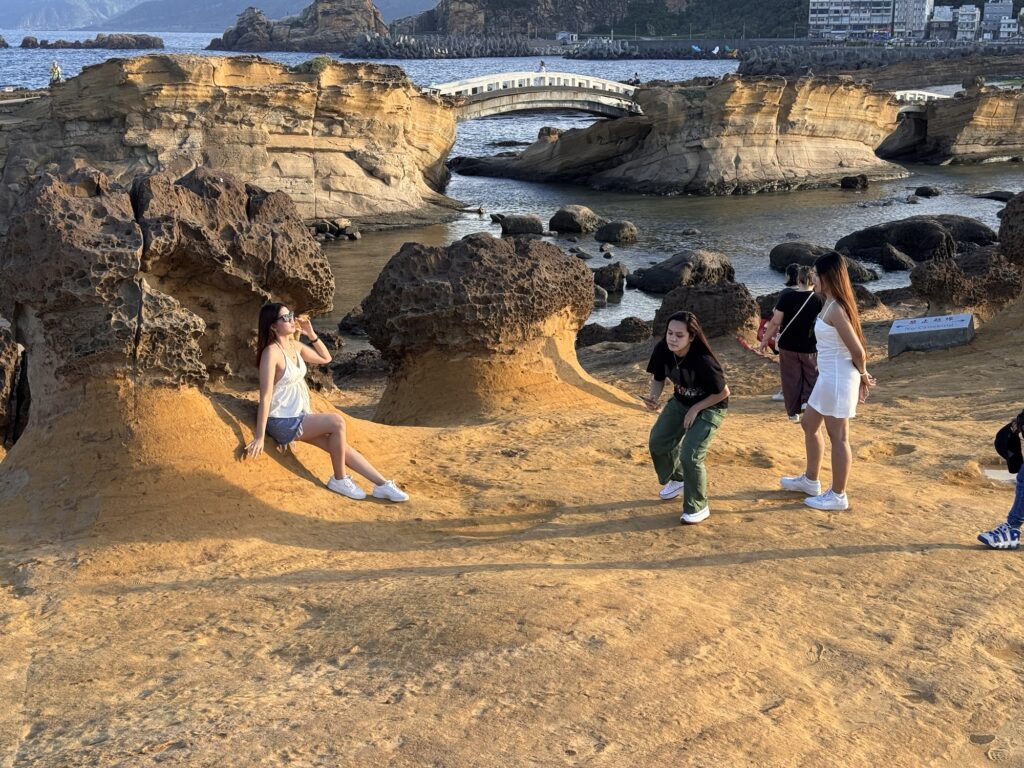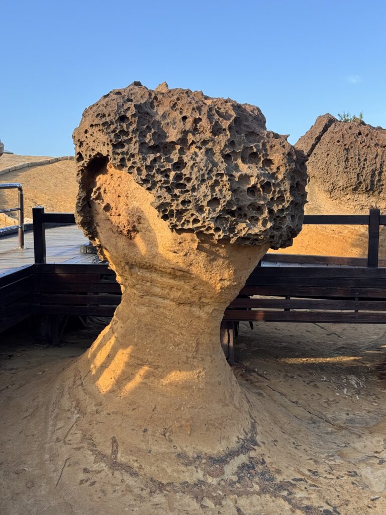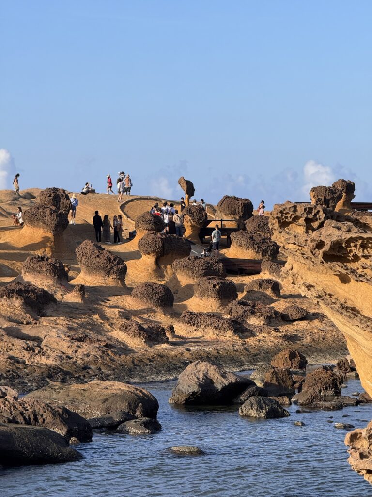 Letzter Programmpunkt der Tagestour ist Yeliu. Hier ist die eine obere Schicht Steine deutlich härter als der weiche Sandstein darunter, und so bilden sich witzige Pilzförmige Strukturen. Auch ein Publikumsmagnet, wir sind nicht allein.