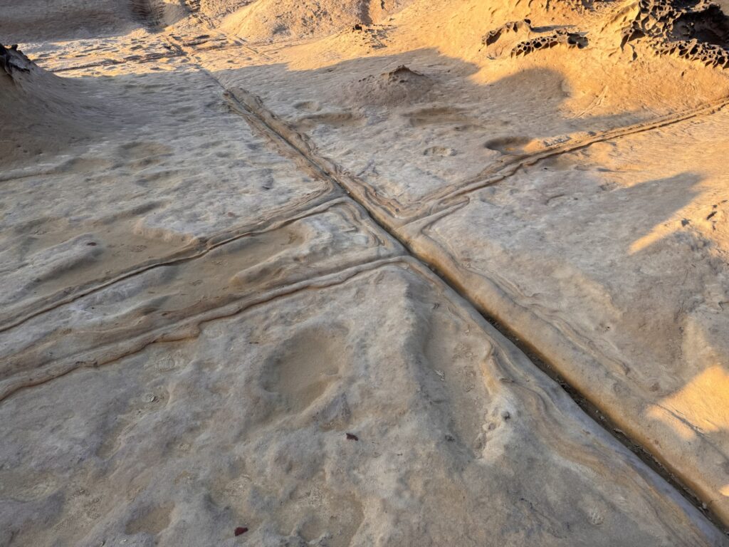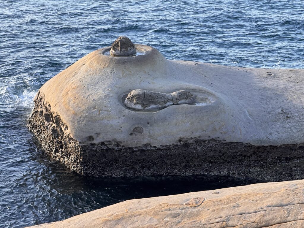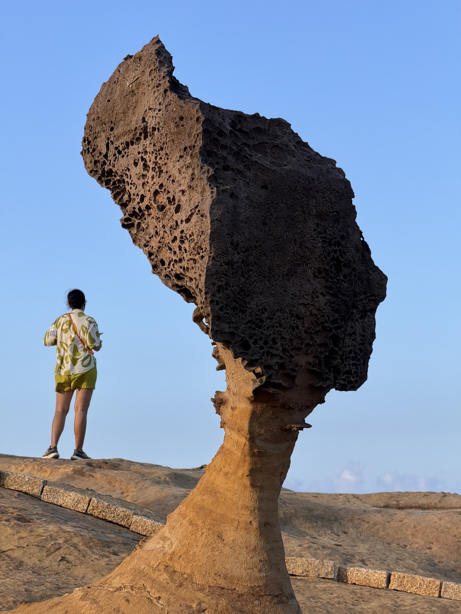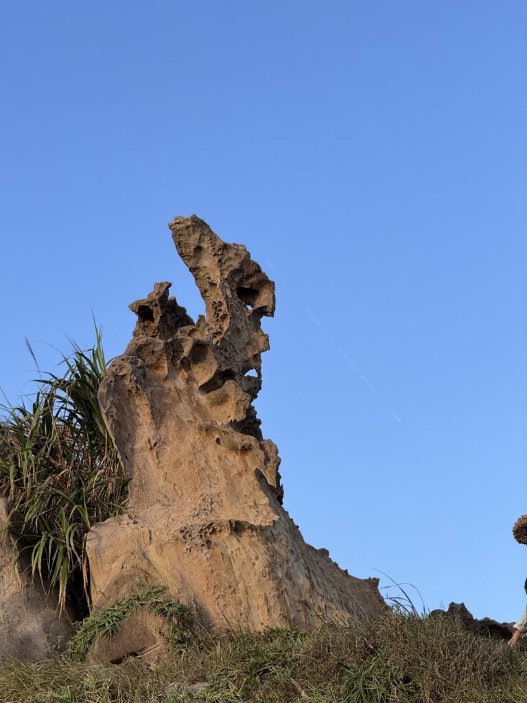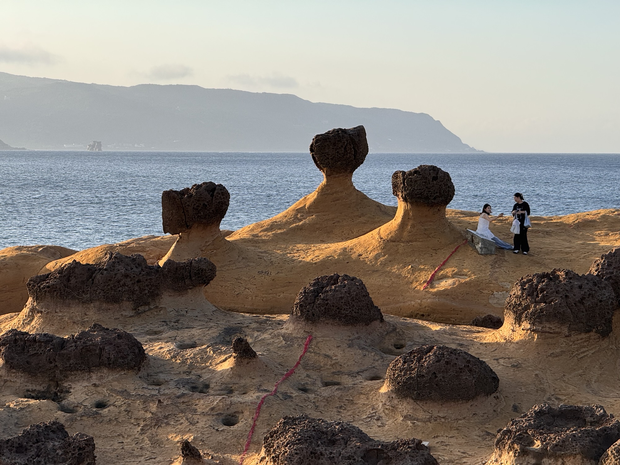 Letzter Programmpunkt der Tagestour ist Yeliu. Hier ist die eine obere Schicht Steine deutlich härter als der weiche Sandstein darunter, und so bilden sich witzige Pilzförmige Strukturen. Auch ein Publikumsmagnet, wir sind nicht allein.