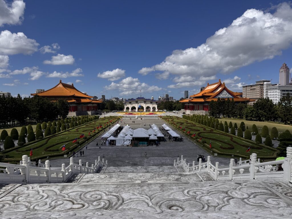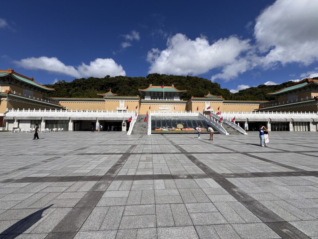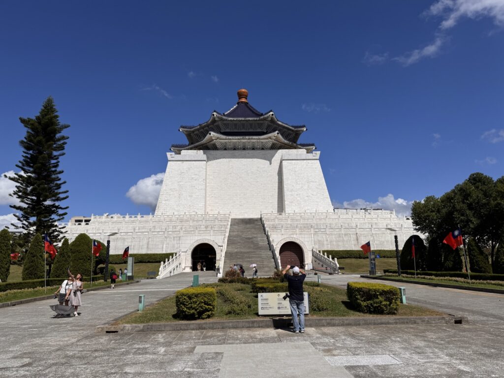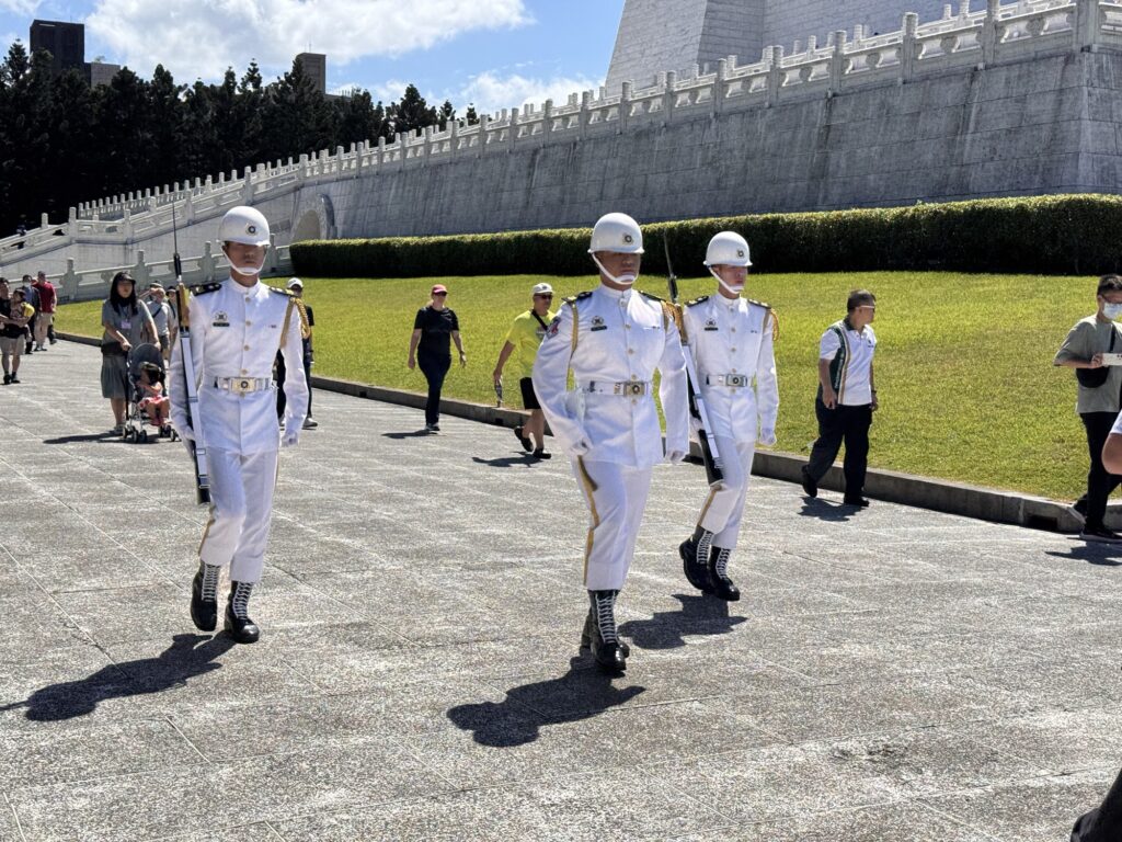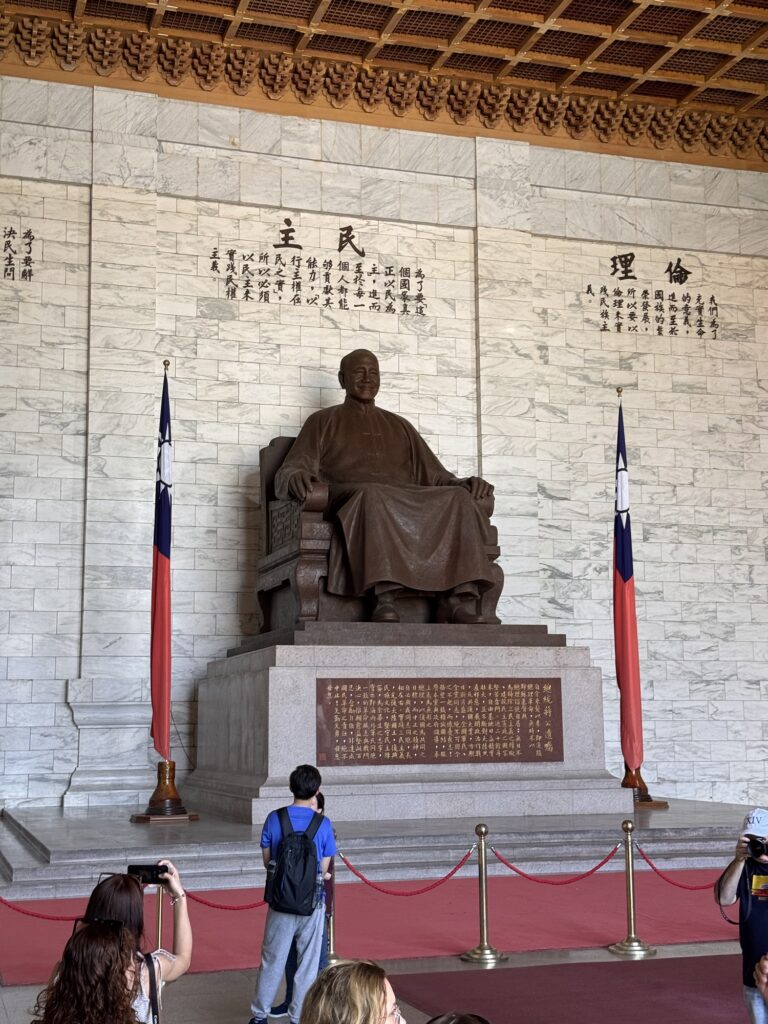 Zu einem ähnlichen Fazit werde ich bei der nächsten Tour kommen. Hier führt uns James, der damit offensichtlich seine Rente aufbessert. Auch er hat eine einschläfernde Sprachmelodie, und die Verständlichkeit wird ein wenig durch die Maske beeinträchtigt, die James die ganze Tour lang trägt. Programm hier: National Palace Museum (wo die Taiwanesen bei der Flucht ein paar der wichtigsten Kulturschätze ganz Chinas gerettet haben. Die Mainland-Chinesen sagen geklaut, aber ganz ehrlich – die hätten das meiste während der Kulturrevolution zerdeppert). Danach der Chiang Kai Shek Memorial Park, mit einem riesigen Monument und etwas Museum. Es ist übrigens kein Mausoleum, der Kollege ist woanders begraben.