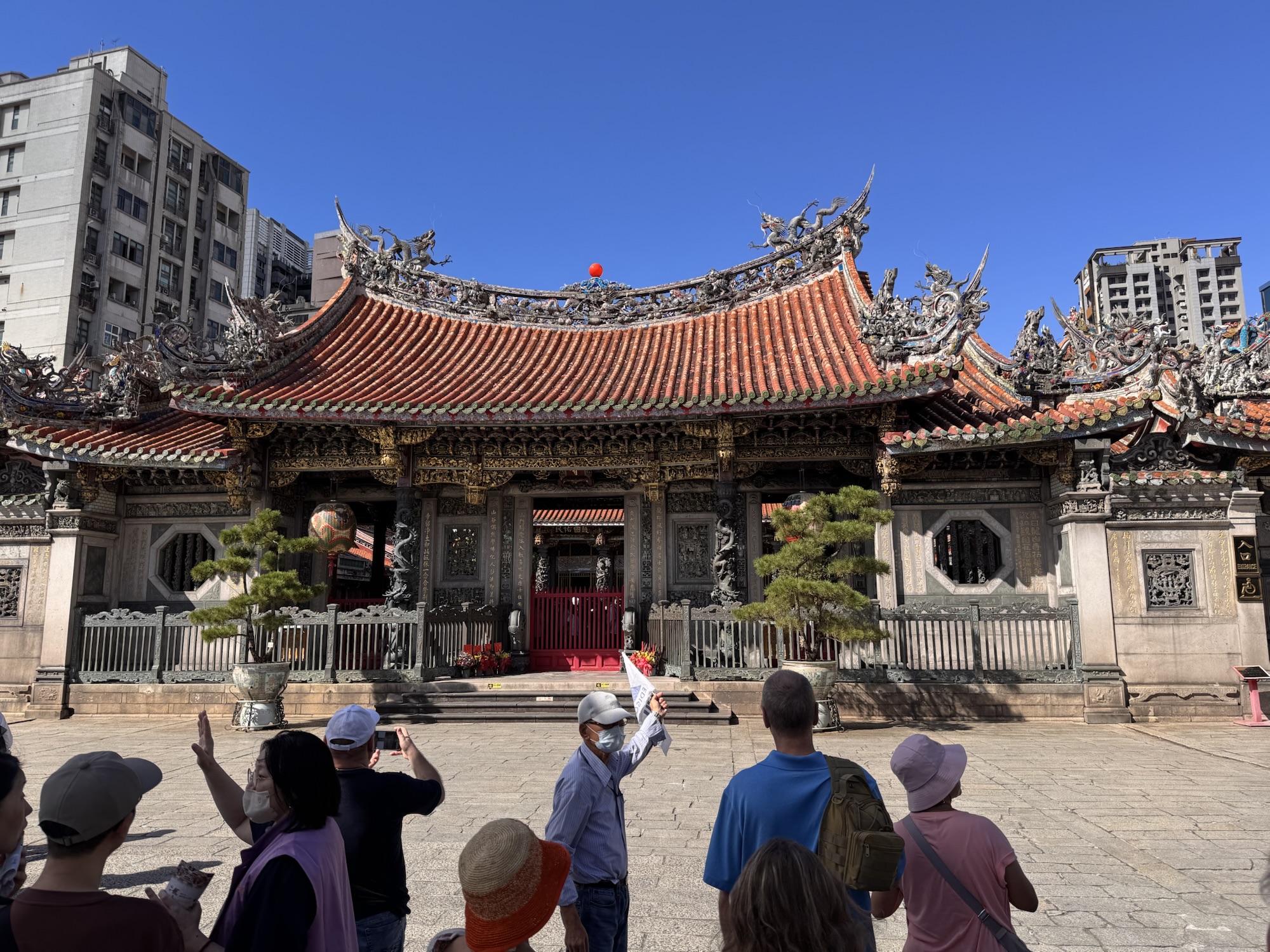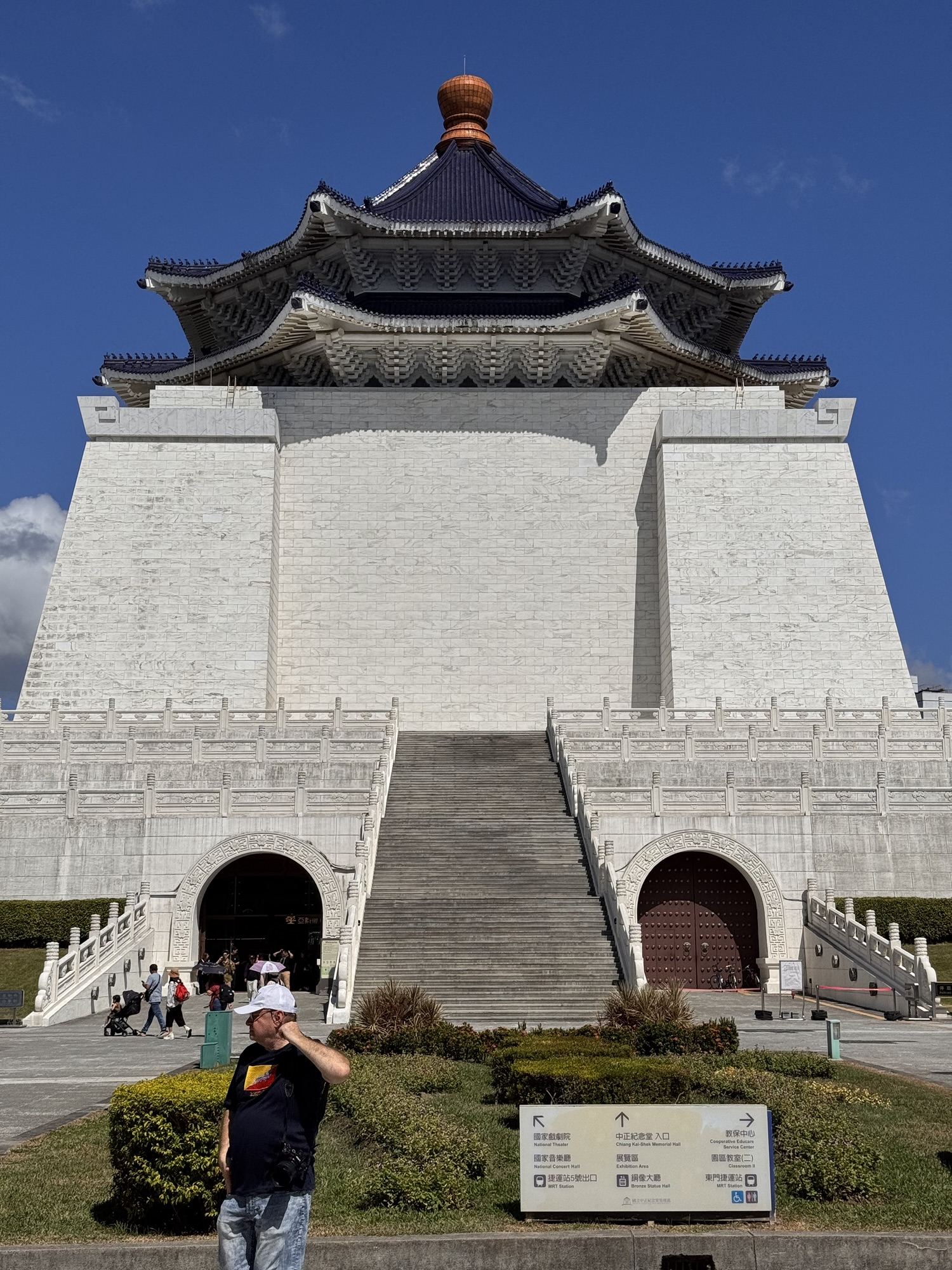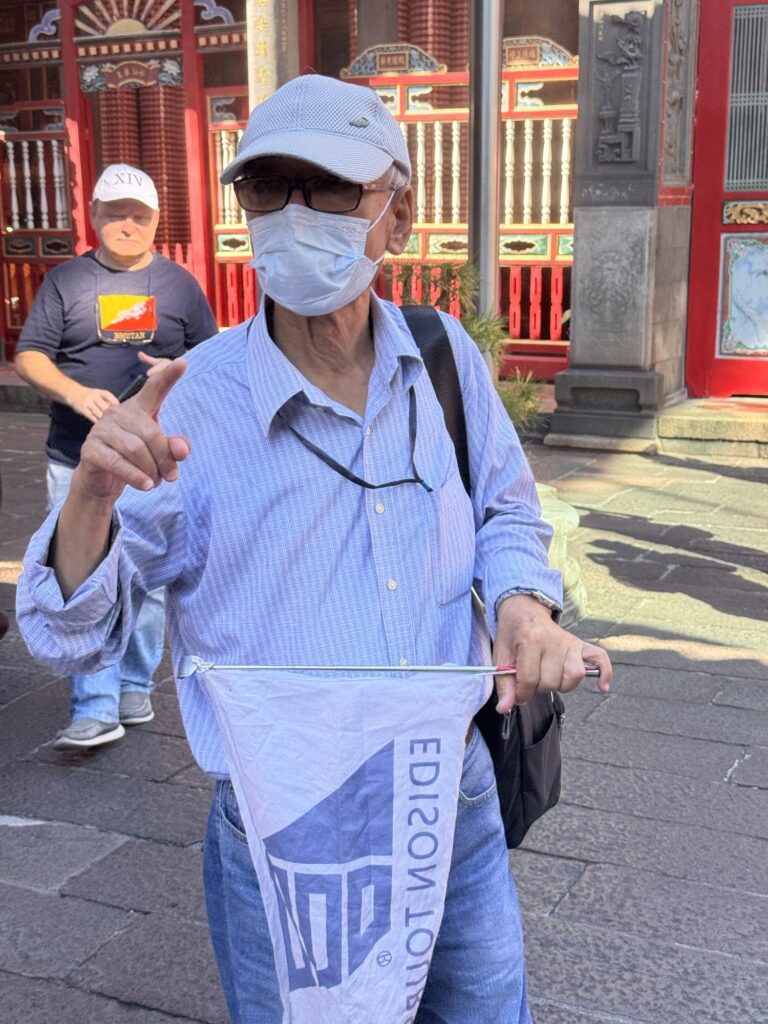 Zu einem ähnlichen Fazit werde ich bei der nächsten Tour kommen. Hier führt uns James, der damit offensichtlich seine Rente aufbessert. Auch er hat eine einschläfernde Sprachmelodie, und die Verständlichkeit wird ein wenig durch die Maske beeinträchtigt, die James die ganze Tour lang trägt. Programm hier: National Palace Museum (wo die Taiwanesen bei der Flucht ein paar der wichtigsten Kulturschätze ganz Chinas gerettet haben. Die Mainland-Chinesen sagen geklaut, aber ganz ehrlich – die hätten das meiste während der Kulturrevolution zerdeppert). Danach der Chiang Kai Shek Memorial Park, mit einem riesigen Monument und etwas Museum. Es ist übrigens kein Mausoleum, der Kollege ist woanders begraben.