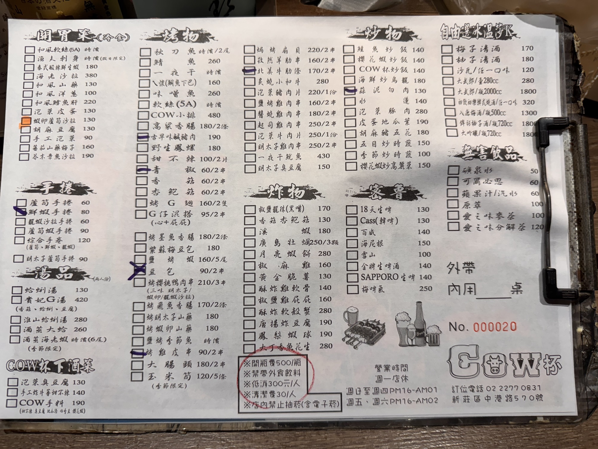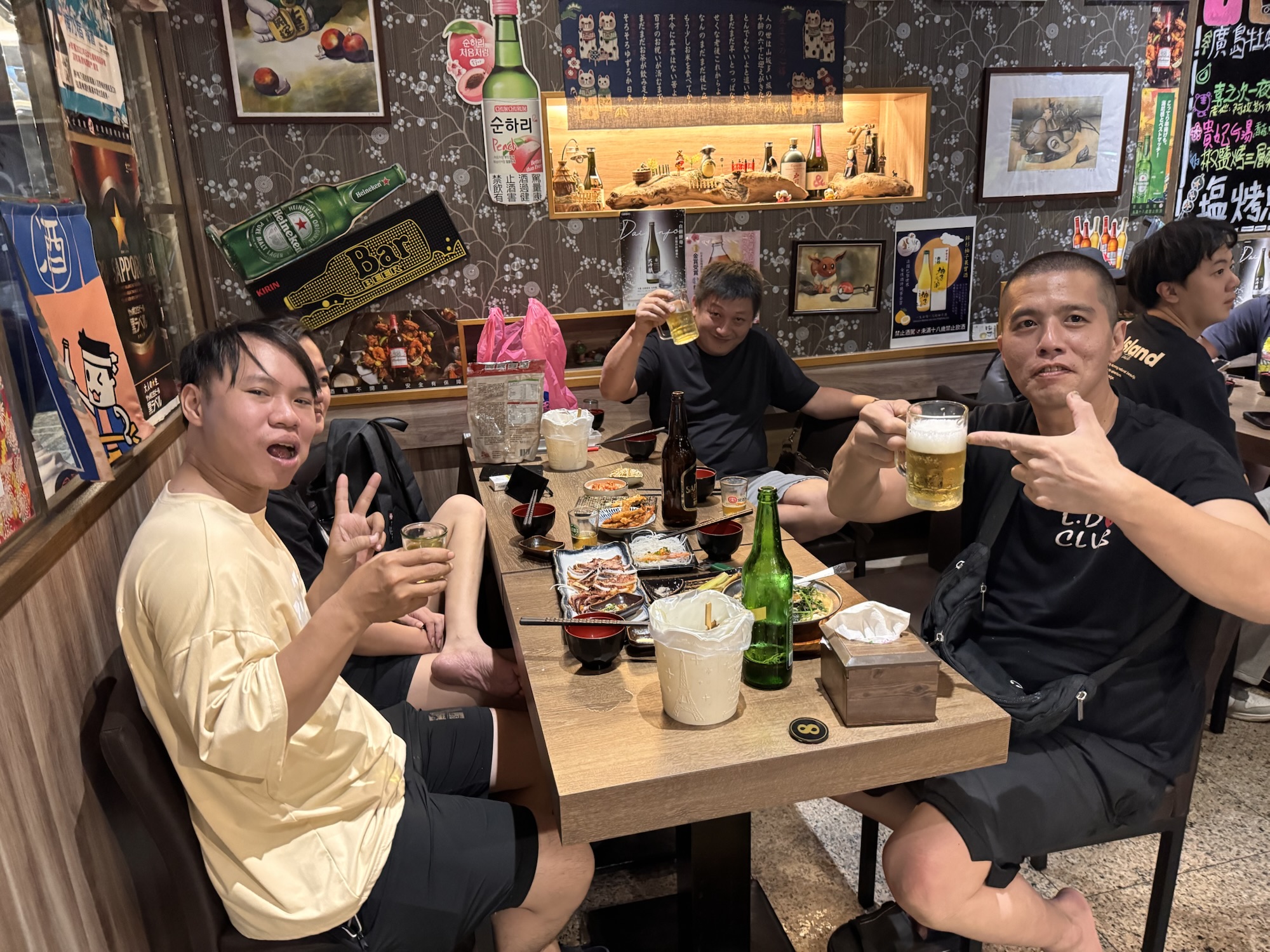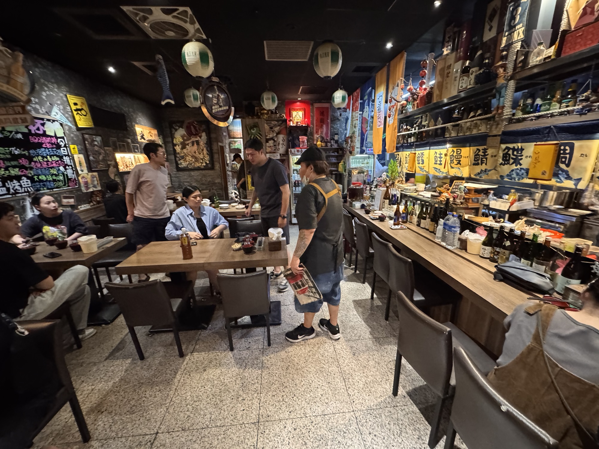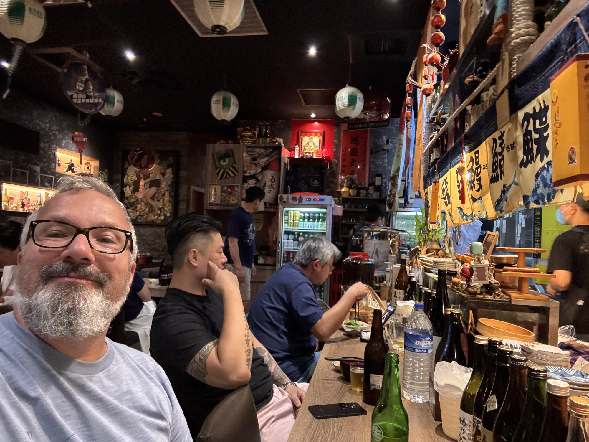 Claudia hat mich mit einigen Tipps über Taipeh versorgt. Sie sind kreuz und quer über die ganze Stadt verstreut, und bislang habe ich wenig genutzt. Aus deshalb will ich heute ins COW bei Izakaya gehen, auch wenn es eine 50-minütige Fahrt vom Hotel aus wäre. Das gute – die Fahrt ist auch vom Taipeh 101 nur 50 Minuten, also mache ich mich gleich nach der Tour auf den Weg, obwohl duschen schon echt was feines gewesen wäre. Mit dem Bus 652 geht es nach Neu-Taipeh, also der Stadtteil auf der westlichen Seite des Tamsui Flusses. Durch meine letzten Restaurantbesuche gewarnt, frage ich erst an der Theke ob sie Kreditkarte nehmen, ich habe kaum noch Bargeld. Der junge Kollege ist mit meiner Frage sprachlich überfordert, die Chefin meint barsch: No English. Ich zeige die auf dem Handy gespeicherte Karte, und der Kollege meint OK. Puh. Ich bekomme einen Platz an der Theke, neben dem Häuschen des schwarzen Hauskaters, der mich den Rest des Abends ignoriert. Die Karte ist ein DIN A4 Blatt auf chinesisch, wo man seine Wünsche ankreuzen kann. Zu manchem fehlt mir das Verständnis oder der Mut (G-Boy Mashup (Herz und Furz), Sitzsack, Wilde Schnecke, Dickdarm), aber ich bekomme genug zusammen. Taiwanesisch ist das hier auch nicht, sondern ein japanisches Izakaya/Yakitori Restaurant. Nach einigen Tellerchen bin ich fast satt, und will die Vernunft walten lassen. Ich will zahlen. Die Chefin ist nicht erfreut, bellt etwas in Google Translate: „How fast?“ „Is Holiday, you should stay“ „Beer, I invite you“. Sie zapft mir ein Bier, und damit ist mein Schicksal besiegelt. Ich trolle mich wieder an meinen Platz, bestelle noch ein paar Spießchen und schaue dem Treiben zu, bzw. gehöre dazu. Es dauert etwas länger, es wird noch ein Bier, aber irgendwann muss ich wirklich gehen. Als ich mein Handy mit Kreditkarte hinhalte, ist es dann aber doch nicht OK. „No problem, you come back tomorrow“. Nach kurzer Diskussion gehe ich aber doch zum 7-11 gegenüber, immerhin weiß ich jetzt schon, was der heutige Abend kostet. Ich nehme mir ein Taxi ins Hotel, weil der Bus erst in 20 Minuten gekommen wäre, war aber auch nicht sehr teuer.