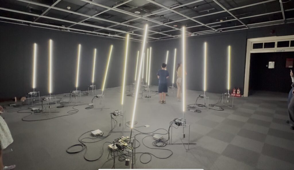 8 leuchtende Stäbe, die unabhängig voneinander hoch- und runterschweben‚Wogender Wald‘ aus LeuchtstäbenEine Parabol-Installation aus vielen TabletsGriechische Säule, Taiwan-StyleStraßenszeneDschungel auf dem Weg zum FlughafenTaipeh Flughafen – Sintflutartige RegenfälleBankok FlughafenWien Flughafen