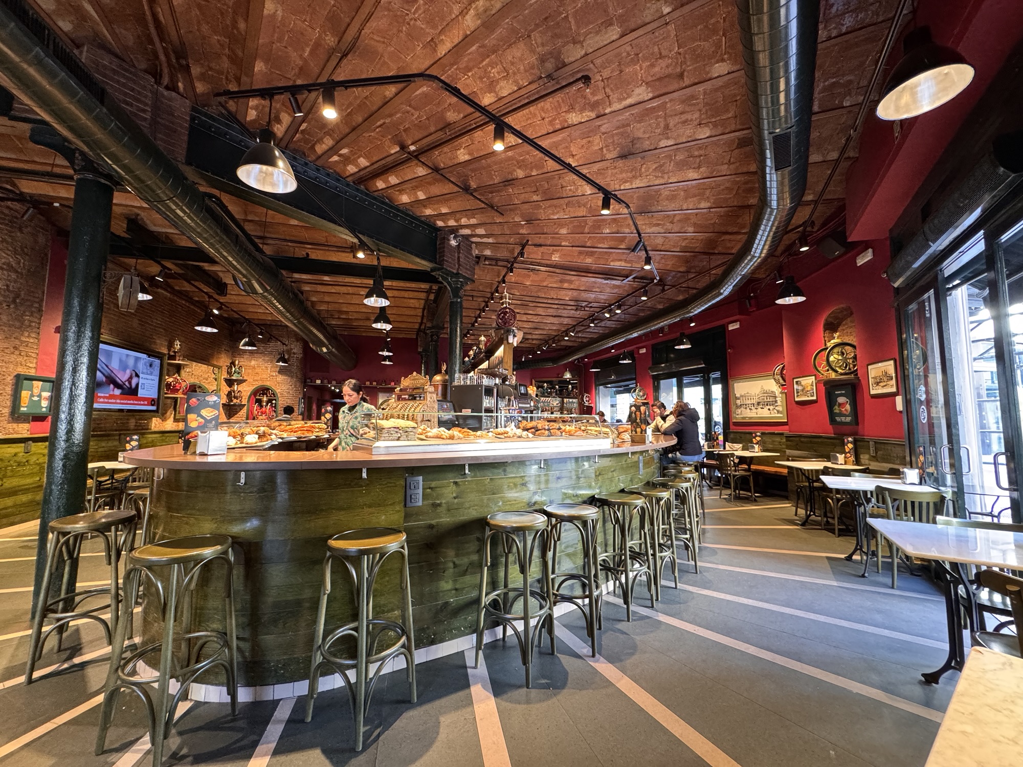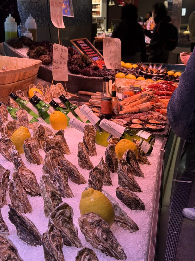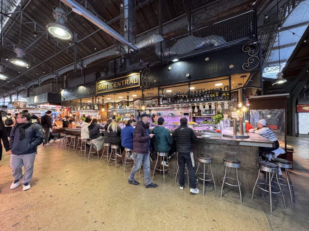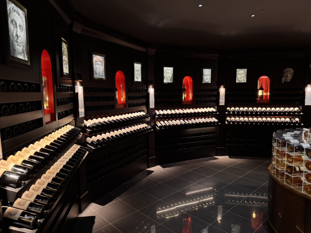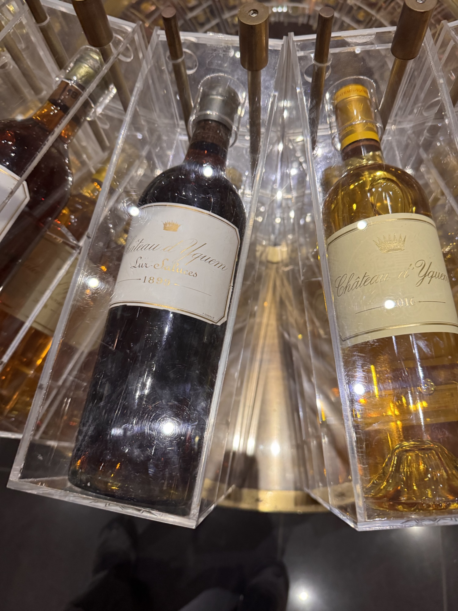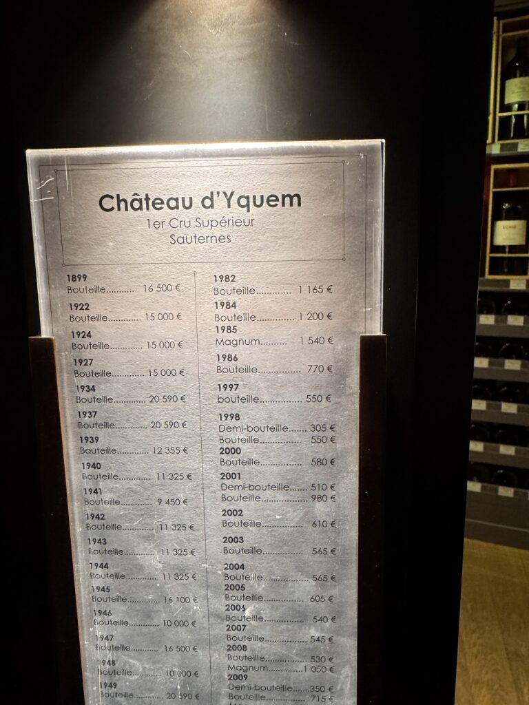 Danach durch den Jardin des Tuileries (der wahrscheinlich im Frühling oder Sommer mehr hermacht), am Louvre vorbei, etwas japanisches Essen (typisch französisch), und weiter an der Oper vorbei zu den Galeries Lafayette. Eigentlich wollte ich dort einen Kaffee trinken, aber vorher springt mich die Bar an der Weinabteilung an. Vielleicht ist ein Champagner stilvoller? In der Weinabteilung gibt es einen Sondertempel – ein Schrein dem Wein gewidmet. Ich sehe eine Flasche 1er Cru Supérieur Sauternes von dem Weingut Château d’Yquem von 1899 für 16.500 €; vielleicht das nächste Mal.