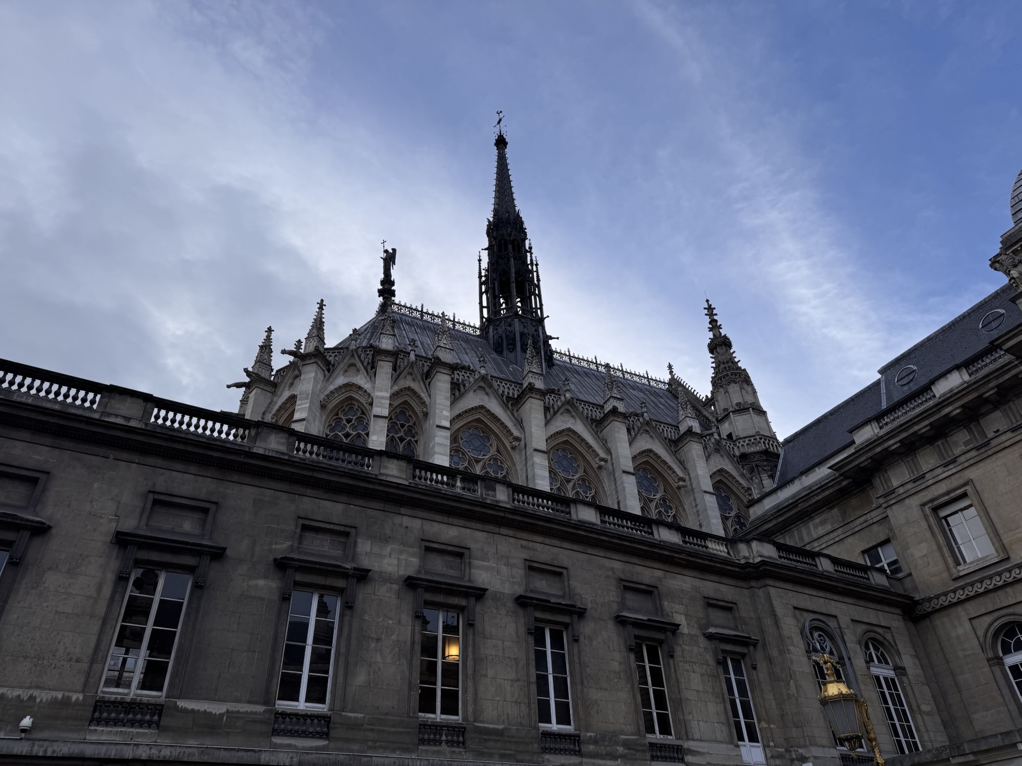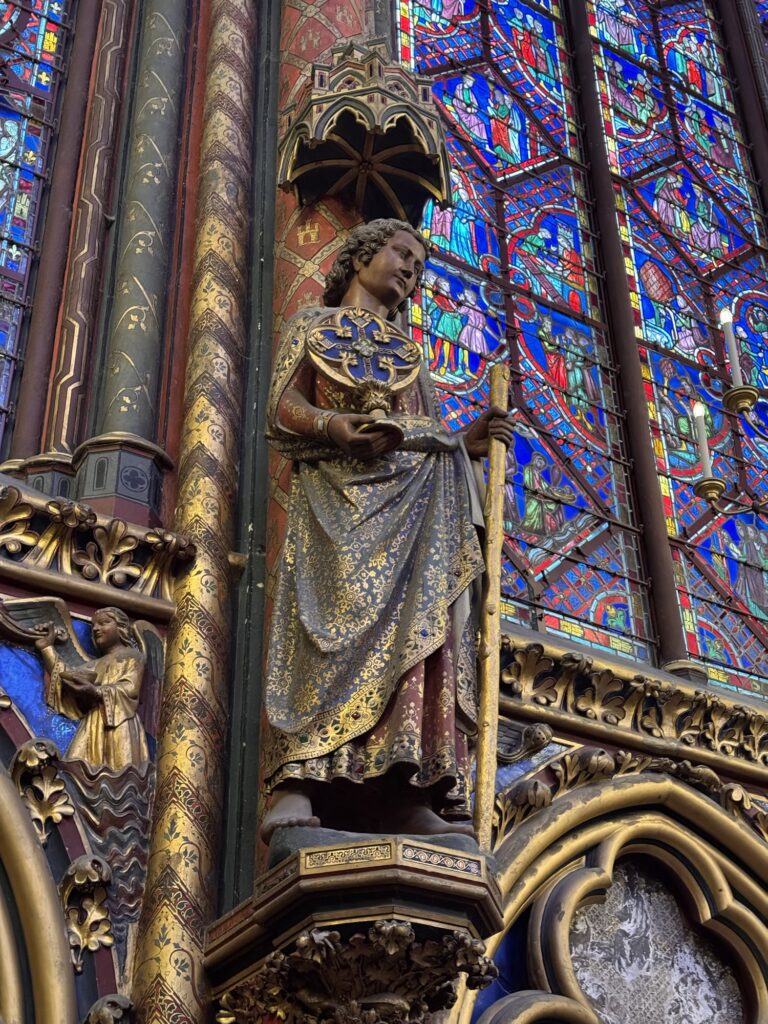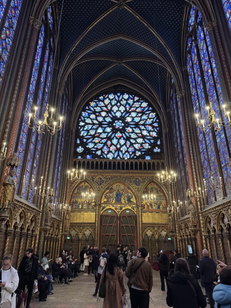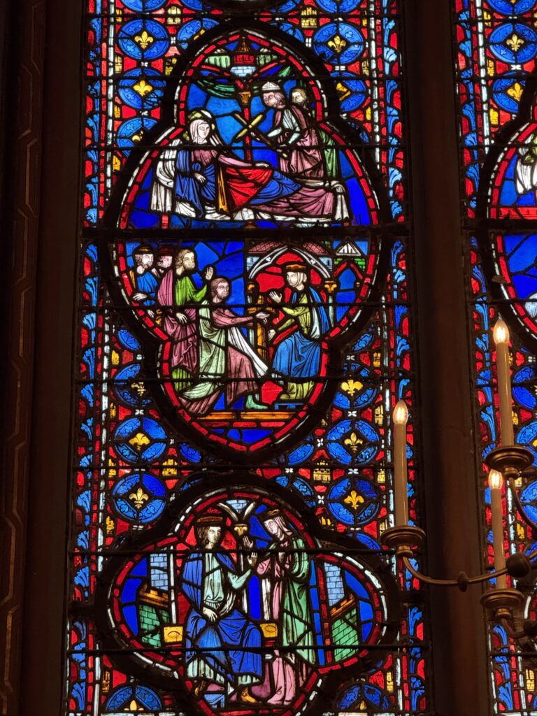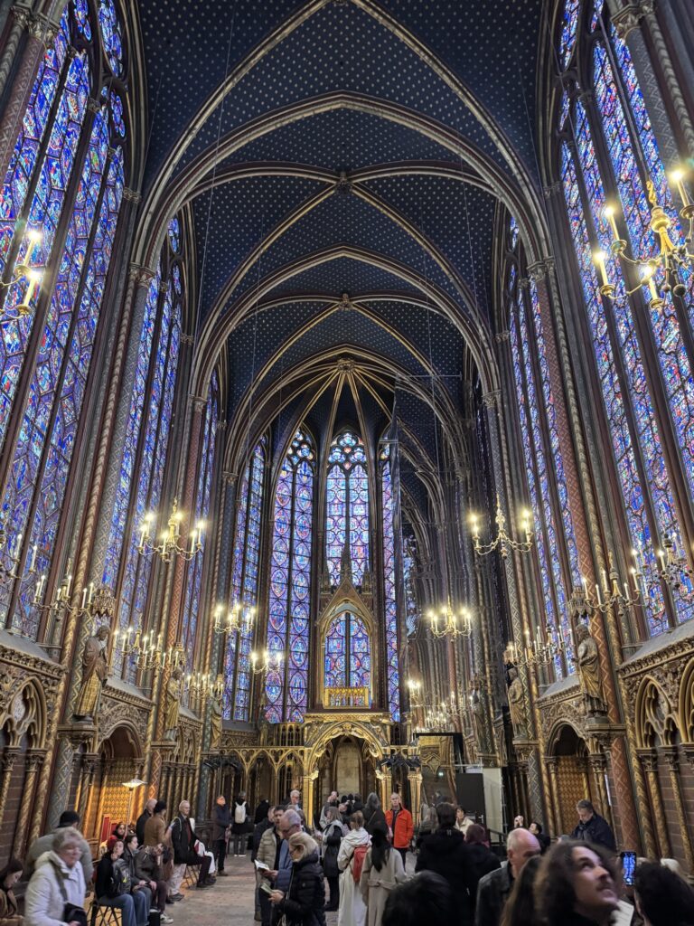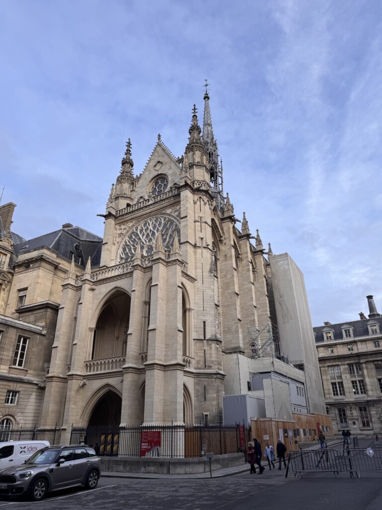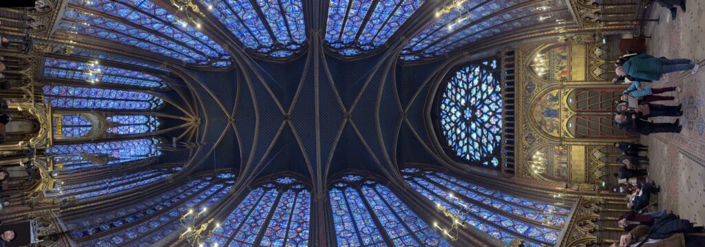 Ich mache mich auf den Weg zu Saint Chapelle. Hier werden Eintrittspreise von 22 Euro aufgerufen, doch ich bekomme einen 6 € Rabatt, weil ich EU-Bürger bin. Erst fürchte ich, dass mich Julia verarscht hat: ein niedriges Gewölbe – tatsächlich sehr hübsch bemalt, ein paar Restaurierungsbruchstücke aber zB keine Fenster. Per Chat dirigiert mich Julia aus der Kellerkapelle in die eigentlich Kirche – das ist schon besser. Die größte Attraktion sind die 15 Fenster aus Buntglas, die insgesamt 1113 Szenen aus der Bibel darstellen – das sind weniger als 1,5 Cent pro Szene. Es wird auch noch fleißig fertig-restauriert, dabei mit der cleversten Baugerüstverkleidung die mir je aufgefallen ist – es ist komplett mit einer Spiegelfolie verkleidet, und da die Kirche ja recht einheitlich ist, fällt es kaum auf. Nur wenn man sich im Verhältnis dazu bewegt, wandern manche Objekte entgegen der erwarteten Richtung.