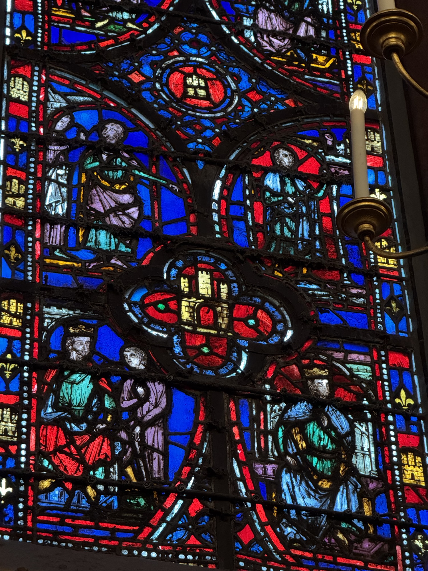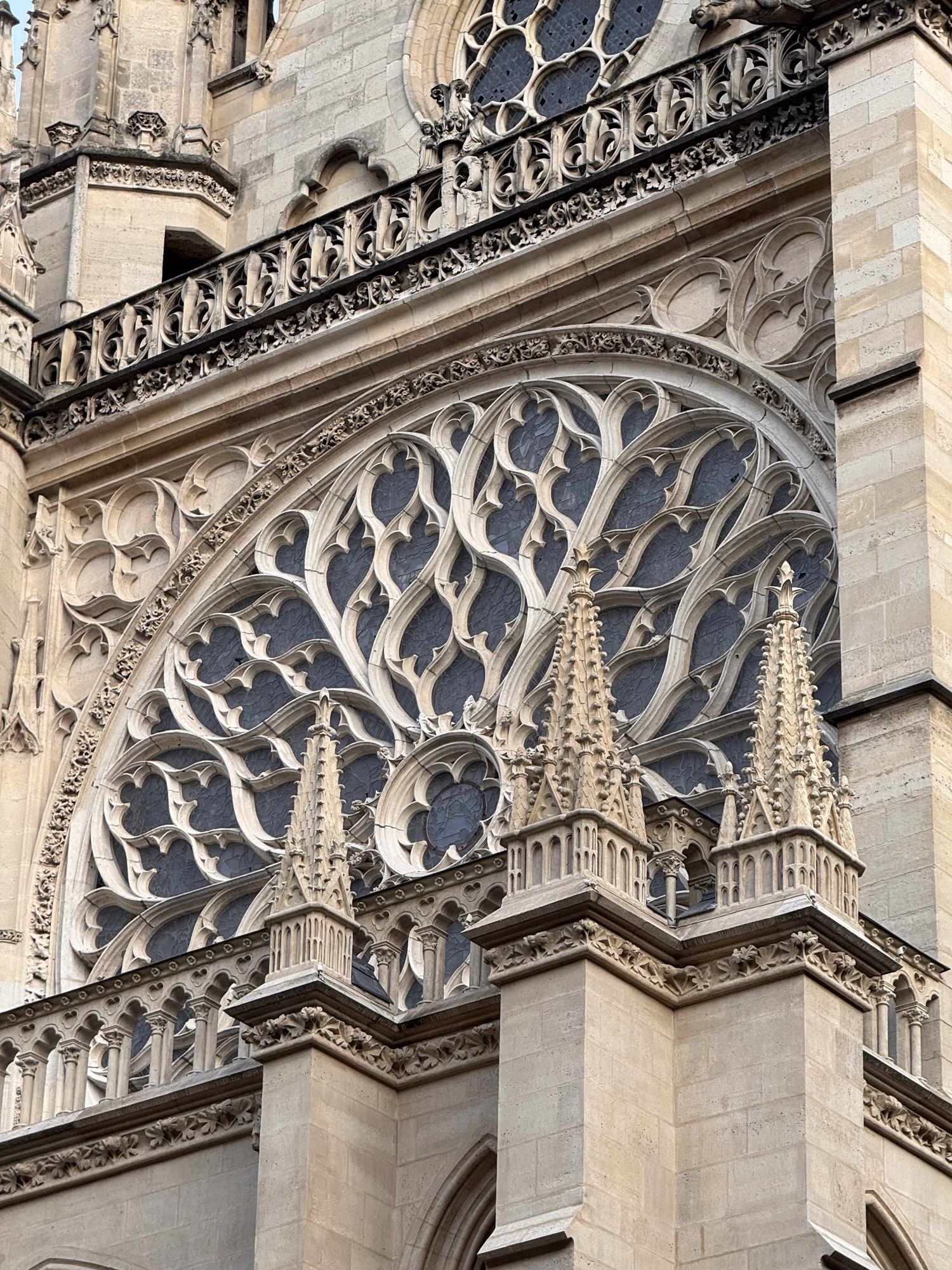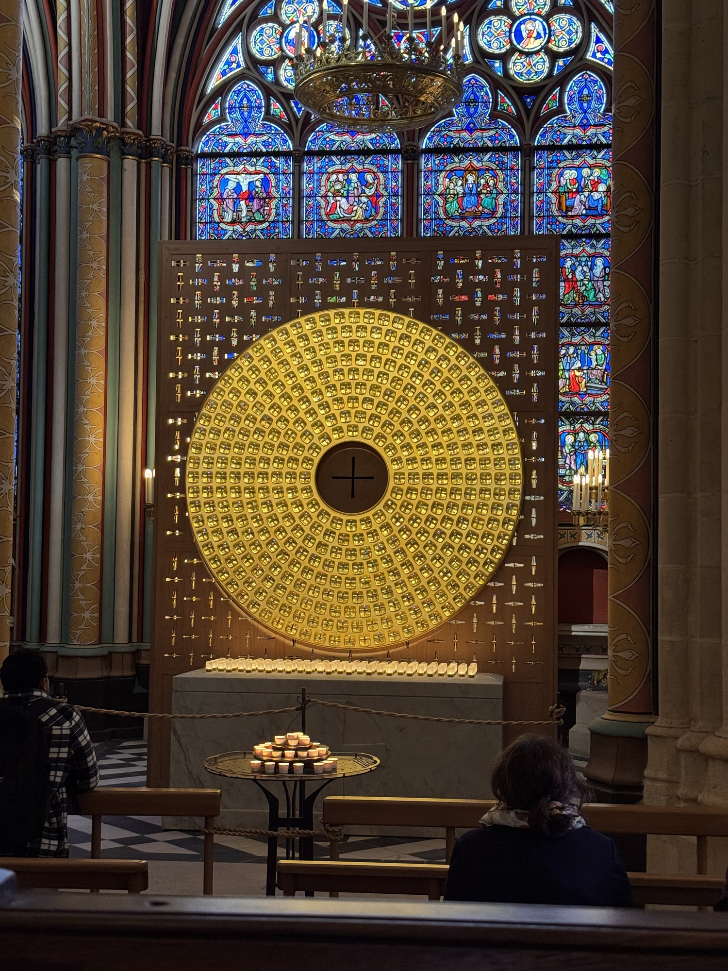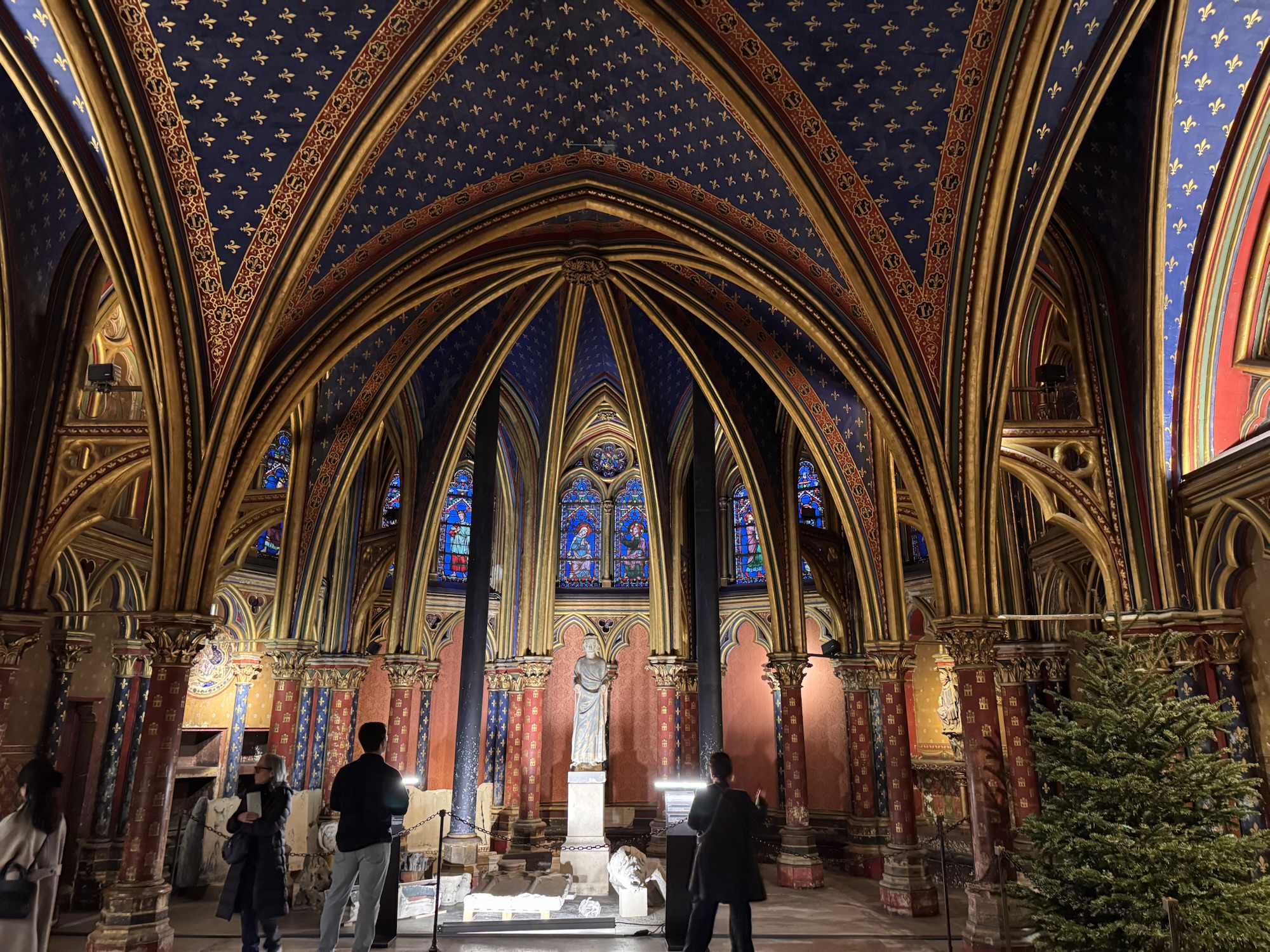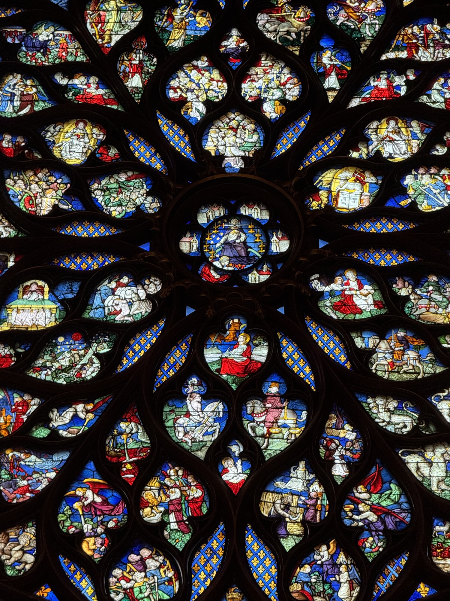 Ich mache mich auf den Weg zu Saint Chapelle. Hier werden Eintrittspreise von 22 Euro aufgerufen, doch ich bekomme einen 6 € Rabatt, weil ich EU-Bürger bin. Erst fürchte ich, dass mich Julia verarscht hat: ein niedriges Gewölbe – tatsächlich sehr hübsch bemalt, ein paar Restaurierungsbruchstücke aber zB keine Fenster. Per Chat dirigiert mich Julia aus der Kellerkapelle in die eigentlich Kirche – das ist schon besser. Die größte Attraktion sind die 15 Fenster aus Buntglas, die insgesamt 1113 Szenen aus der Bibel darstellen – das sind weniger als 1,5 Cent pro Szene. Es wird auch noch fleißig fertig-restauriert, dabei mit der cleversten Baugerüstverkleidung die mir je aufgefallen ist – es ist komplett mit einer Spiegelfolie verkleidet, und da die Kirche ja recht einheitlich ist, fällt es kaum auf. Nur wenn man sich im Verhältnis dazu bewegt, wandern manche Objekte entgegen der erwarteten Richtung.