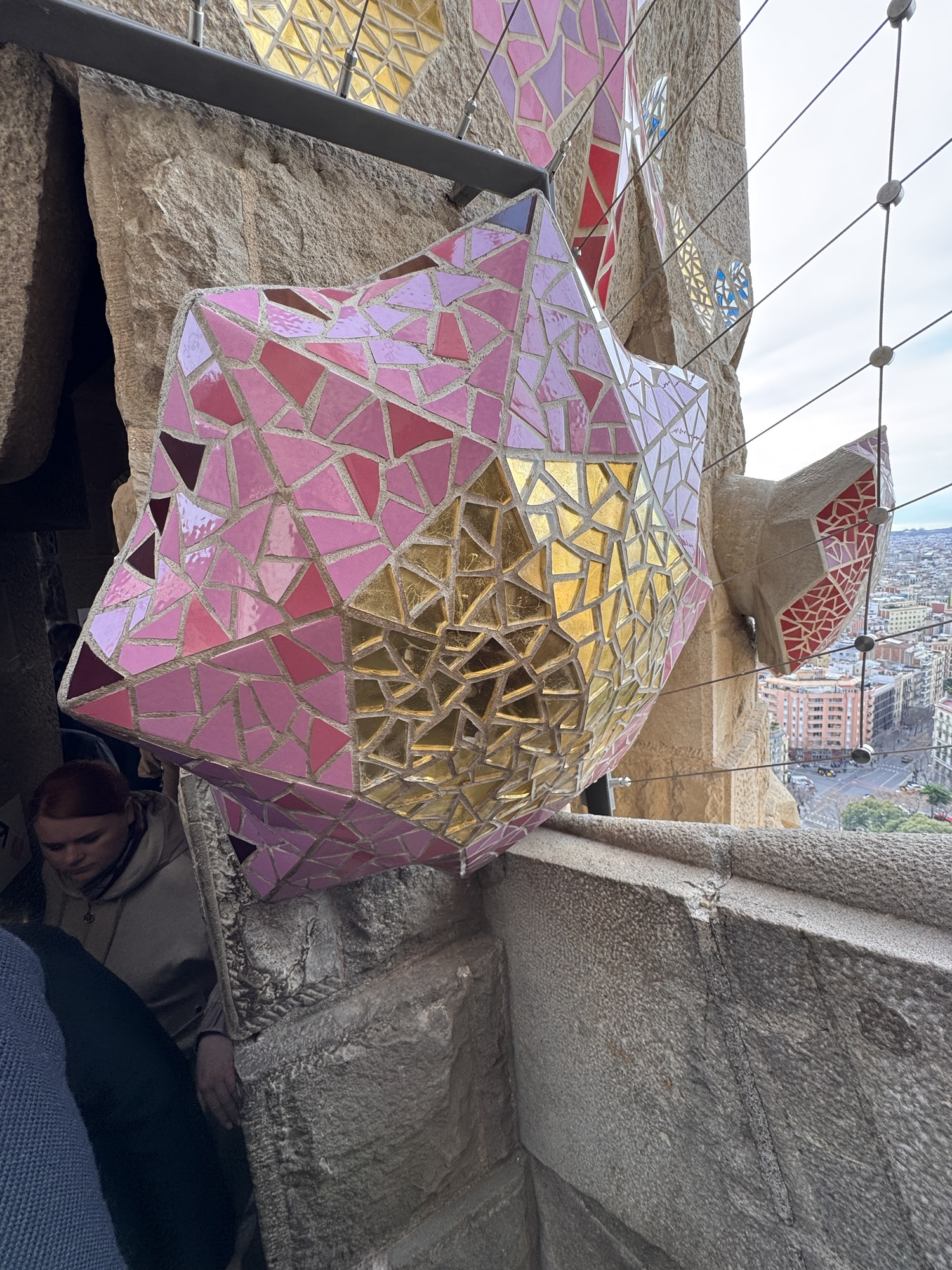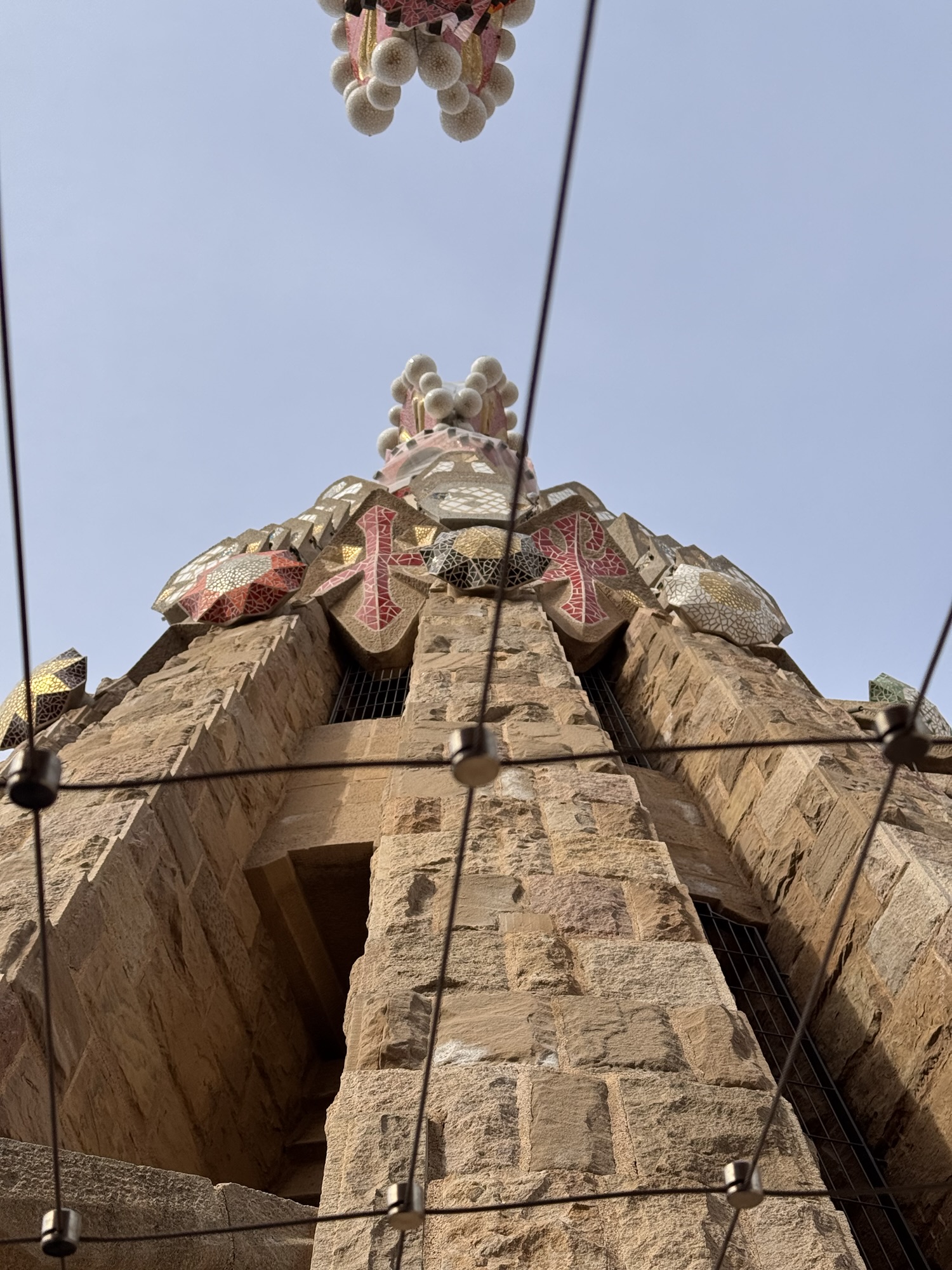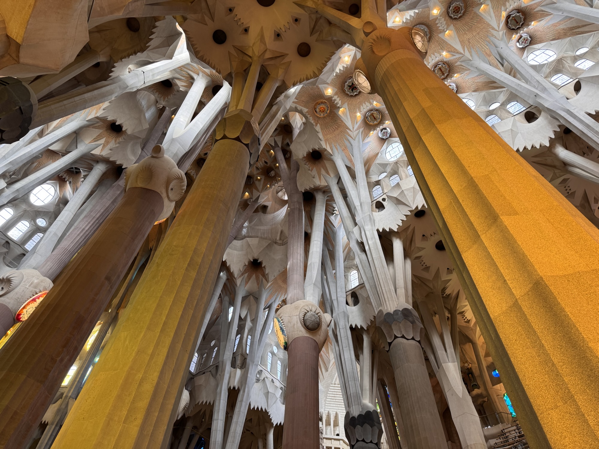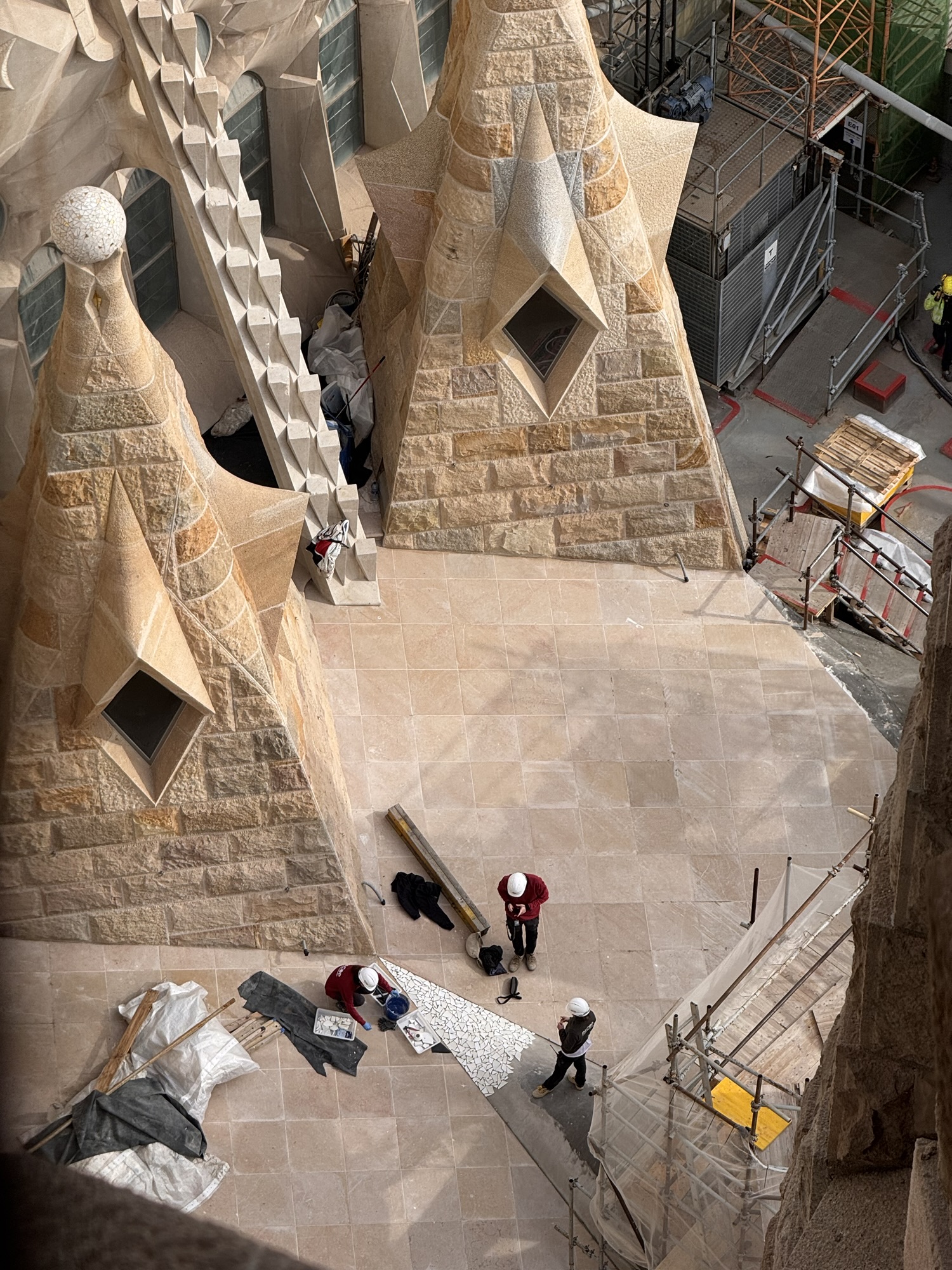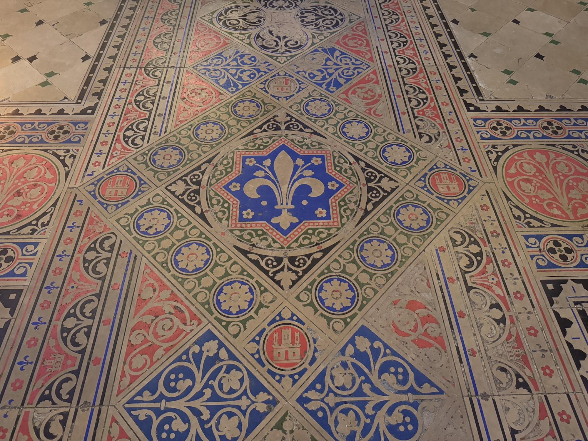 Ich mache mich auf den Weg zu Saint Chapelle. Hier werden Eintrittspreise von 22 Euro aufgerufen, doch ich bekomme einen 6 € Rabatt, weil ich EU-Bürger bin. Erst fürchte ich, dass mich Julia verarscht hat: ein niedriges Gewölbe – tatsächlich sehr hübsch bemalt, ein paar Restaurierungsbruchstücke aber zB keine Fenster. Per Chat dirigiert mich Julia aus der Kellerkapelle in die eigentlich Kirche – das ist schon besser. Die größte Attraktion sind die 15 Fenster aus Buntglas, die insgesamt 1113 Szenen aus der Bibel darstellen – das sind weniger als 1,5 Cent pro Szene. Es wird auch noch fleißig fertig-restauriert, dabei mit der cleversten Baugerüstverkleidung die mir je aufgefallen ist – es ist komplett mit einer Spiegelfolie verkleidet, und da die Kirche ja recht einheitlich ist, fällt es kaum auf. Nur wenn man sich im Verhältnis dazu bewegt, wandern manche Objekte entgegen der erwarteten Richtung.