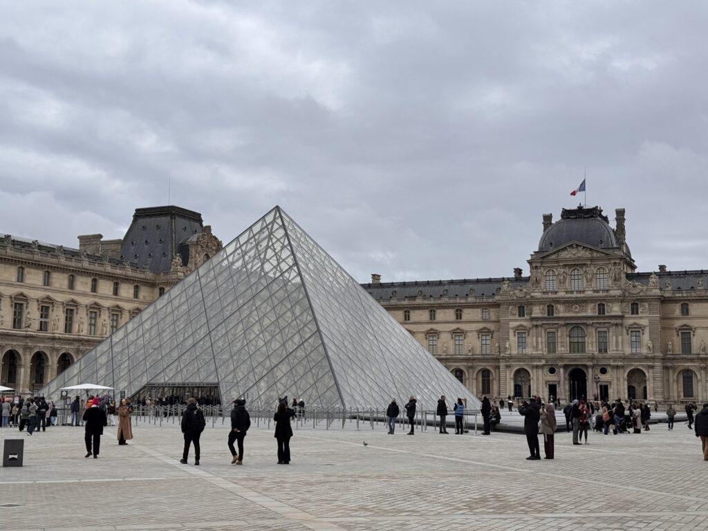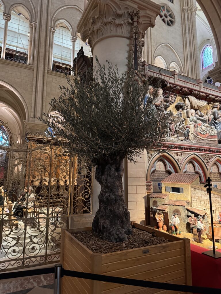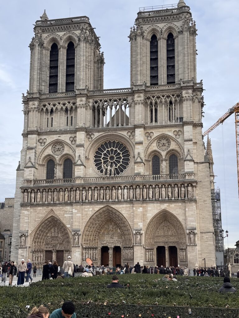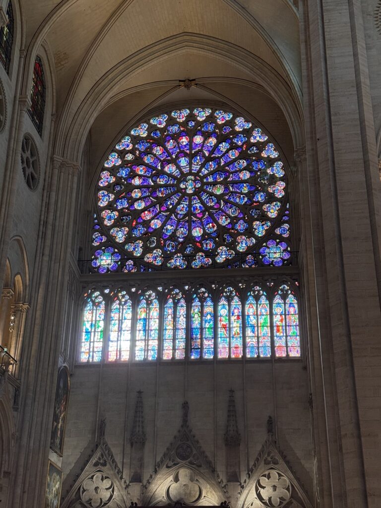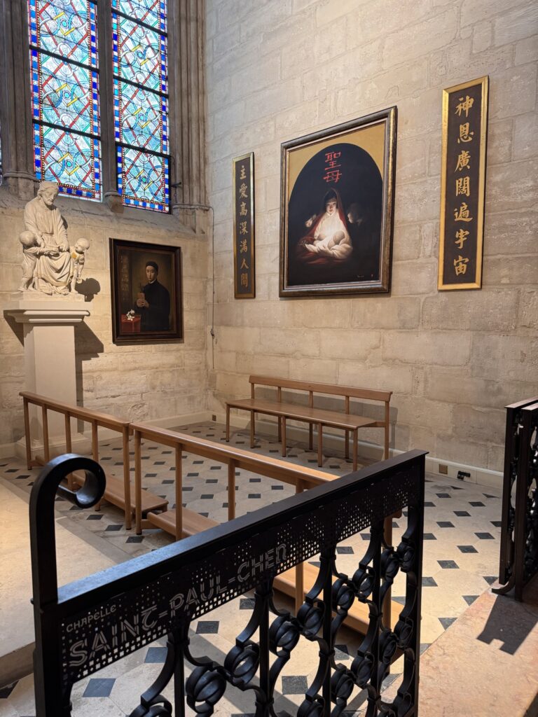 Am nächsten Tag (bewusst schreibe ich nicht Morgen) probiere ich einen weiteren Restauranttipp von Ramsi aus, auch lecker. Danach mein vorher eigentlich einziger feste Programmpunkt in Paris: die Cathédrale Notre-Dame de Paris, frisch restauriert nach dem Feuer. Obwohl erst seit 2024 offen, wirkt sie viel altmodischer als die anderen besuchten Sakralbauwerke auf meiner Reise. Es entstehen einige Fotos, schön ist sie schon. Neu gestaltet ist das Reliquar für die Dornenkrone, die Jesus bei der Kreuzigung getragen hat. DAS Original! Echt! Doppelschwör! Rund um die Kathedrale sind lauter Seitenkapellen, jeweils anderen Heiligen geweiht. Eine davon ist Saint Paul Chen geweiht, die Bilder mit chinesischen Schriftzeichen. Smart move – so fühlen sich die tausende Asiatischen Touristen auch gut aufgehoben. Die Kirche kostet keinen Eintritt, und an diesem kalten Januartag ist auch die Schlange bis man reinkommt sehr kurz.