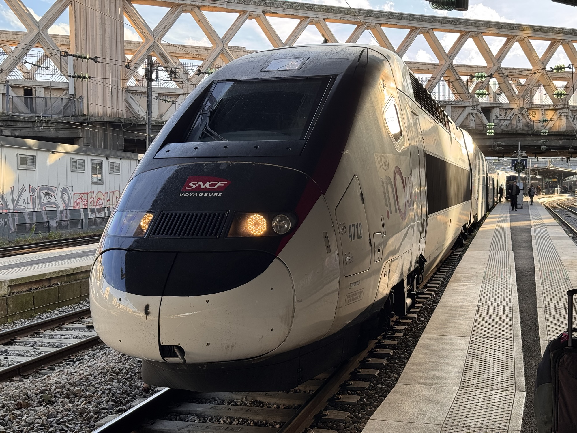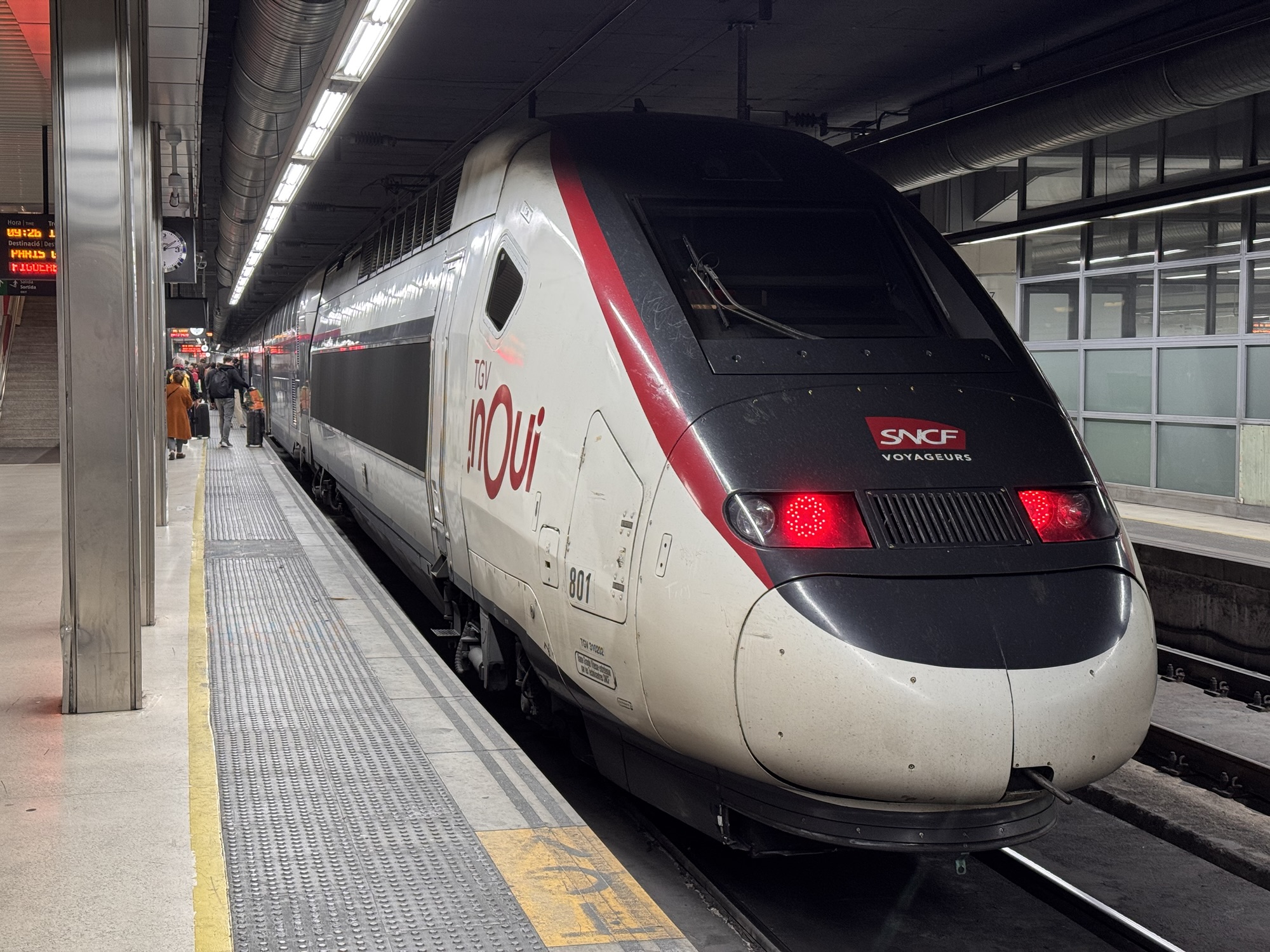 Dienstagmorgen mache ich mich wieder zum Bahnhof Barcelona-Sants auf. Von den Gleisen des Bahnhofs ist nichts überirdisch zu sehen; nachdem der Zug losfährt fahren wir die ersten 10 Minuten in einem Tunnel unter Barcelona. Der Zug bummelt sich noch ein wenig an der Küste entlang, hält für ein TGV relativ oft, zuletzt in Valence, noch knapp 500km von Paris entfernt. Danach schaltet er auf Full-TGV-Mode, und fährt ohne Halt und mit knapp 300km/h bis zur Gare de Lyon in Paris.