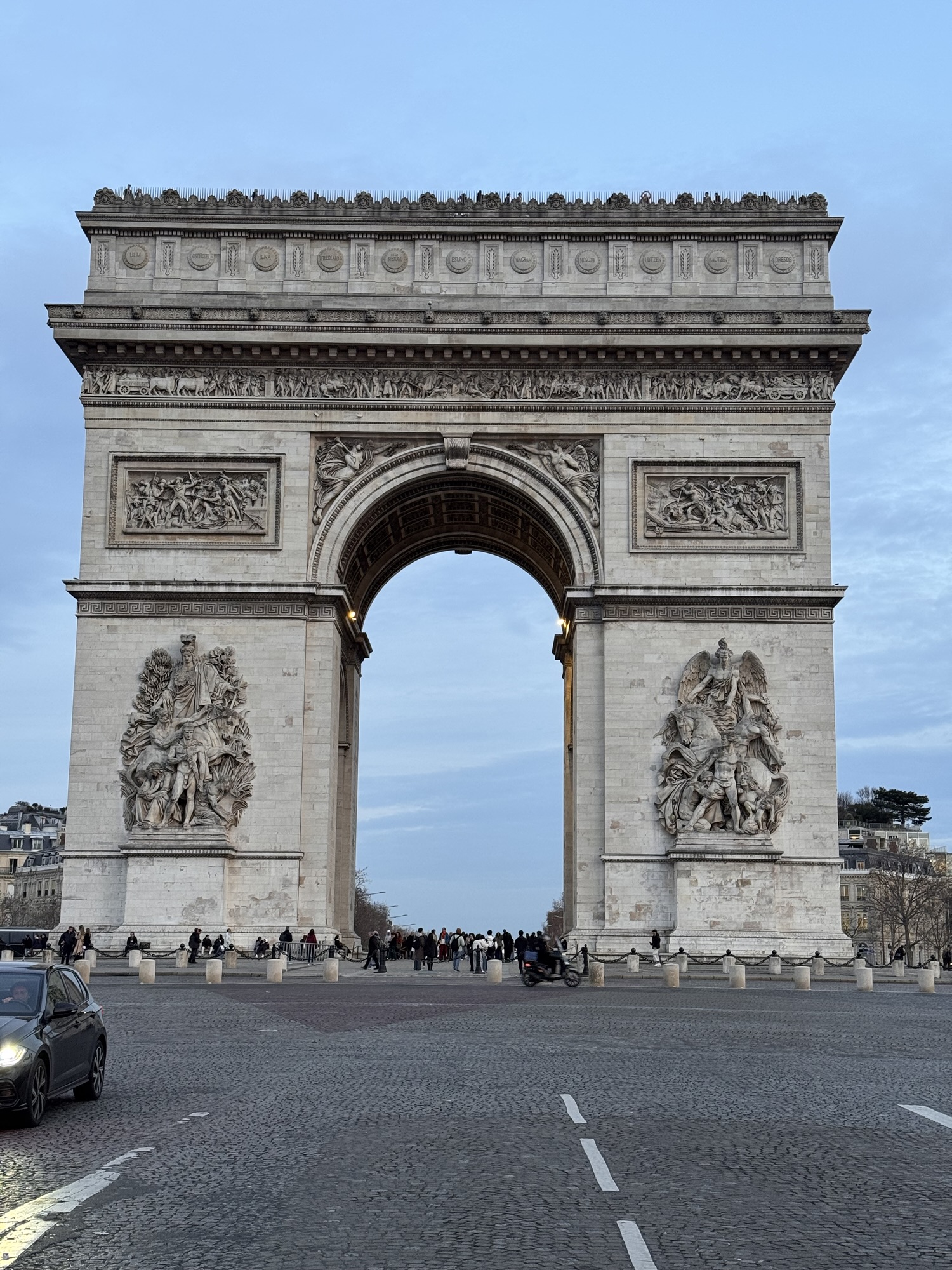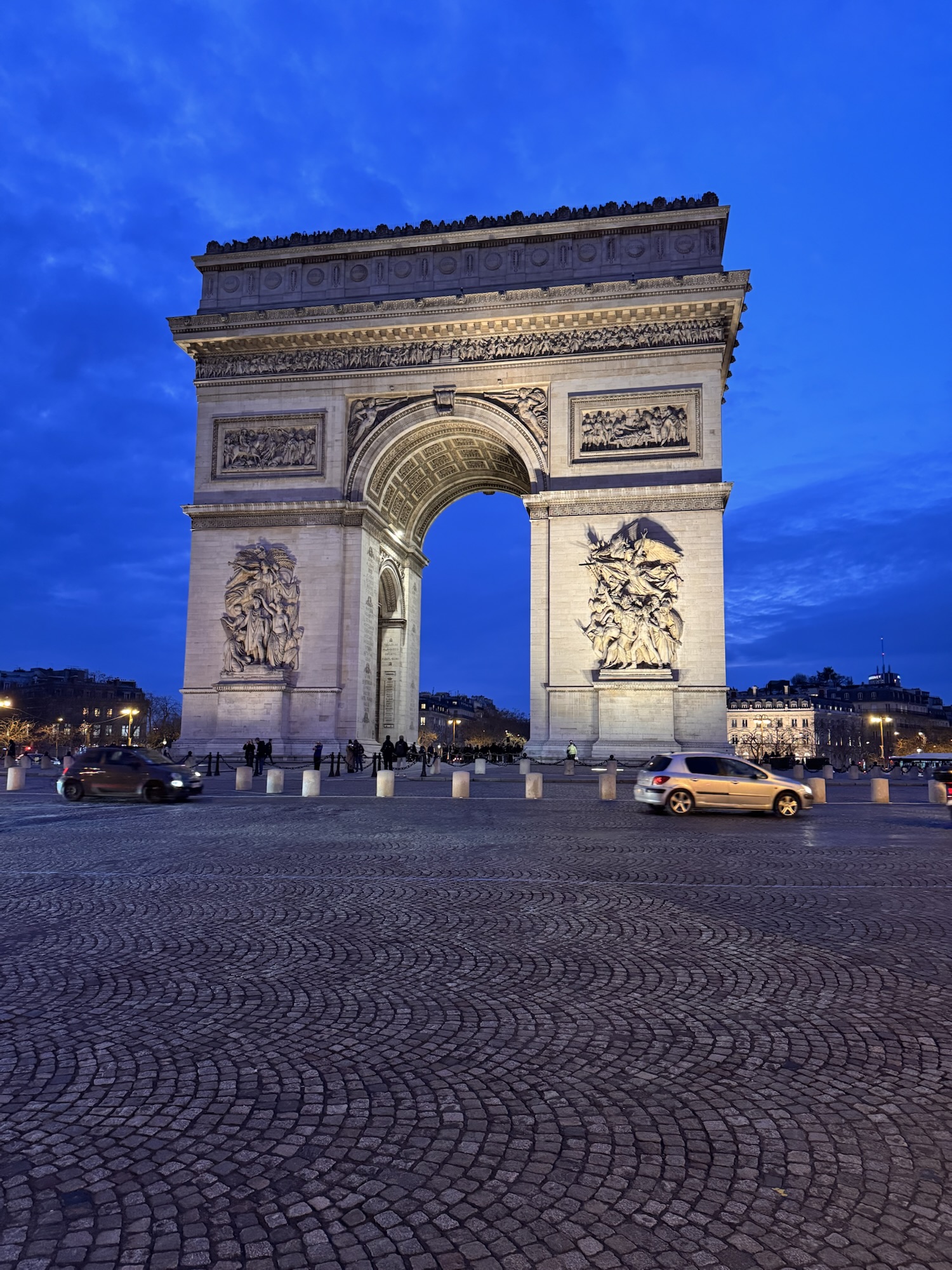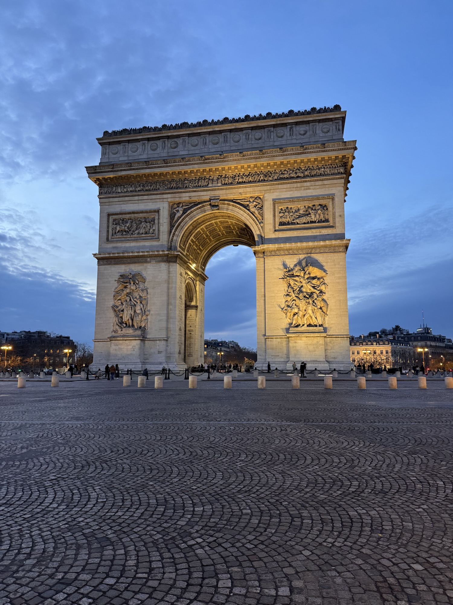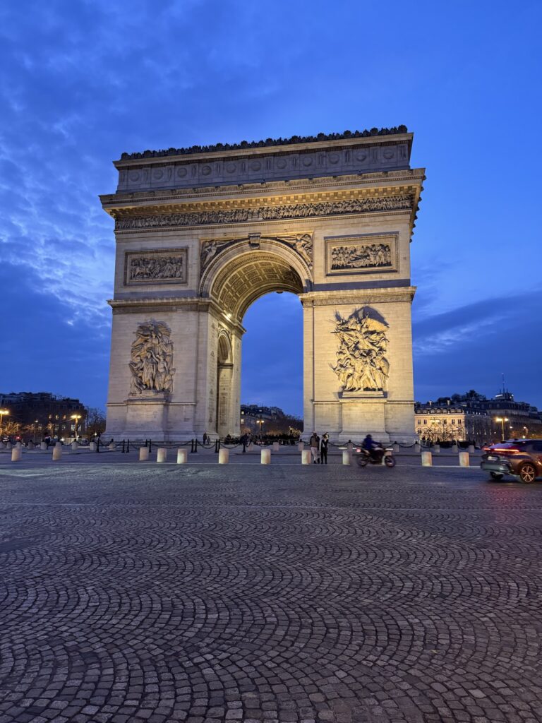 Also ein paar Fotos vom Eiffelturm, und dann wieder mit dem Bus zum Arc de Triomphe. Ich bin noch innerhalb der 90 Minuten, zu der die Karte berechtigt, und siehe da, es funktioniert. Der Kartenleser blippt freundlich und teilt mir mit: Fahrt ohne Berechnung. Fotos vom Triumphbogen erst im günstigen Licht des trüben Sonnenuntergangs, und danach in der blauen Stunde mit Beleuchtung. Der Verkehr auf dem Étoile ist überraschend ruhig und diszipliniert. Es bräuchte hier ein paar Taxifahrer aus Casablanca, das würde mehr Stimmung in die Bude bringen.