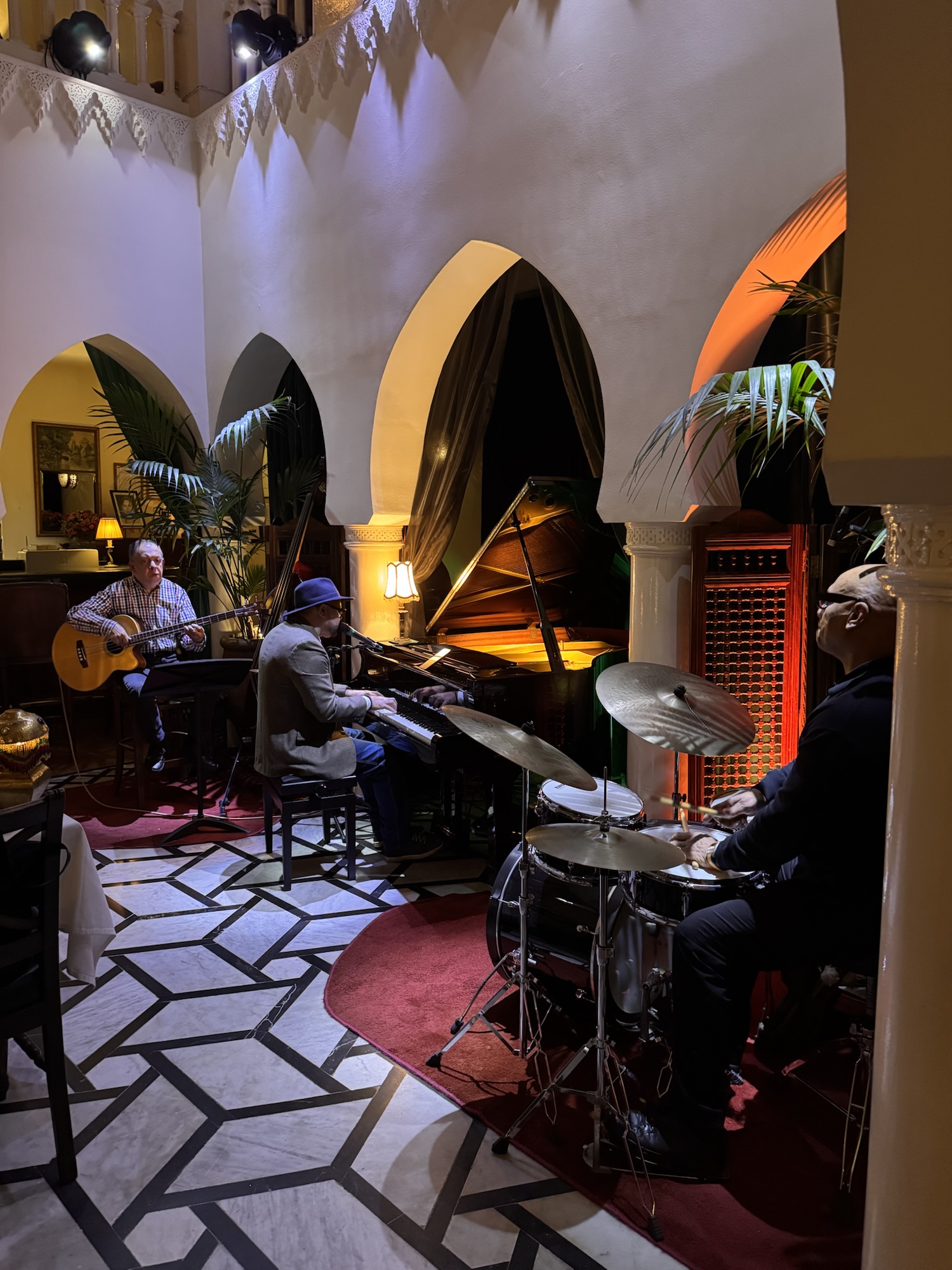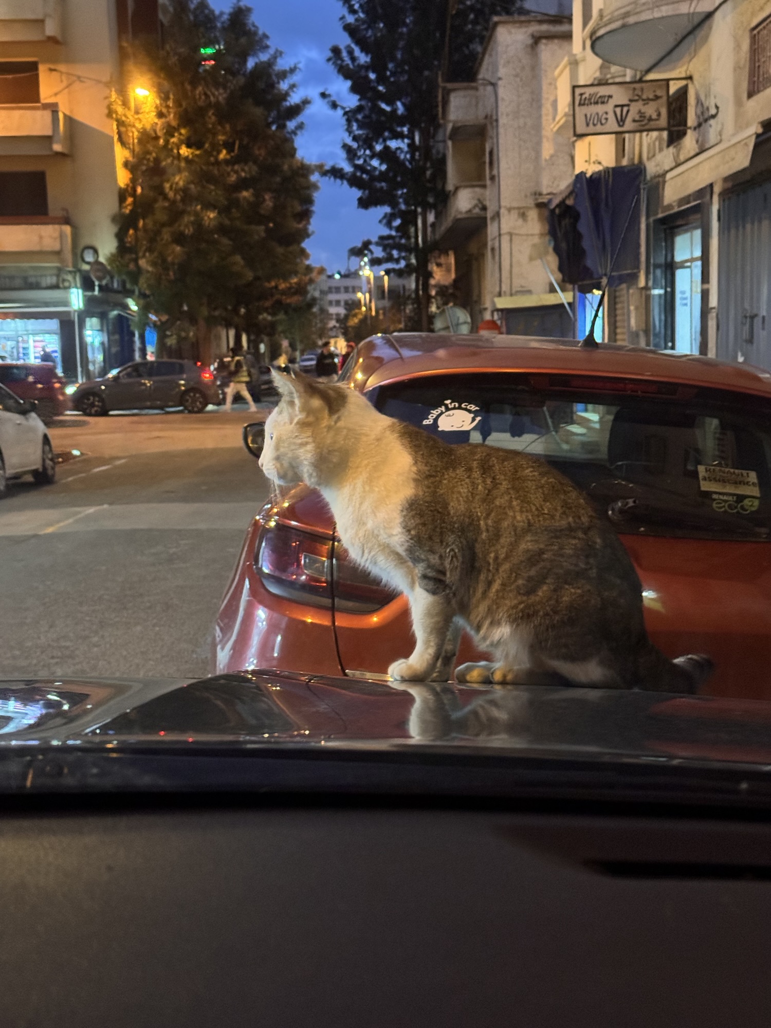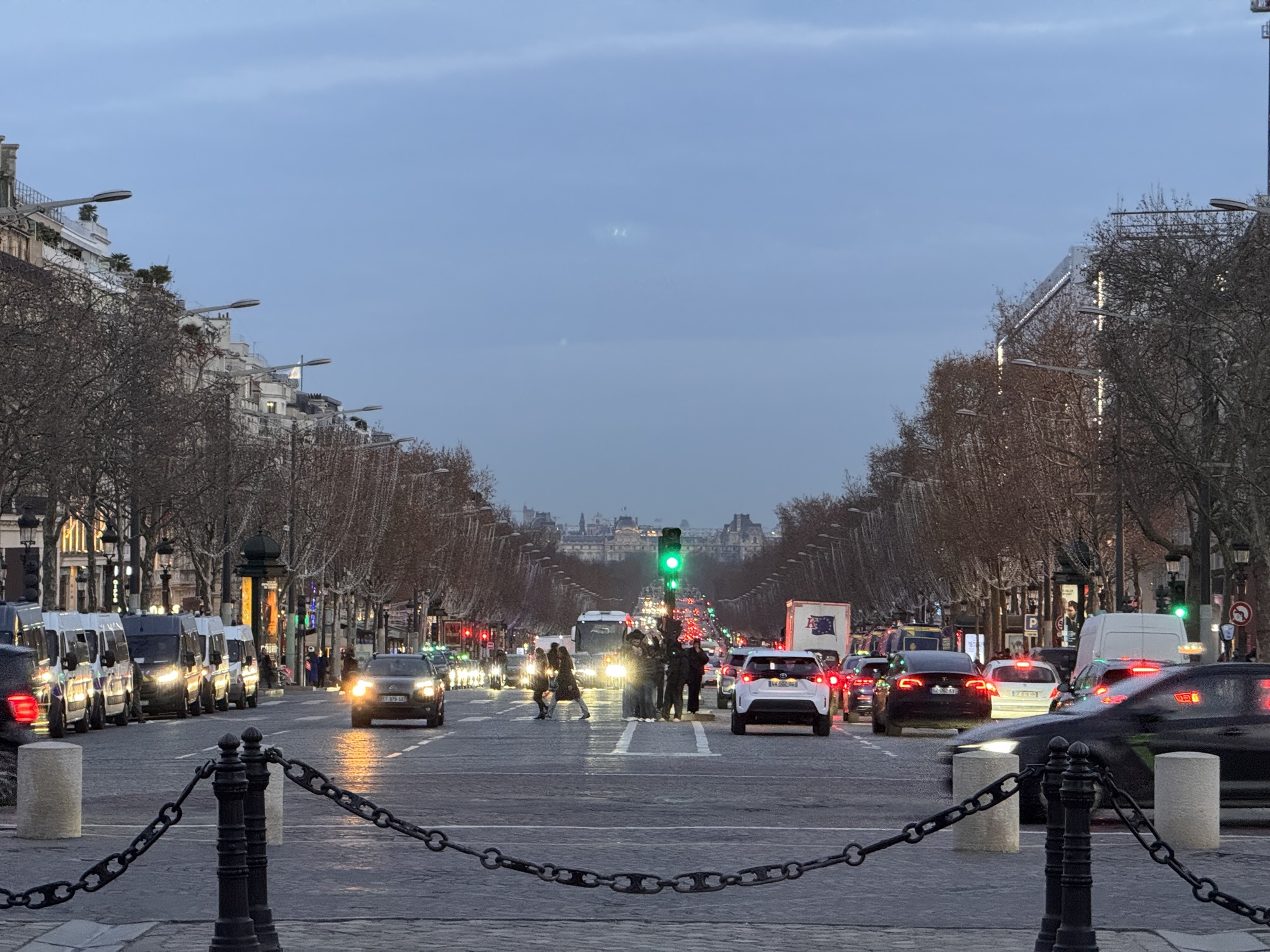 Also ein paar Fotos vom Eiffelturm, und dann wieder mit dem Bus zum Arc de Triomphe. Ich bin noch innerhalb der 90 Minuten, zu der die Karte berechtigt, und siehe da, es funktioniert. Der Kartenleser blippt freundlich und teilt mir mit: Fahrt ohne Berechnung. Fotos vom Triumphbogen erst im günstigen Licht des trüben Sonnenuntergangs, und danach in der blauen Stunde mit Beleuchtung. Der Verkehr auf dem Étoile ist überraschend ruhig und diszipliniert. Es bräuchte hier ein paar Taxifahrer aus Casablanca, das würde mehr Stimmung in die Bude bringen.