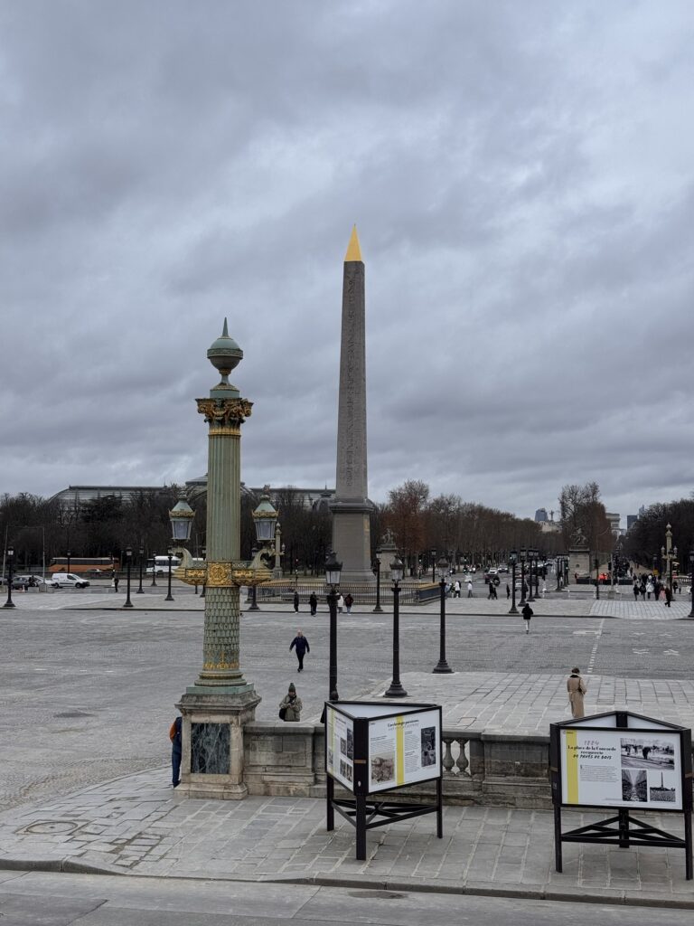 Mein Zug am Mittwoch geht um 15:55 – was mache ich mit dem Tagesfragment? Place du Vosges, ein Croissant mit einem Café au lait, und mit der Metro zum Place de la Concorde. Als Kind war ich sehr enttäuscht, dass der Platz nichts mit dem Flugzeug zu tun hat, nur blöde Brunnen und Säulen. ChatGPT hilft mir, dieses Manko zu heilen.